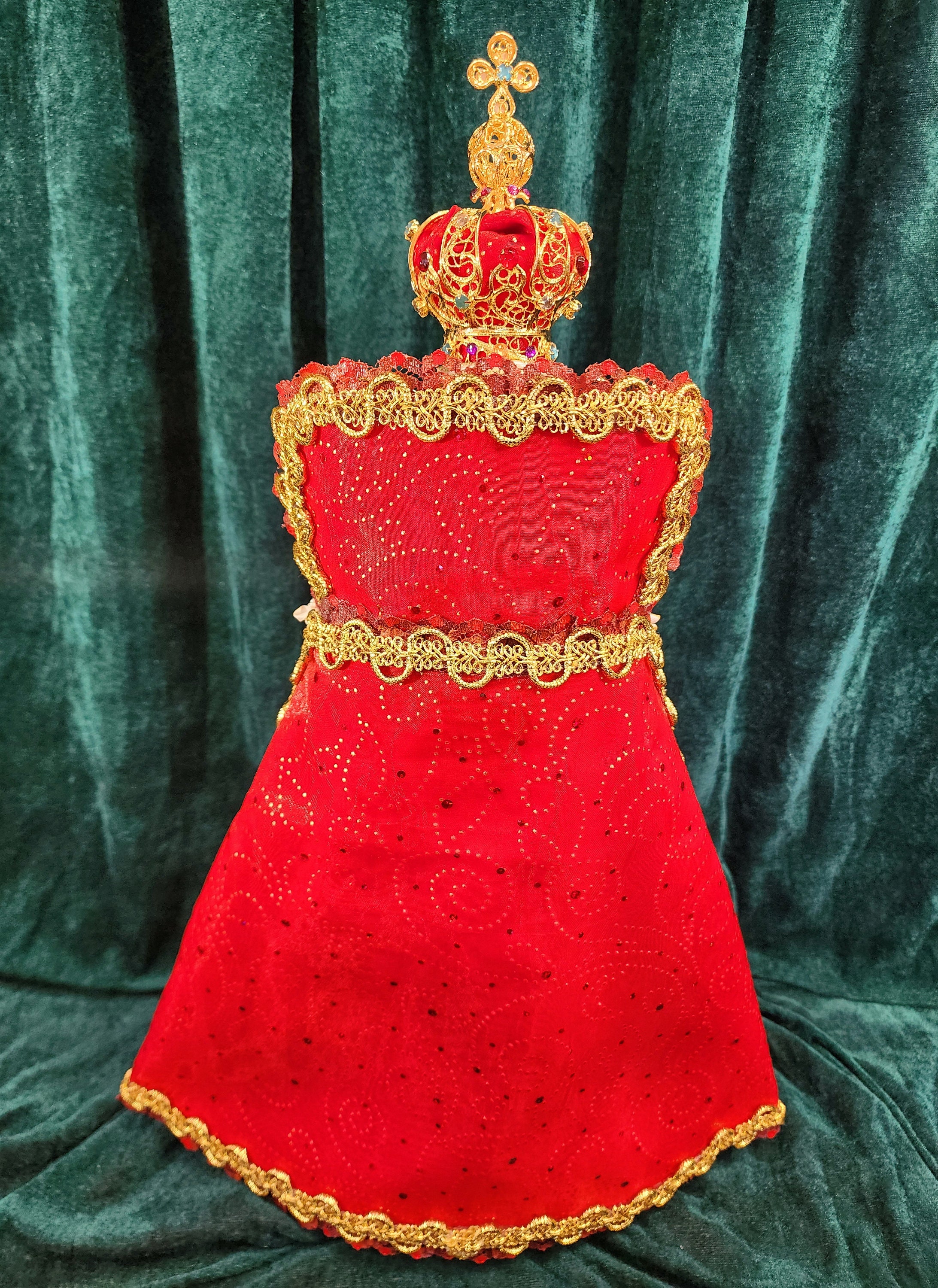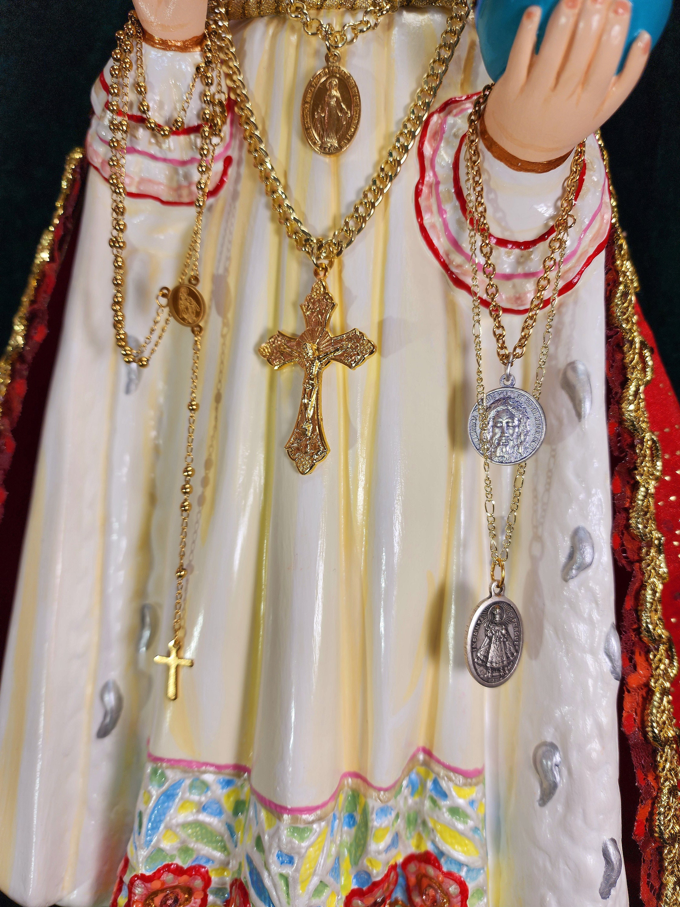This beautiful, handsome, lovely and fair 19" statue features an adorable hand painted face and details such as fingernails and eyelashes, bejeweled metal crown, gold lace-trimmed satin cloak, crucifix necklace and miraculous medal necklace around neck, rosary beads, etc. Also, included is a brown scapular to wear for protection. Crown is not detachable.
