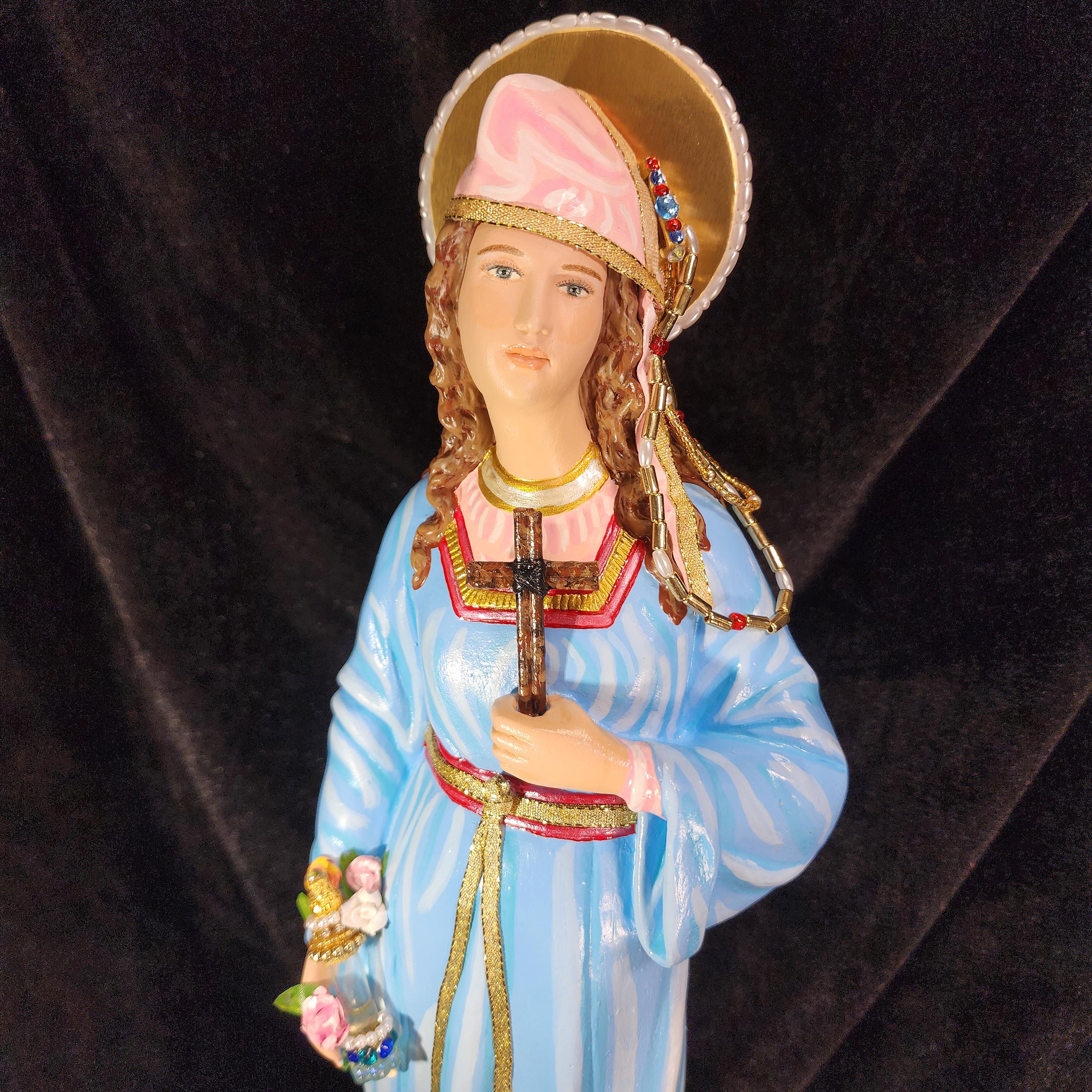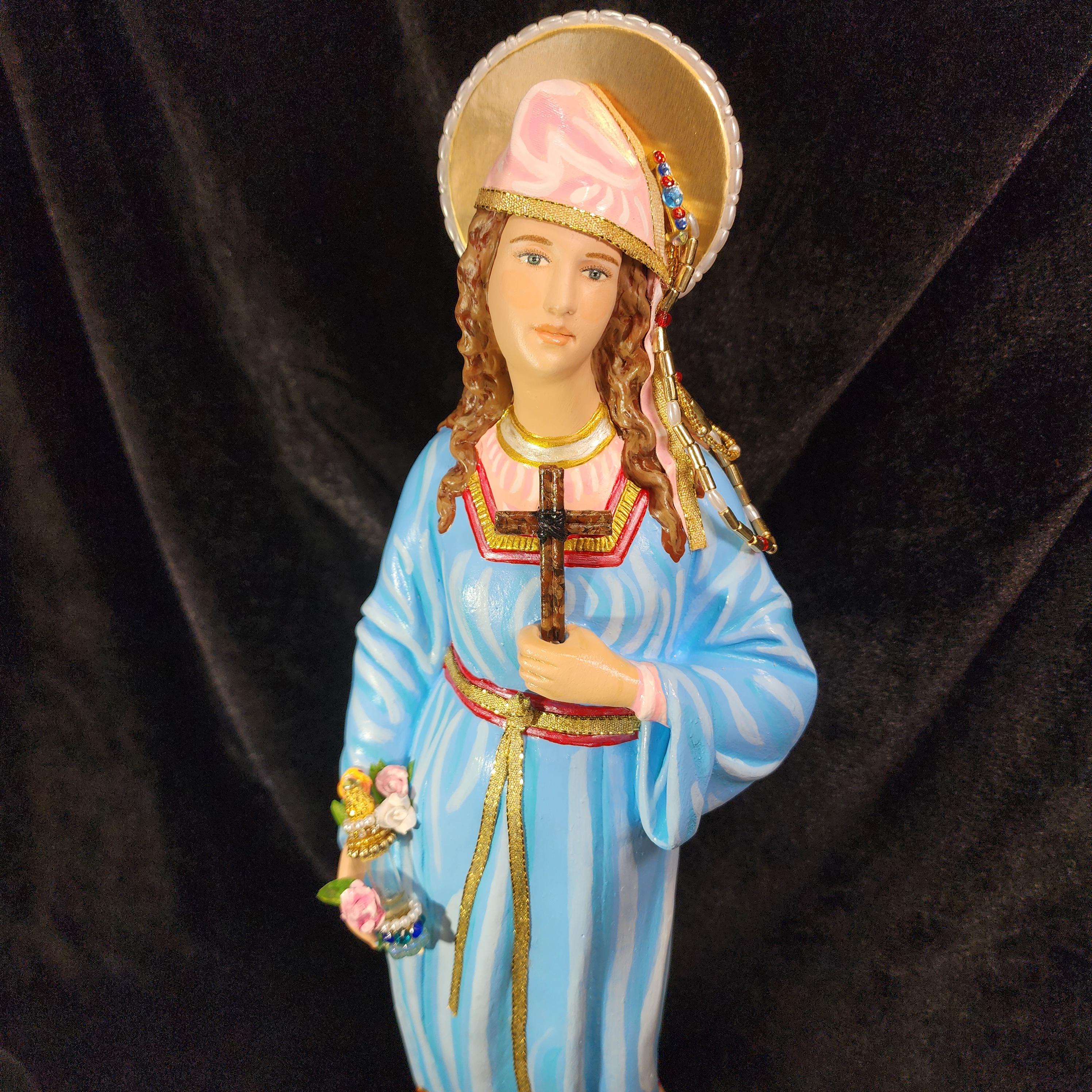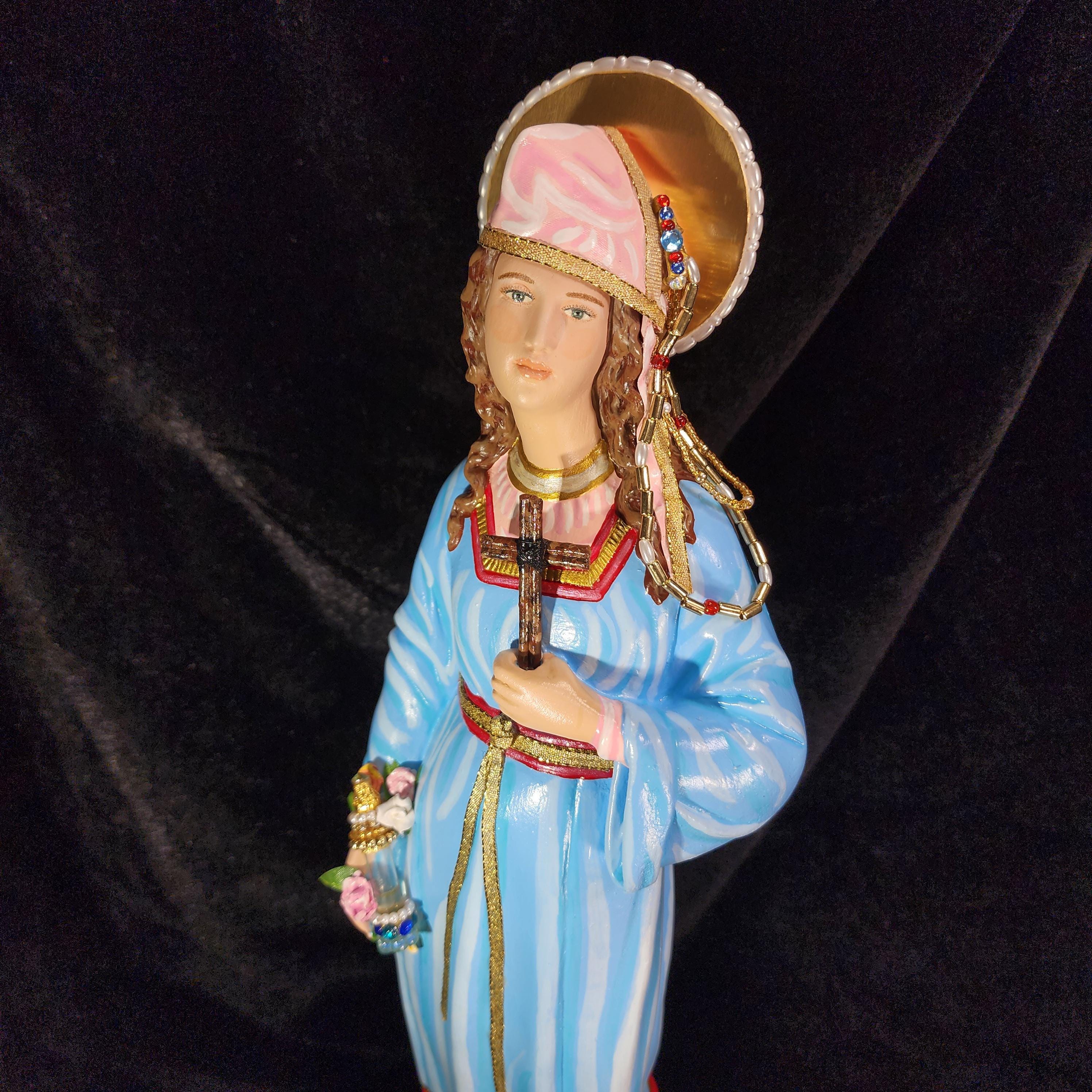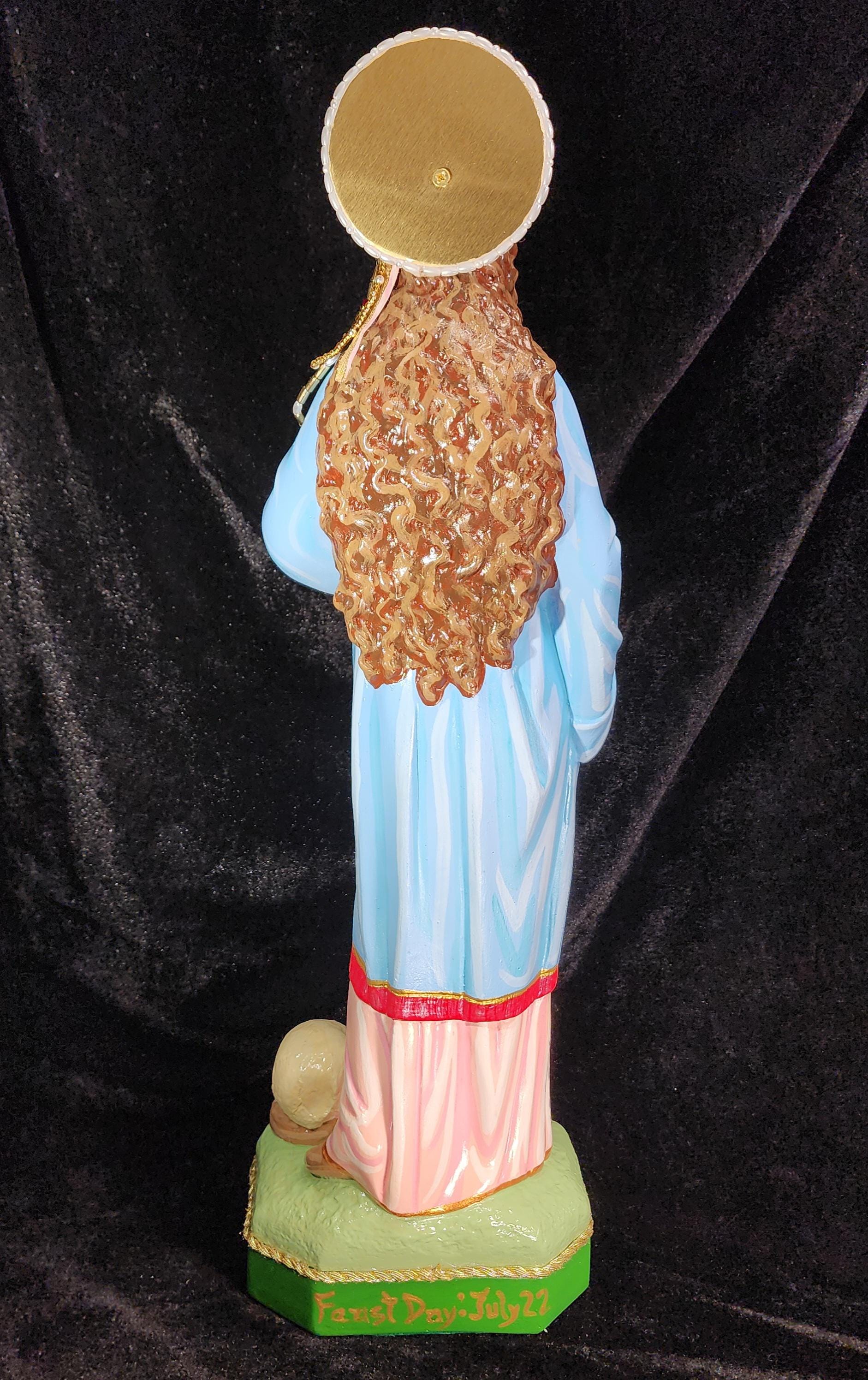This beautiful statue features an angelic hand painted face and details such as fingernails and eyelashes, cloth head dress, cloth flowers, jeweled vial of anointing oil in hand, cloth belt, wooden cross, Golgotha skull at feet, and golden halo.