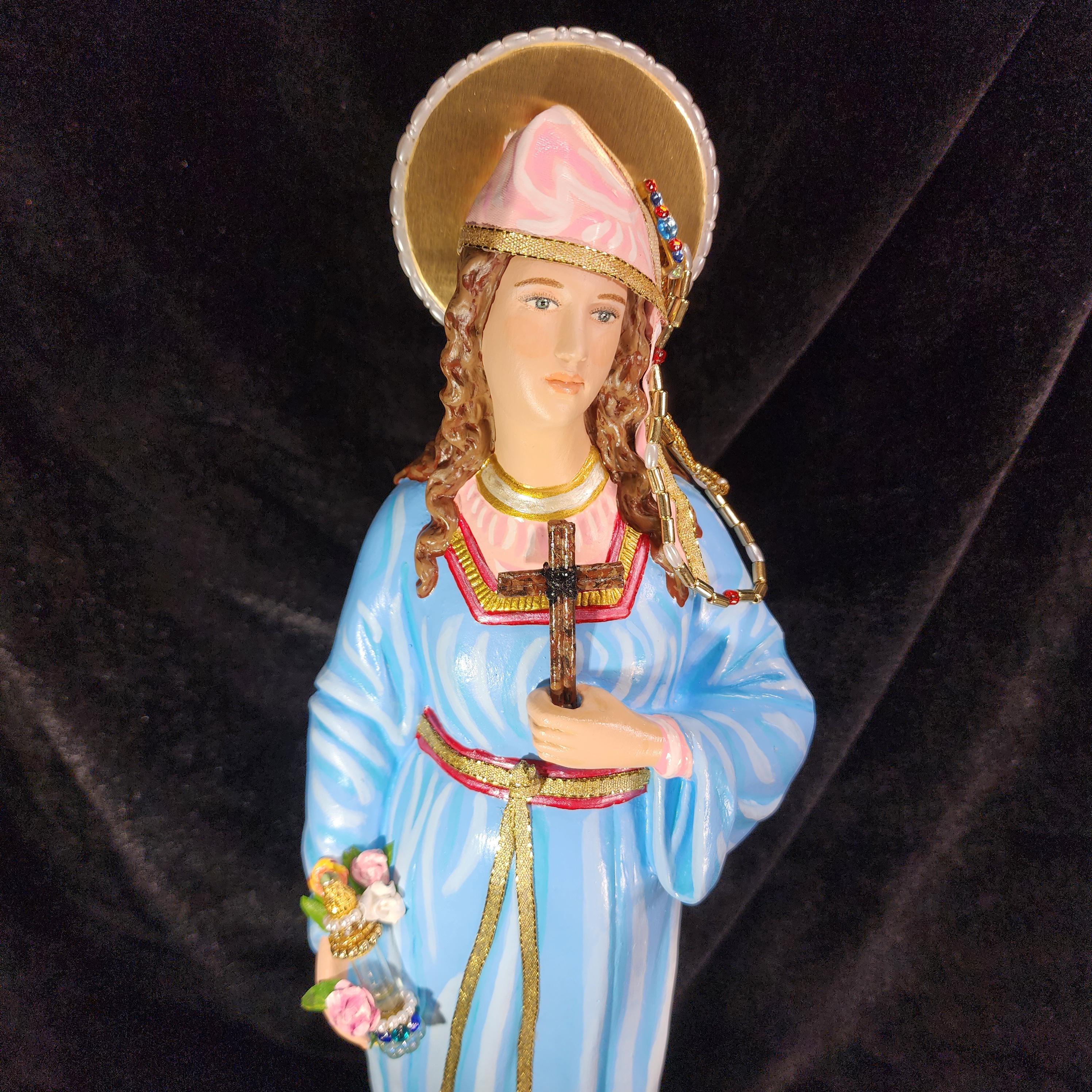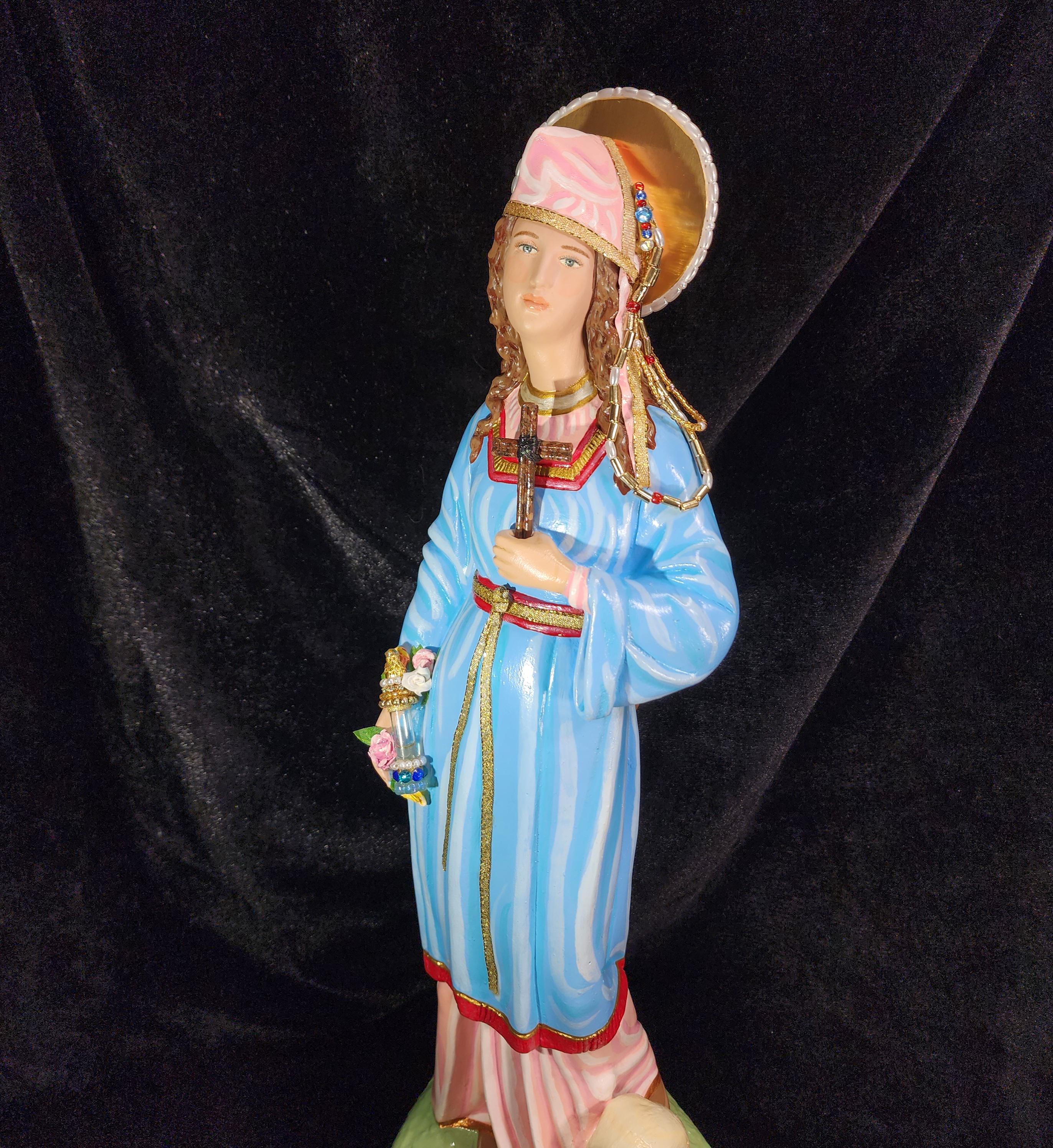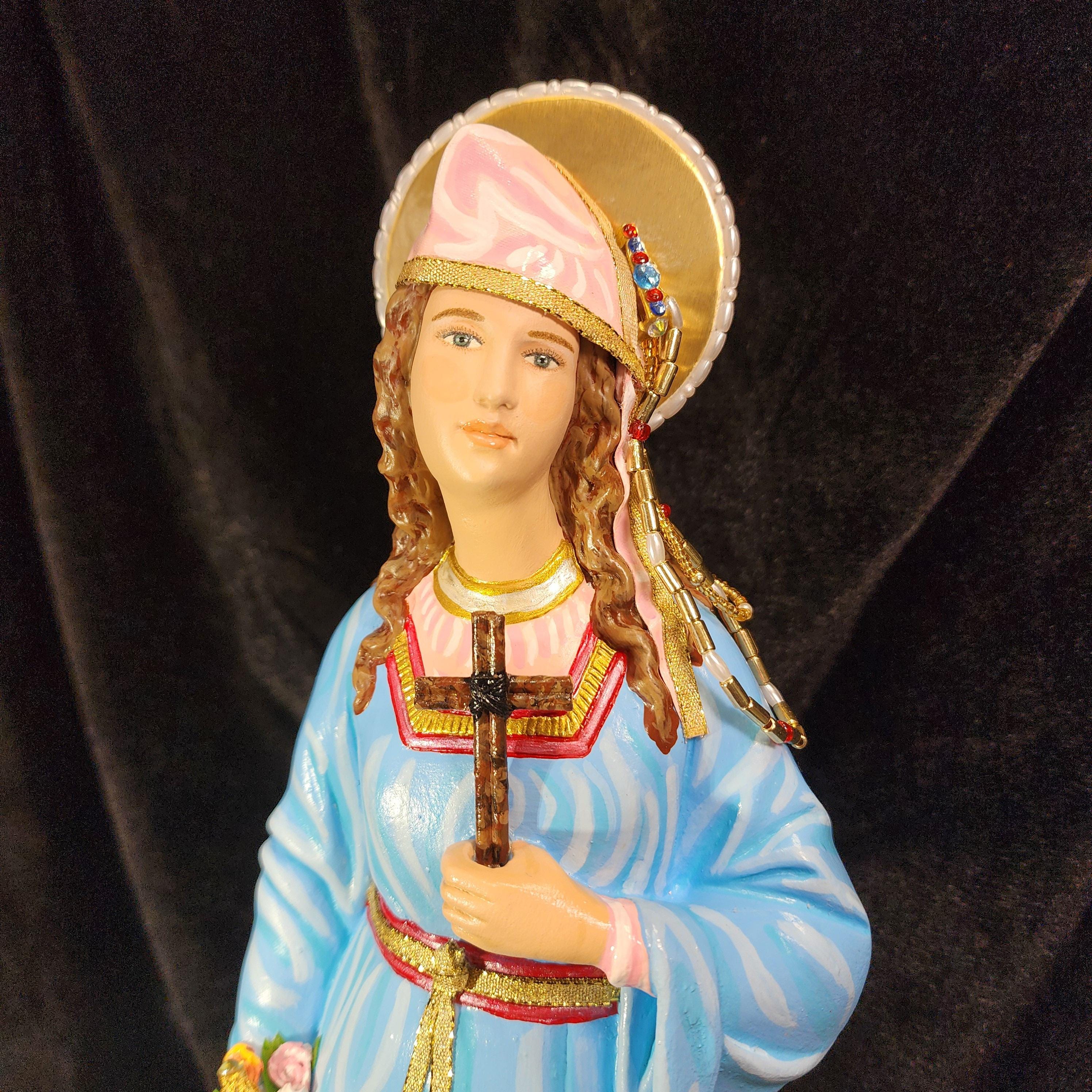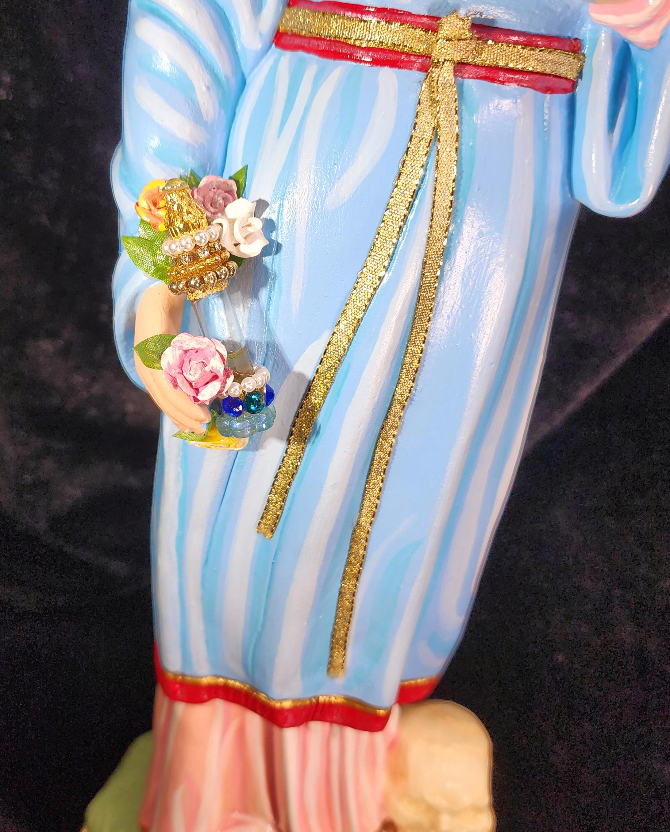 This beautiful statue features an angelic hand painted face and details such as fingernails and eyelashes, cloth head dress, cloth flowers, jeweled vial of anointing oil in hand, cloth belt, wooden cross, Golgotha skull at feet, and golden halo.