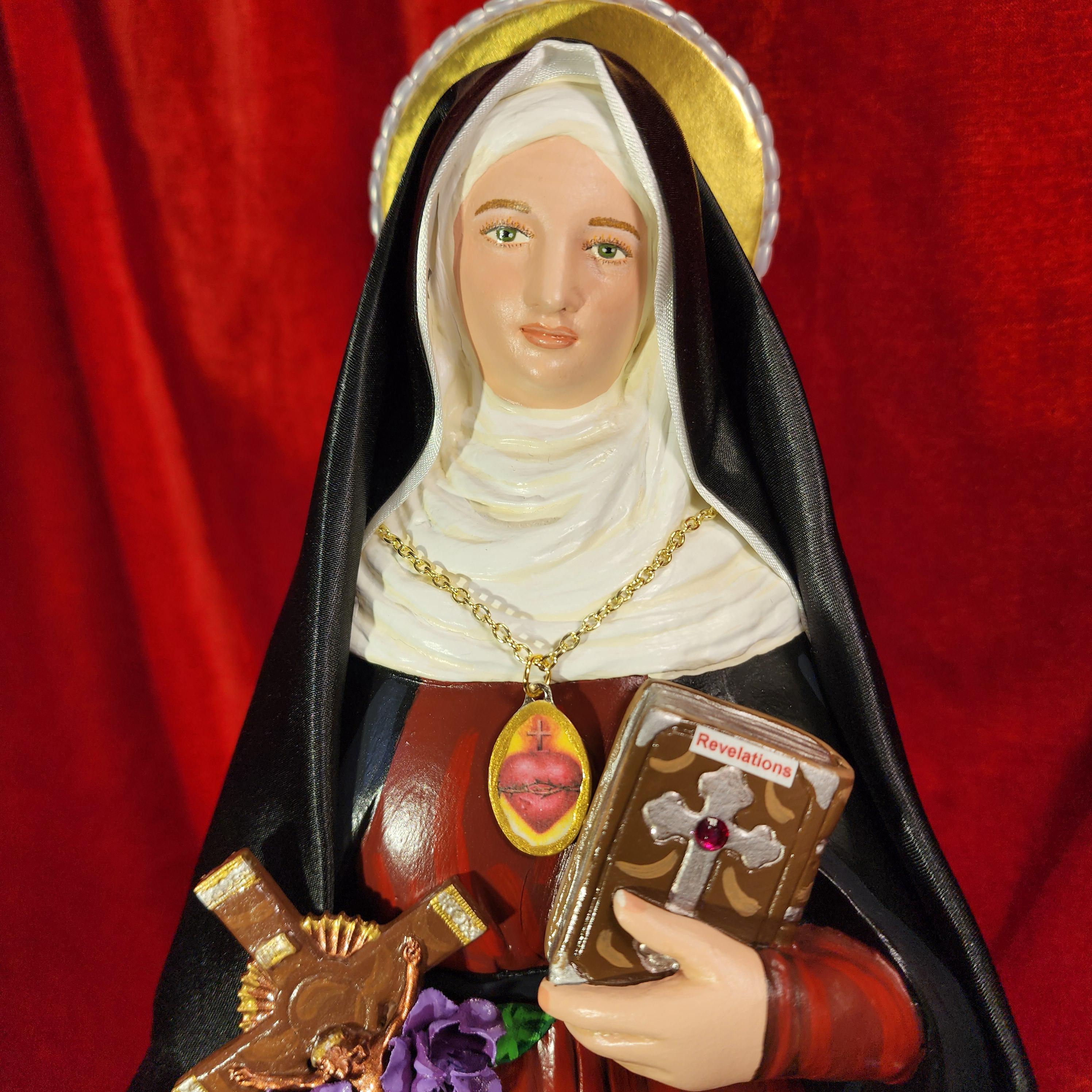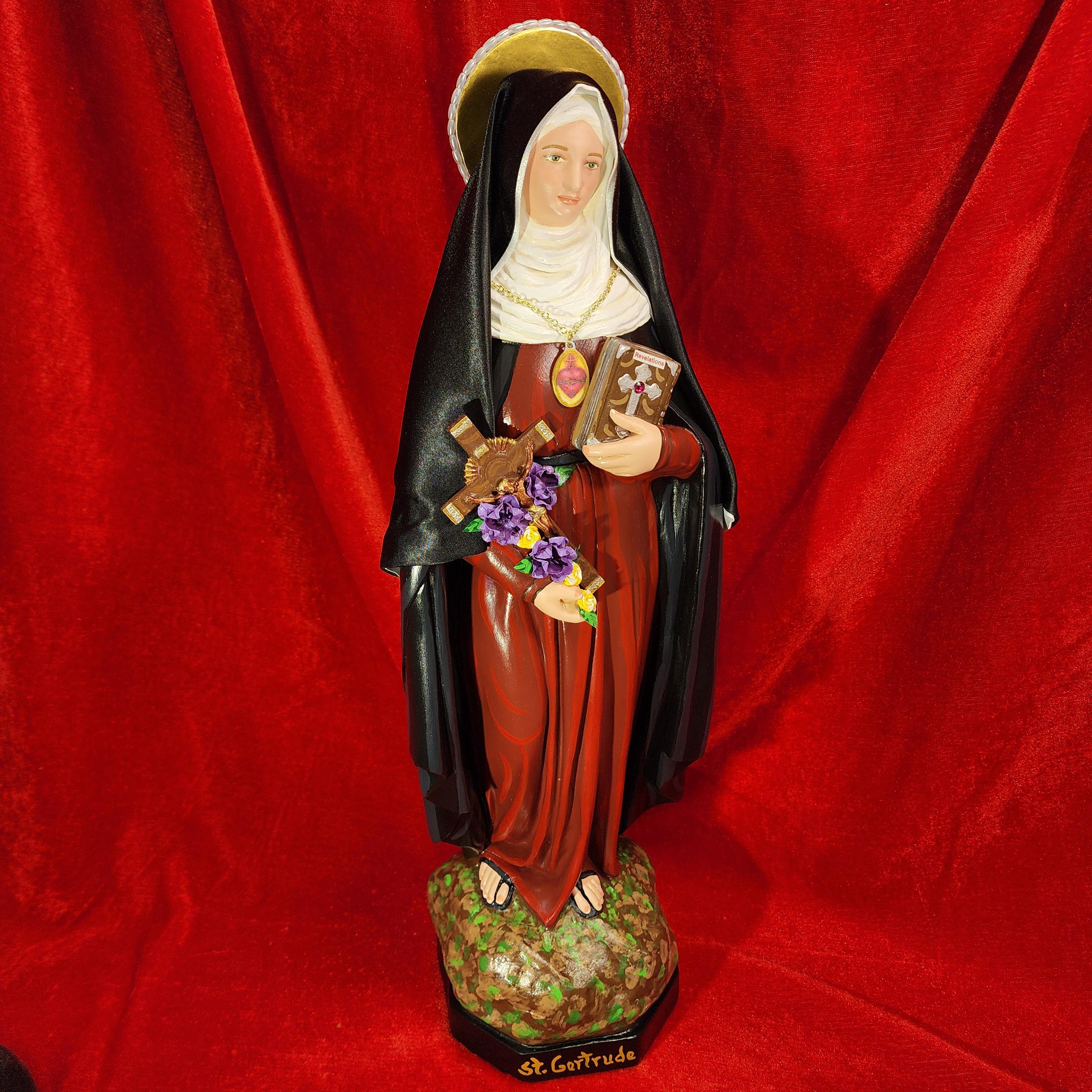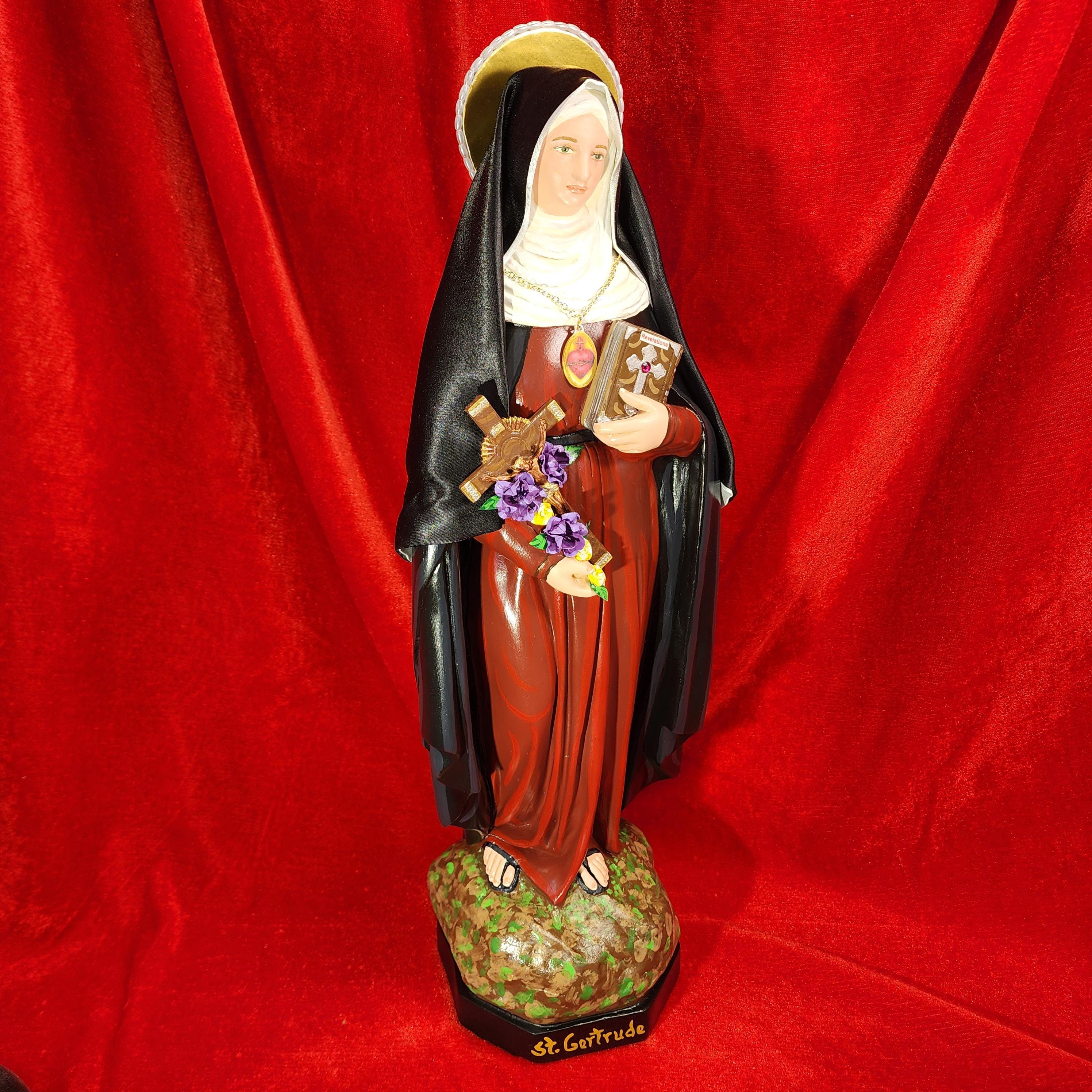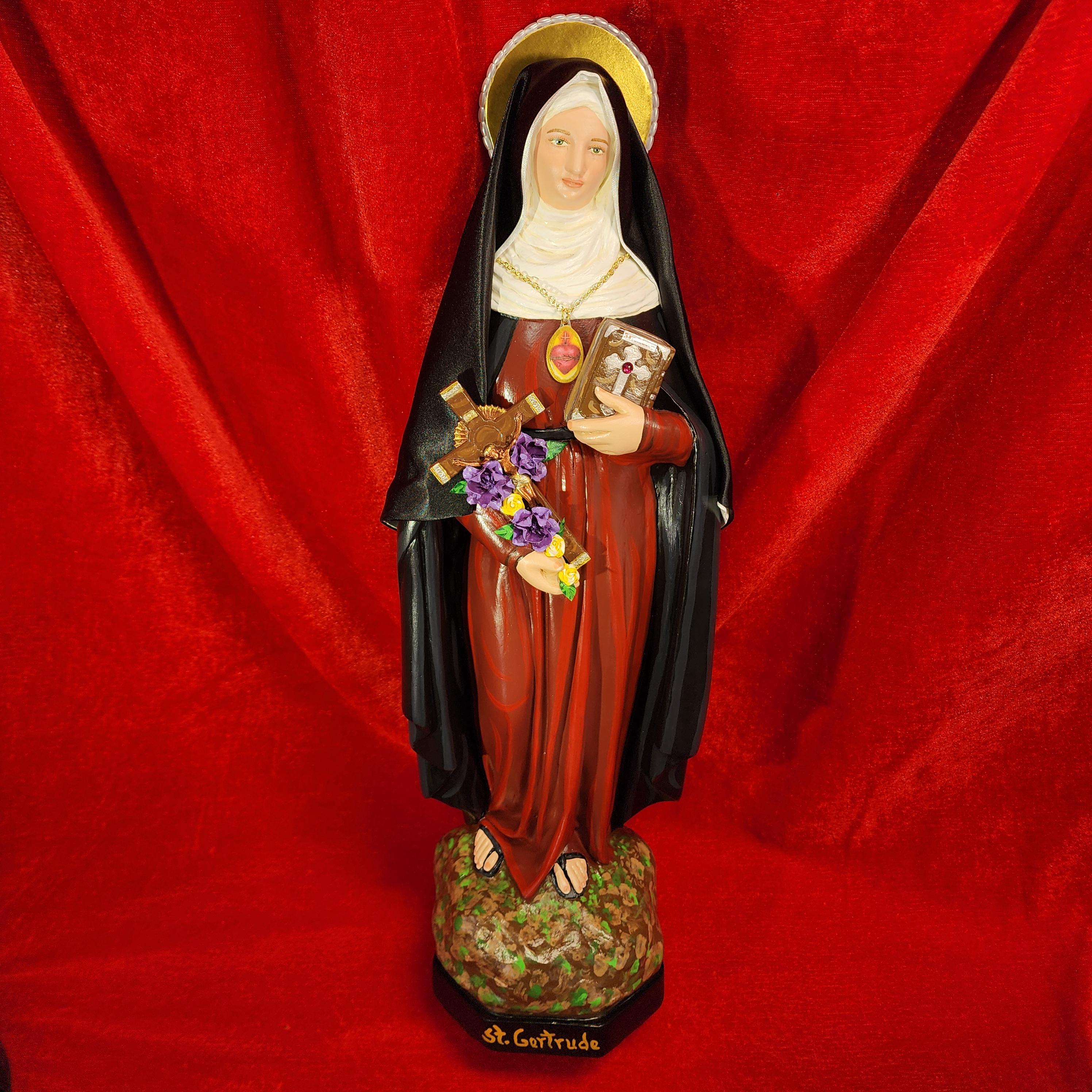 This statue features a divinely blissful hand painted face and details such as fingernails and eyelashes. She holds a crucifix arrayed with cloth flowers in one arm and her book of graces titled “Revelations” in the other. A medallion of the Sacred Heart hangs at her chest. St. Gertrude also comes with a black satin/cloth veil.