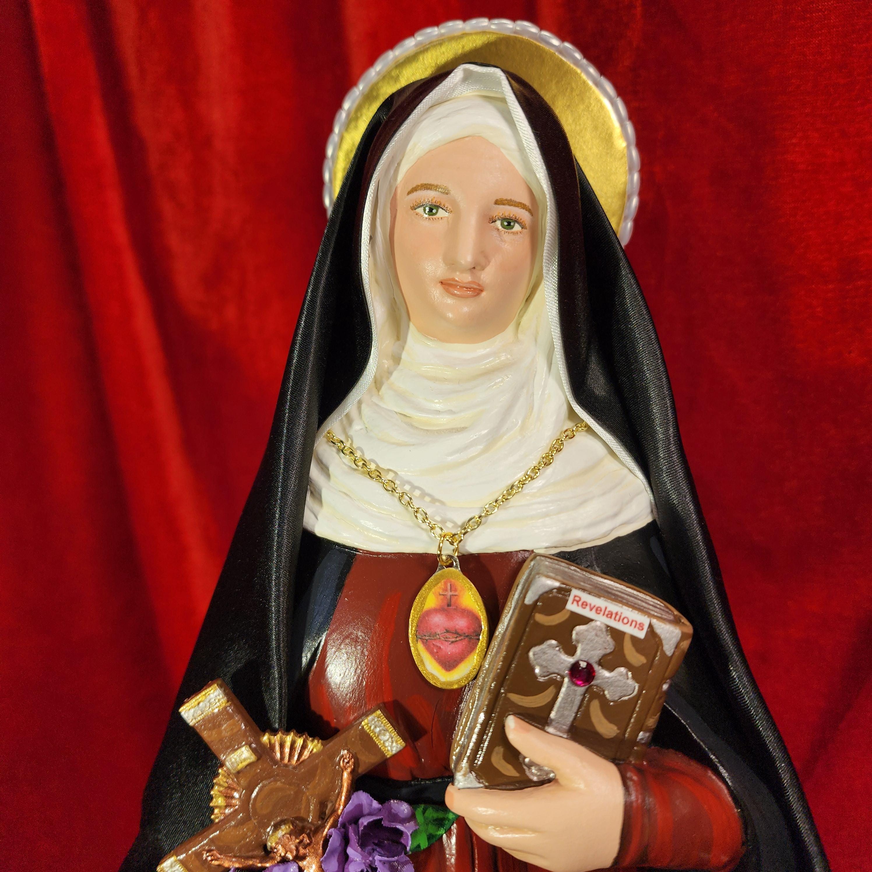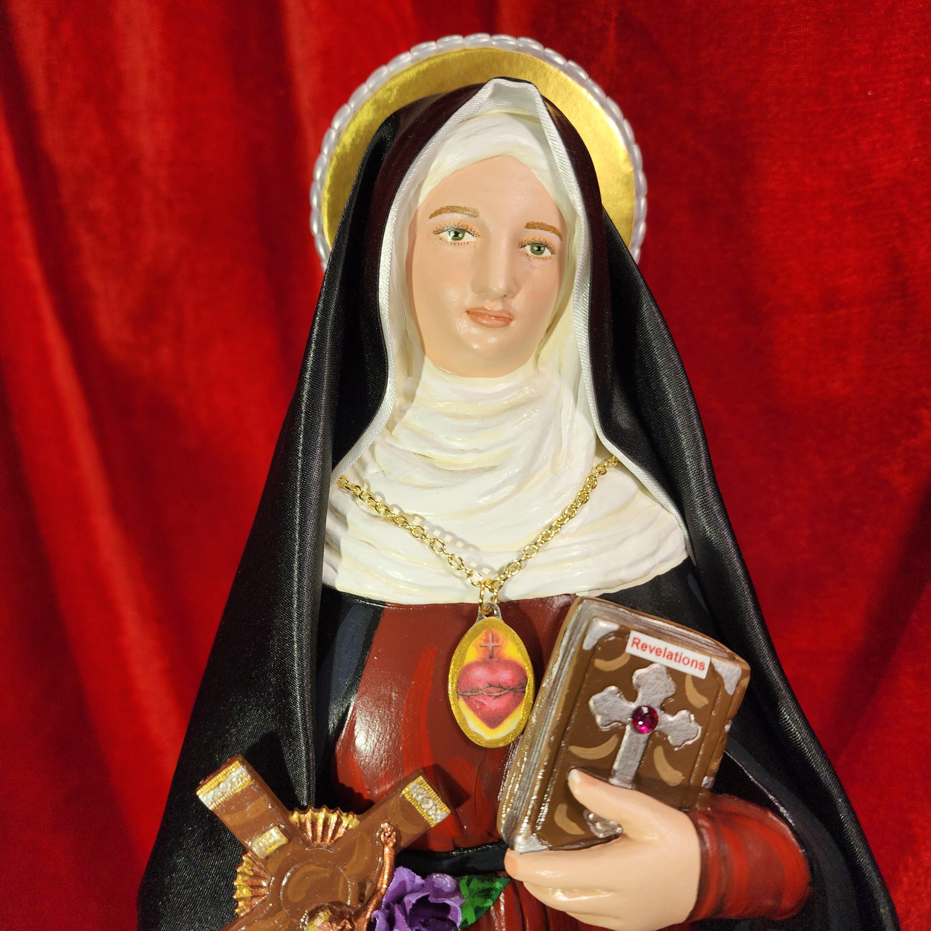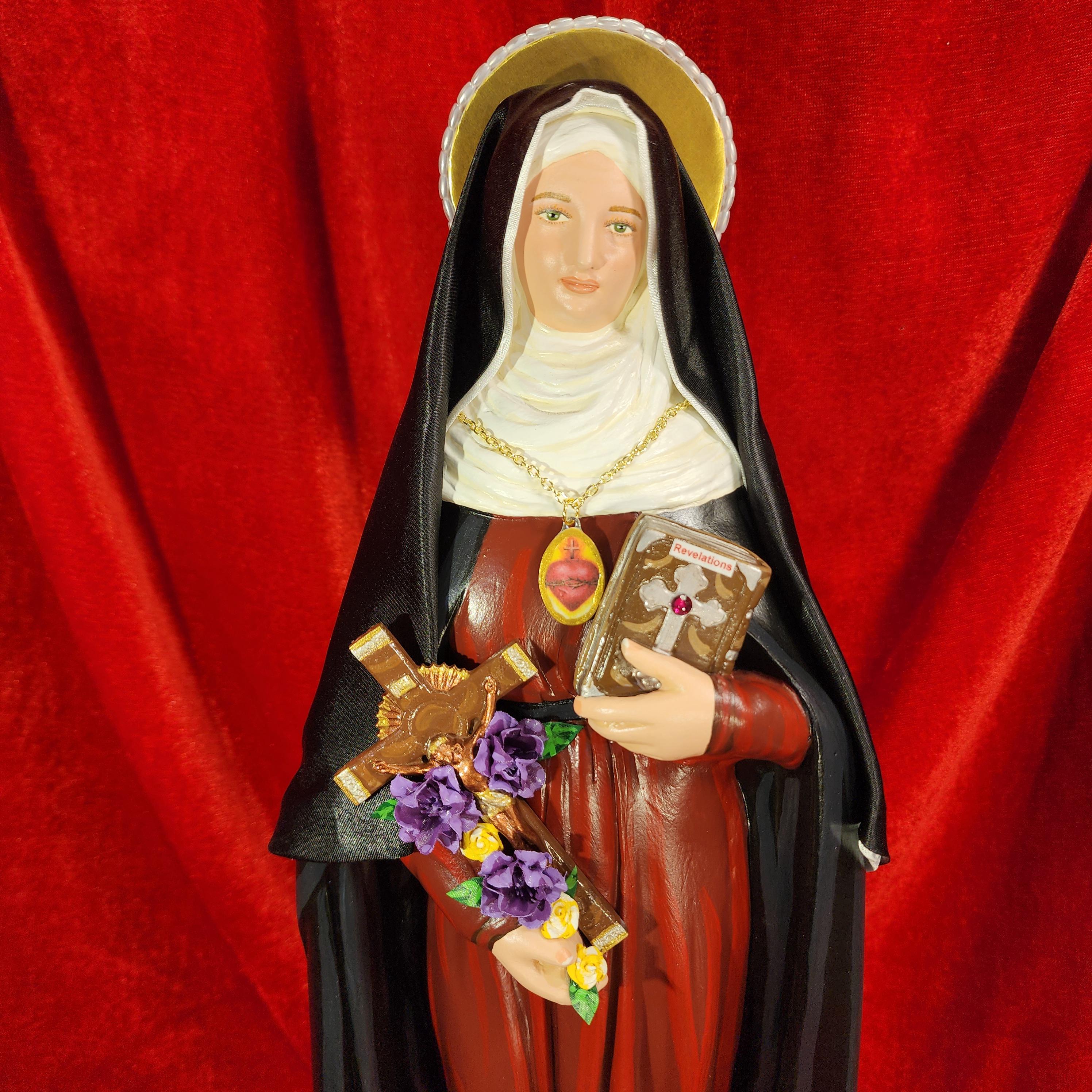 This statue features a divinely blissful hand painted face and details such as fingernails and eyelashes. She holds a crucifix arrayed with cloth flowers in one arm and her book of graces titled “Revelations” in the other. A medallion of the Sacred Heart hangs at her chest. St. Gertrude also comes with a black satin/cloth veil.
