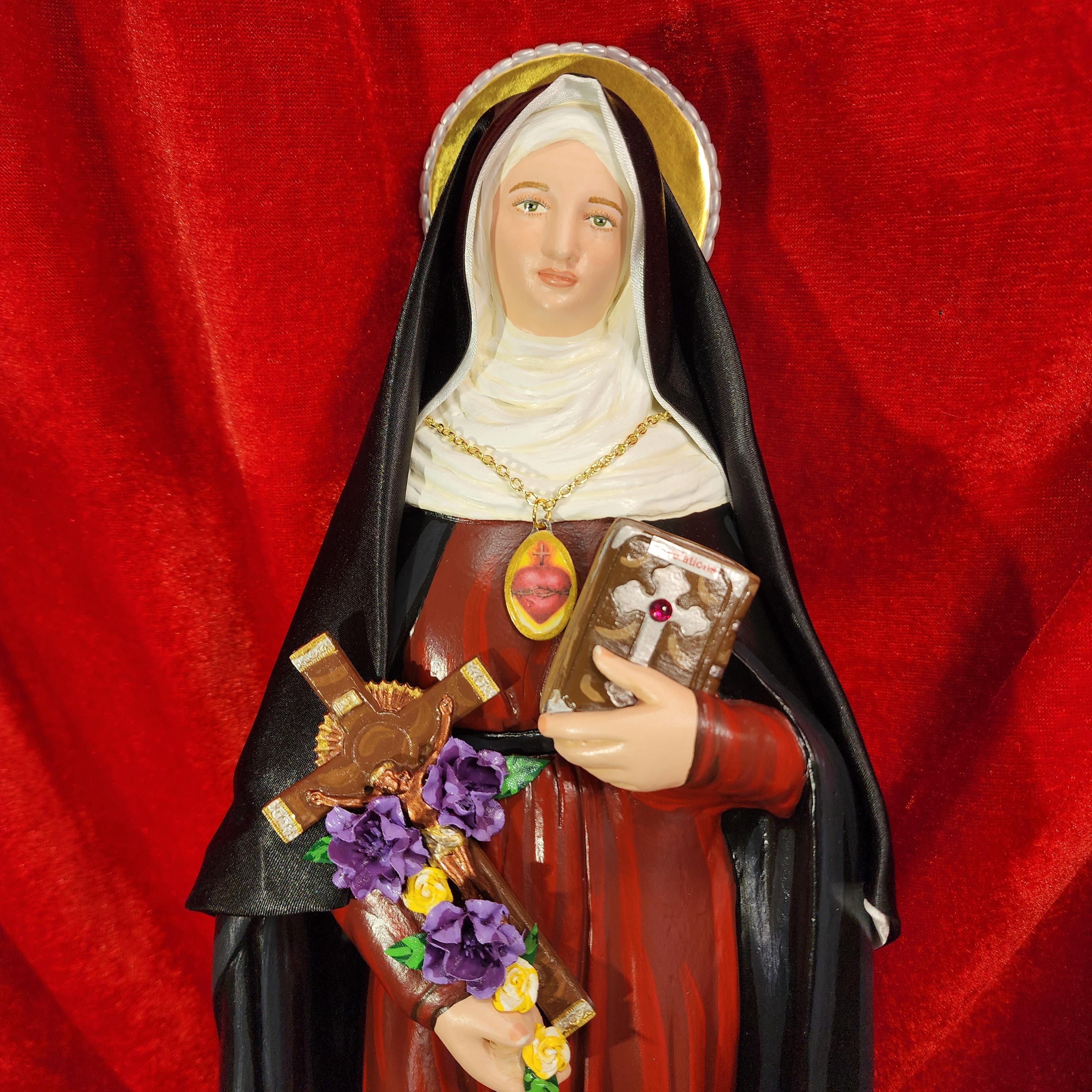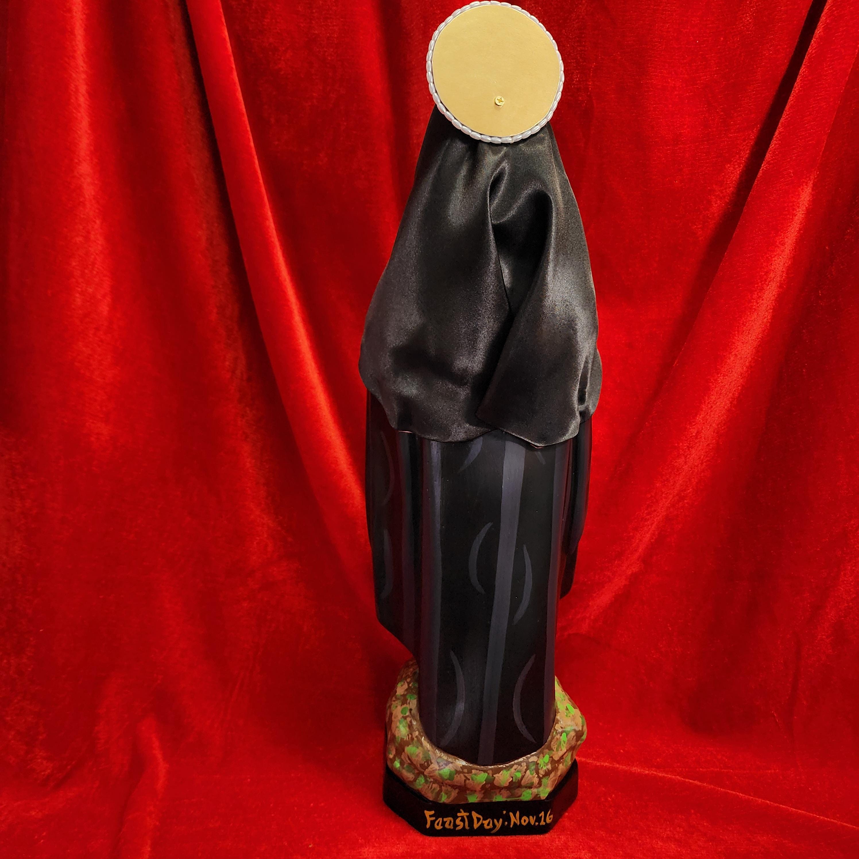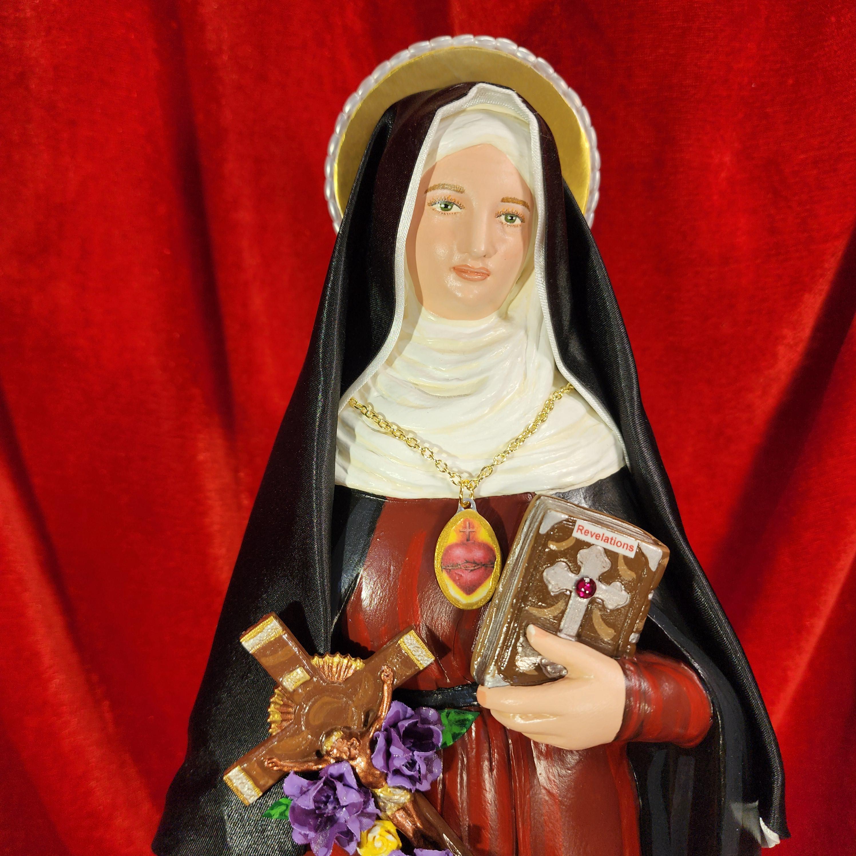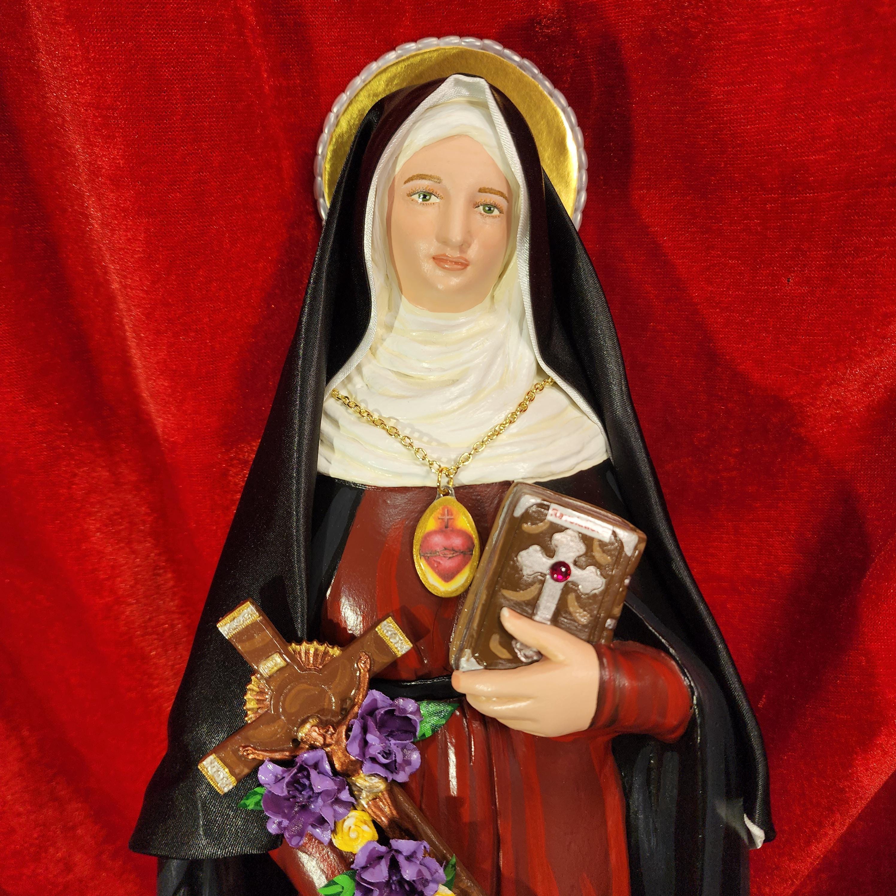 This statue features a divinely blissful hand painted face and details such as fingernails and eyelashes. She holds a crucifix arrayed with cloth flowers in one arm and her book of graces titled “Revelations” in the other. A medallion of the Sacred Heart hangs at her chest. St. Gertrude also comes with a black satin/cloth veil.