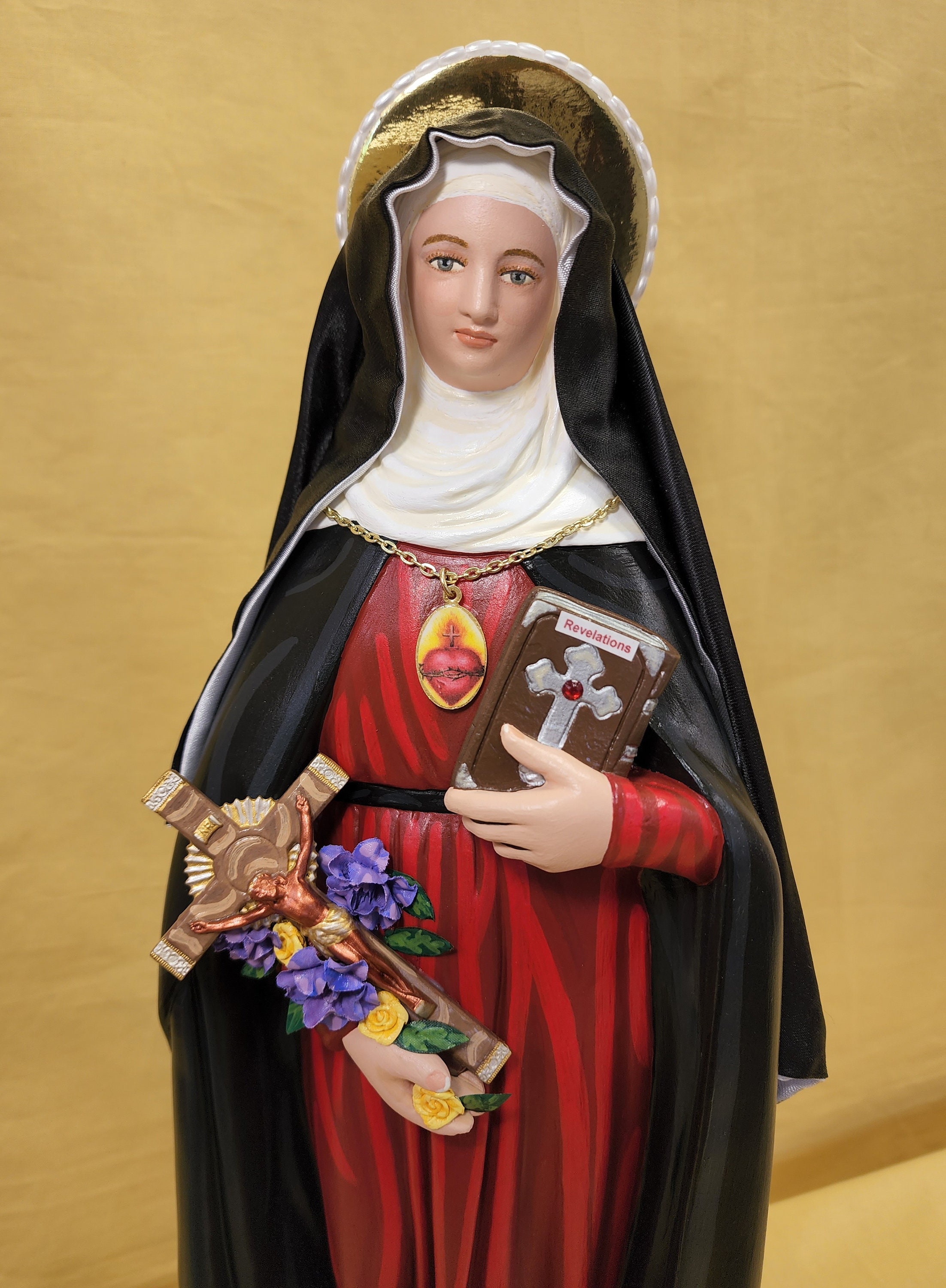 This statue features a divinely blissful hand painted face and details such as fingernails and eyelashes. She holds a crucifix arrayed with cloth flowers in one arm and her book of graces titled “Revelations” in the other. A medallion of the Sacred Heart hangs at her chest. St. Gertrude also comes with a cloth/black satin veil. She can be painted with a maroon dress or black dress. Please let us know. Years ago someone asked us to make a statue of St. Gertrude for her and she requested a maroon dress/habit. St. Gertrude is sometimes depicted wearing a maroon dress in art. Although, she was a Benedictine nun, and their habit/dress is usually black.