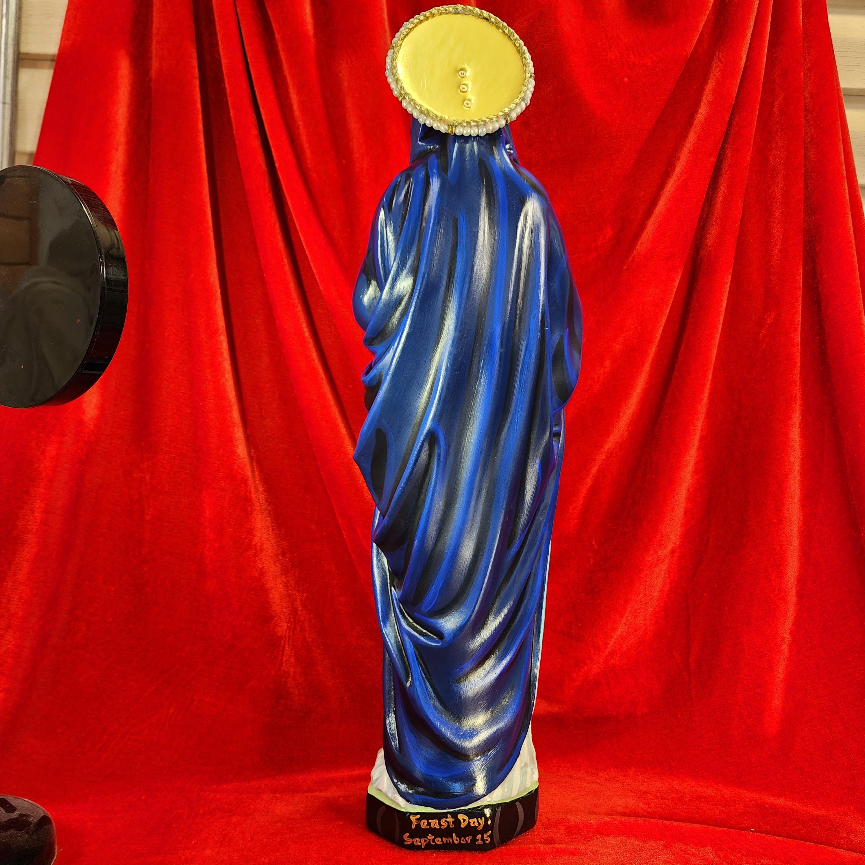 This touching statue features an inspiring hand painted face and details such as fingernails and eyelashes, tears flowing from Our Lady’s eyes, and seven swords piercing her heart. In her cupped hands she holds a hand made crown of thorns and three bloodied nails the implements of her Son’s torture and death. This is a beautiful handcrafted statue with a lot of detail. Please let us know if you would prefer the title of her name, painted at the bottom of the statue, to read: