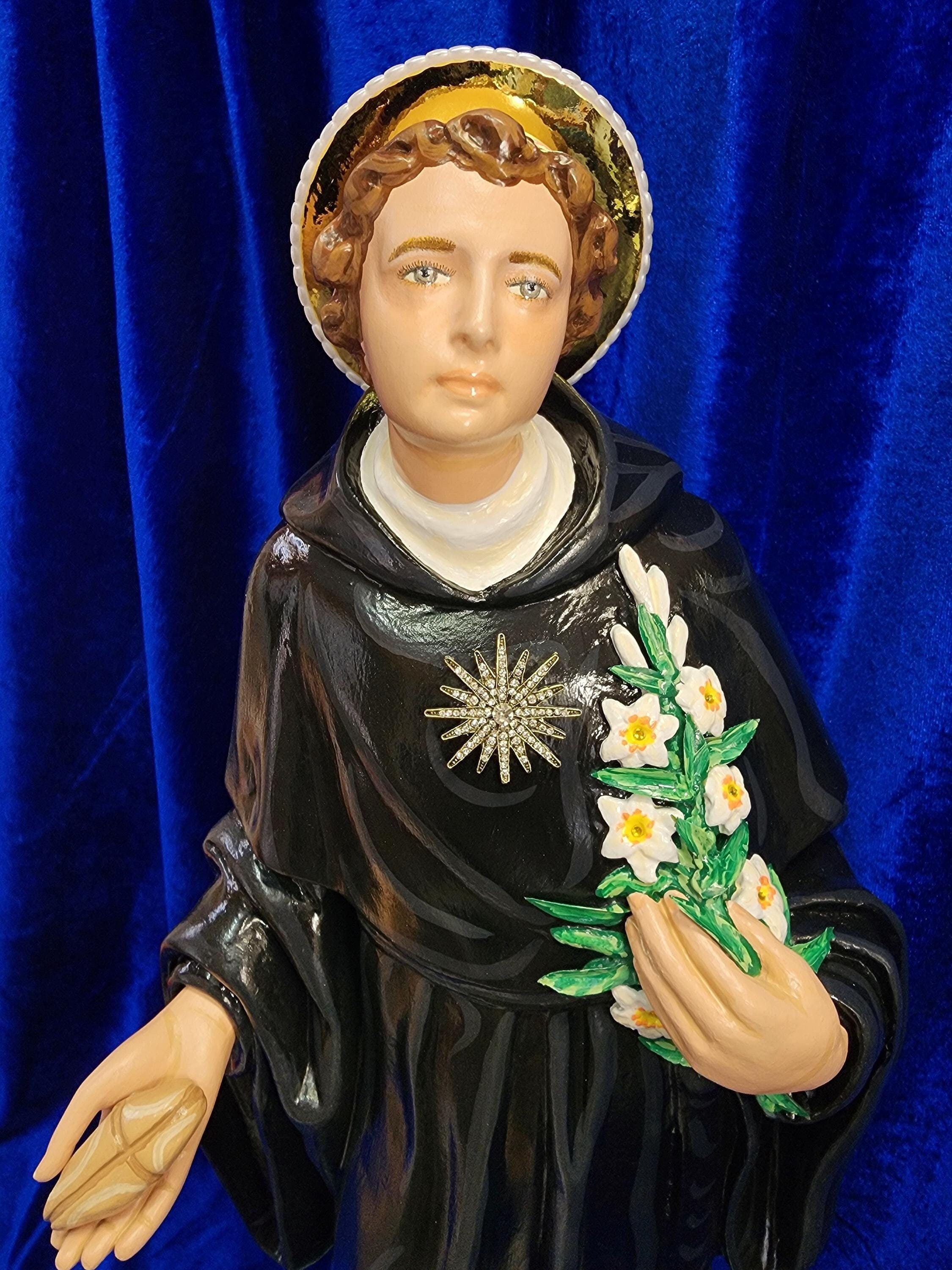 This handsome 26" statue features a hand painted face and details such as fingernails and eyelashes. Also comes with a golden halo attached to the back of his head. He holds a handmade loaf of St. Nicholas blessed bread in right hand, the lilies of purity (with some cloth leaves) in left hand. The guiding star/starburst shines on his chest (let us know if you want the gold style or silver style starburst). In art he is sometimes depicted with a star/starburst on his chest. St. Nicholas will also come with a black satin fabric cloak.