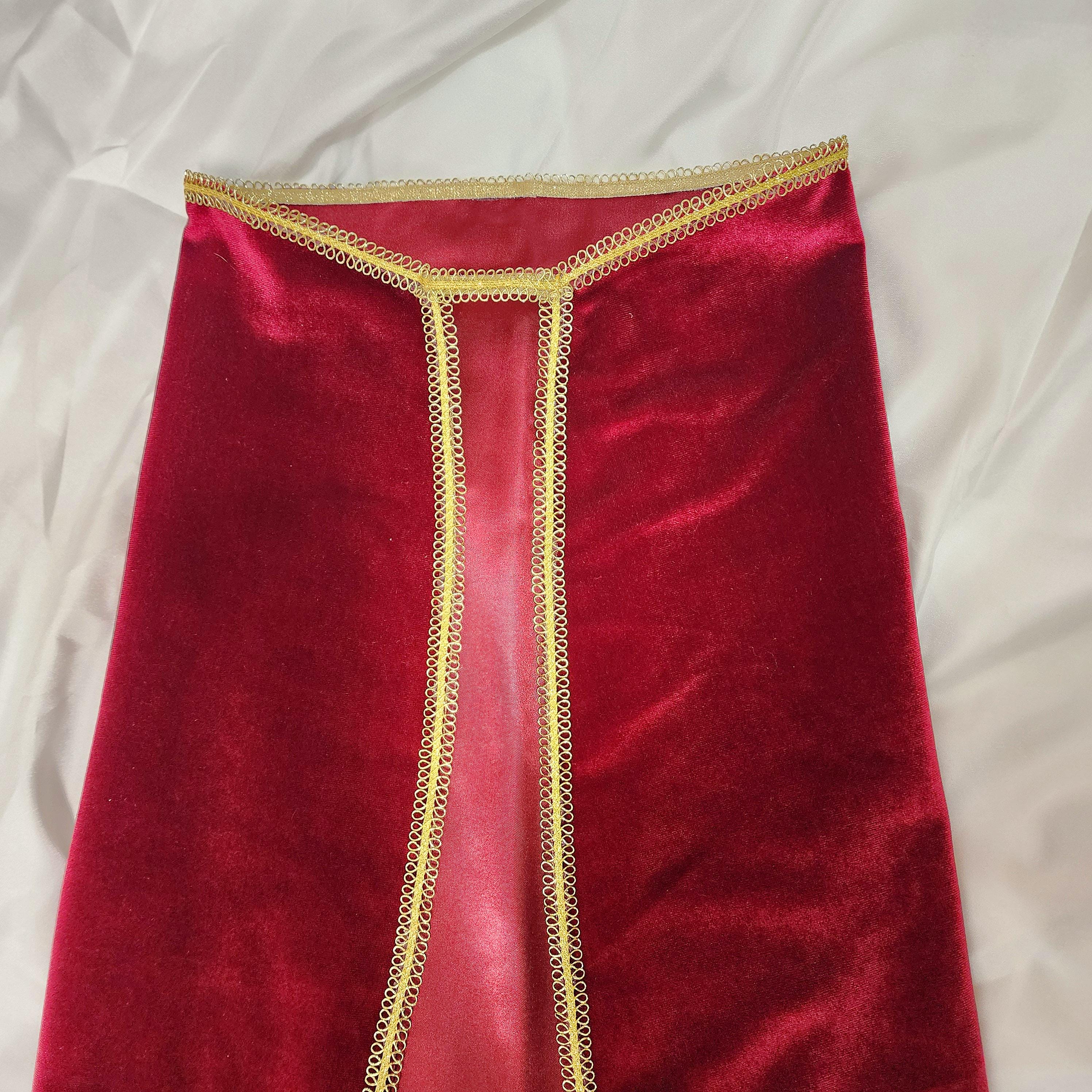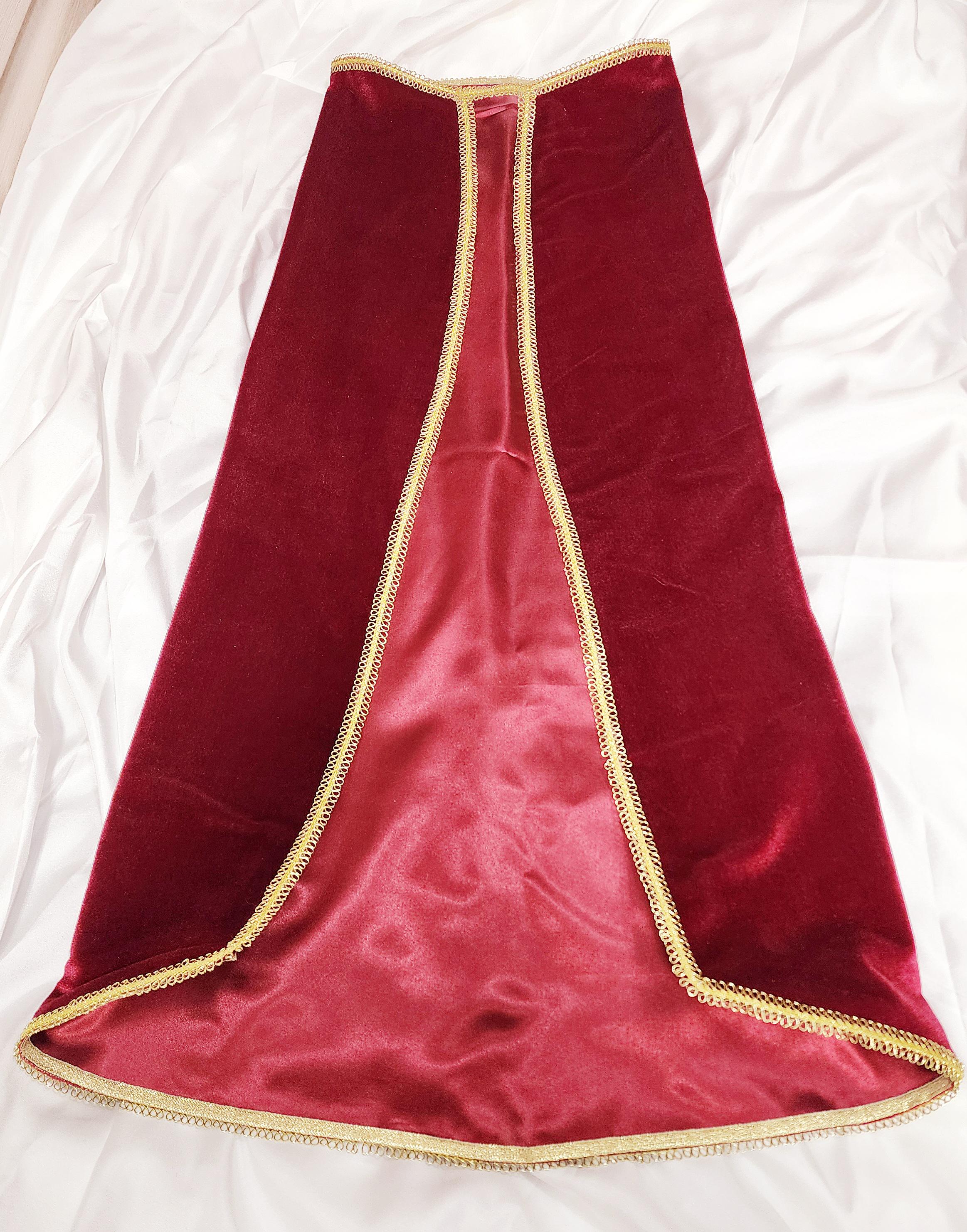 THE CLOAK IS PURPLE WITH A SCARLET/RED LINING AND SILVER TRIM ON BOTH THE INSIDE AND OUTSIDE EDGES OF THE CLOAK. THE CLOAK IS REVERSIBLE.