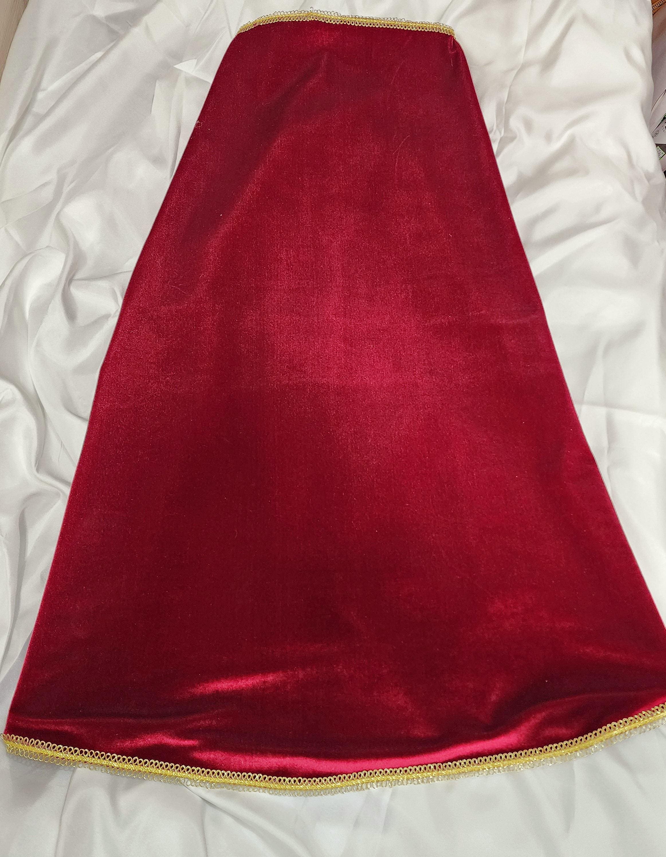 The newest version is DARK BURGUNDY VELVET fabric together with BURGUNDY SATIN fabric and gold trim (reversible).
