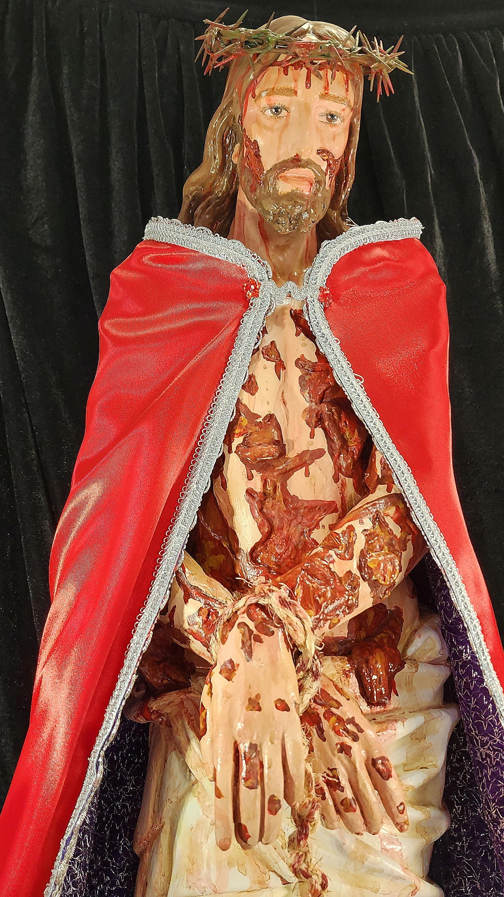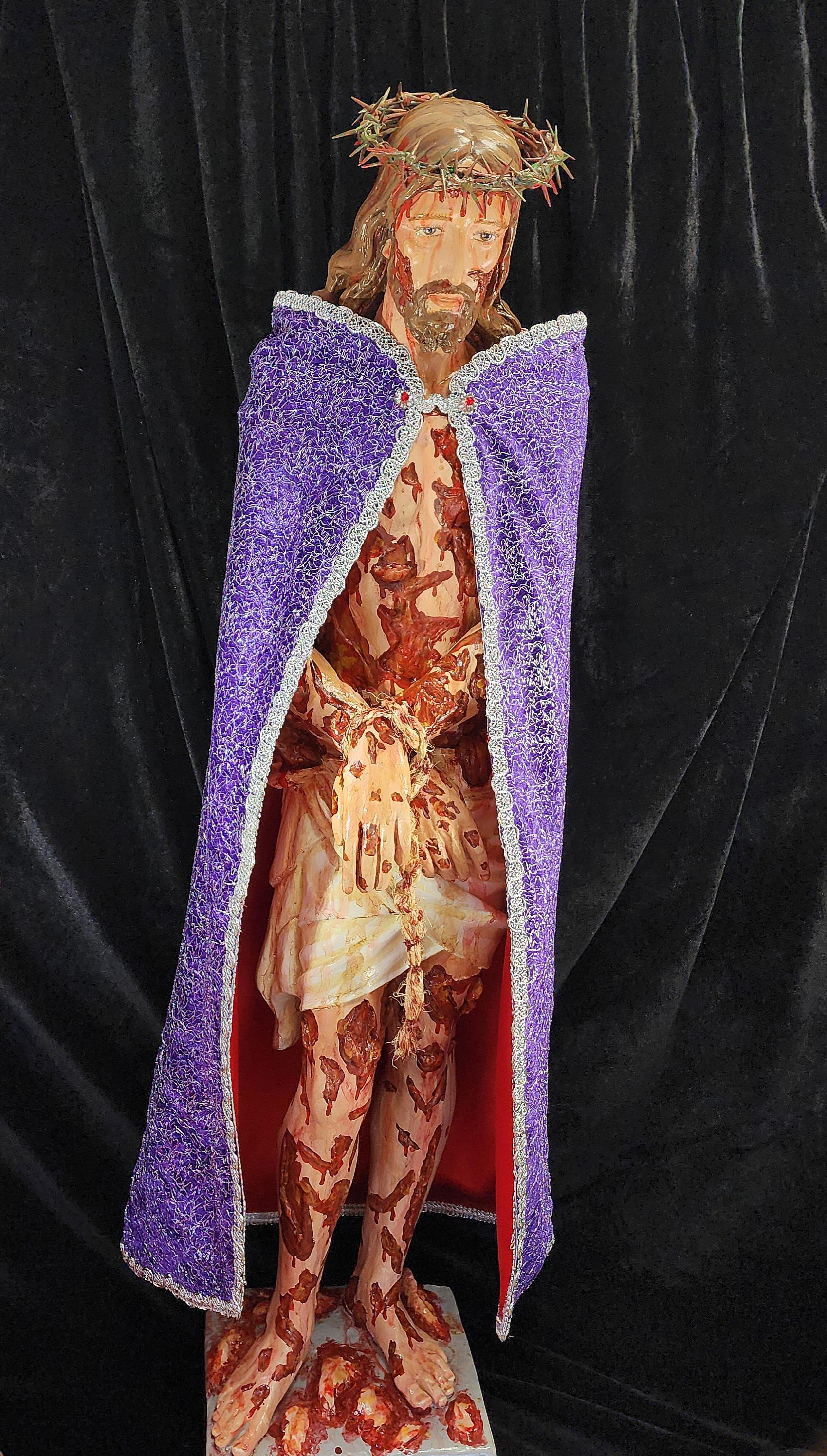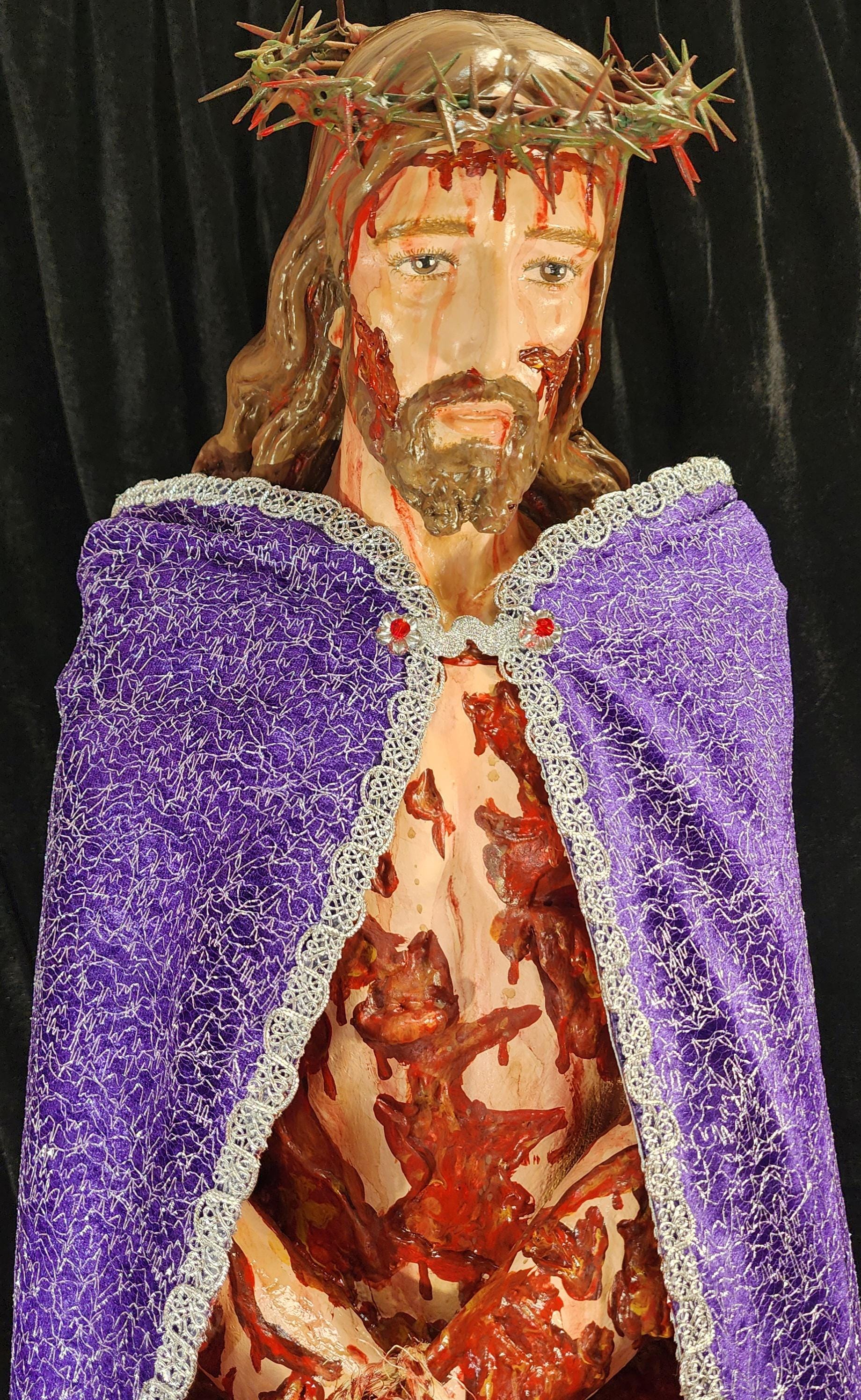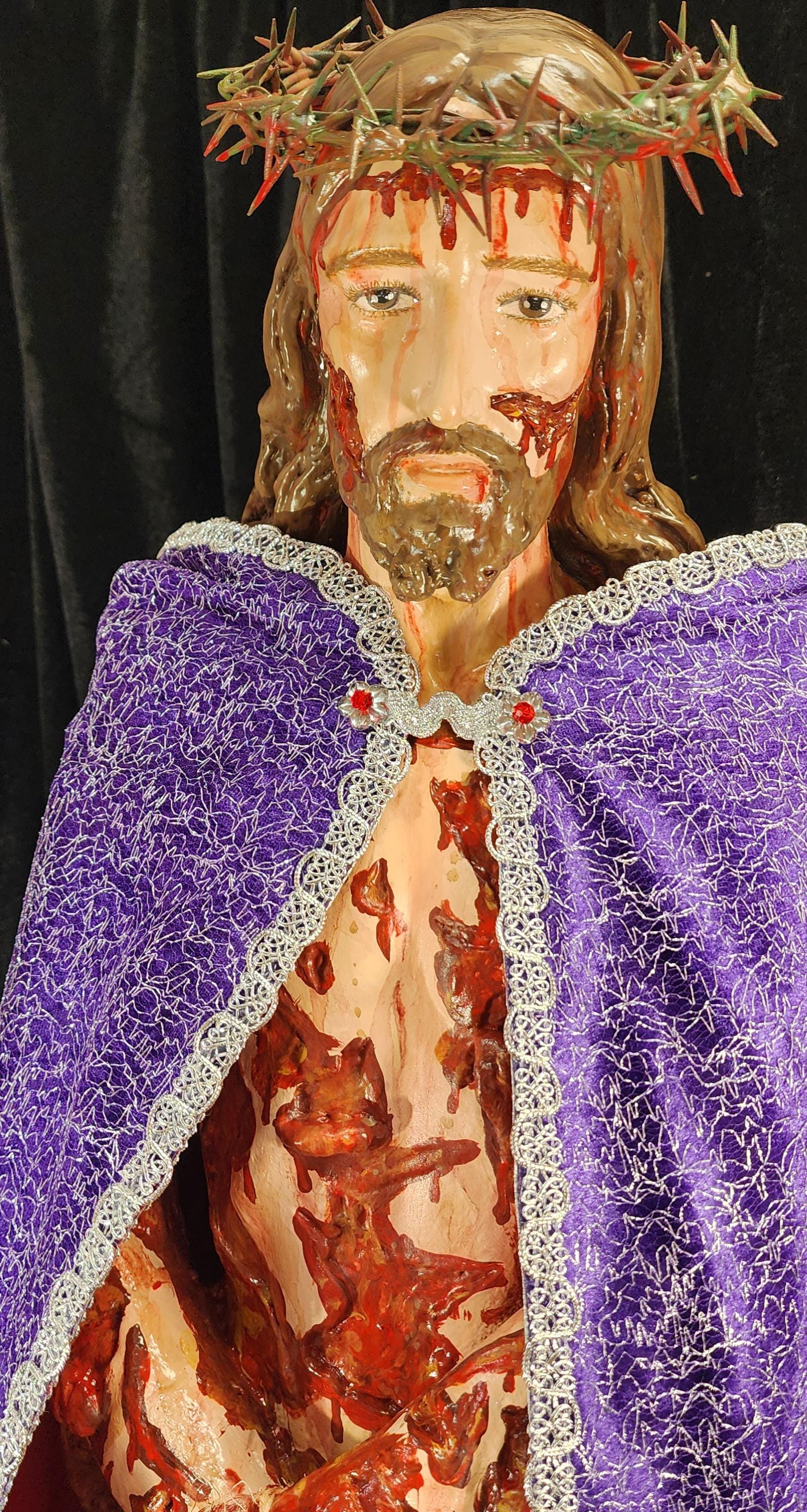 Statue shown with a wrist rope and a removable crown of thorns. It will also come with a Beautiful Purple/Scarlet (GLORIFIED VERSION) Cloak (4 layers of different materials/fabrics).