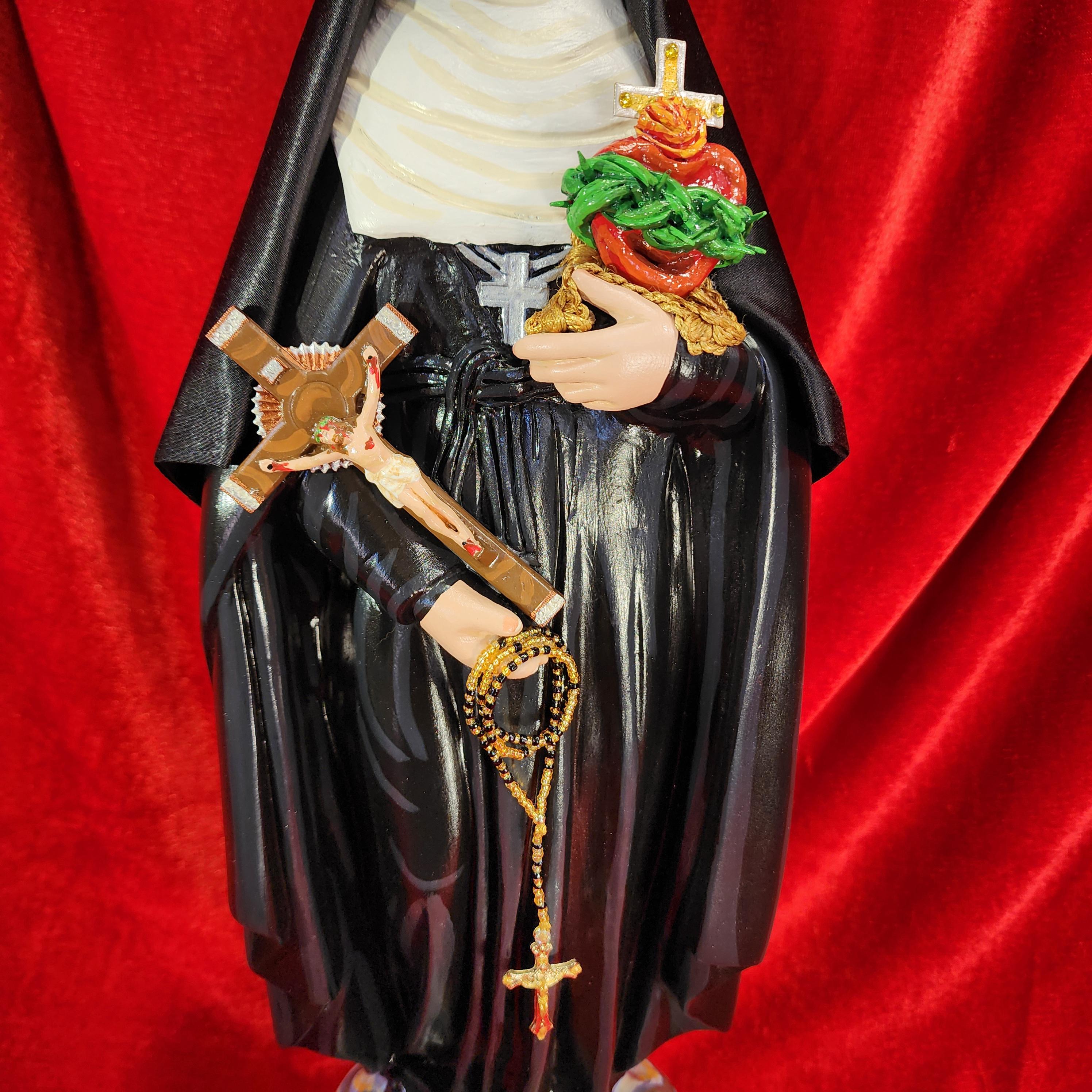 This blissful 18" statue features a serene hand painted face and details such as fingernails and eyelashes. Margaret Mary holds a crucifix in one arm, a tiny rosary in her hand and elevates a golden cloth pillow with the Sacred Heart of Jesus surrounded with thorns in the other. She also has a golden halo and a black satin fabric veil.