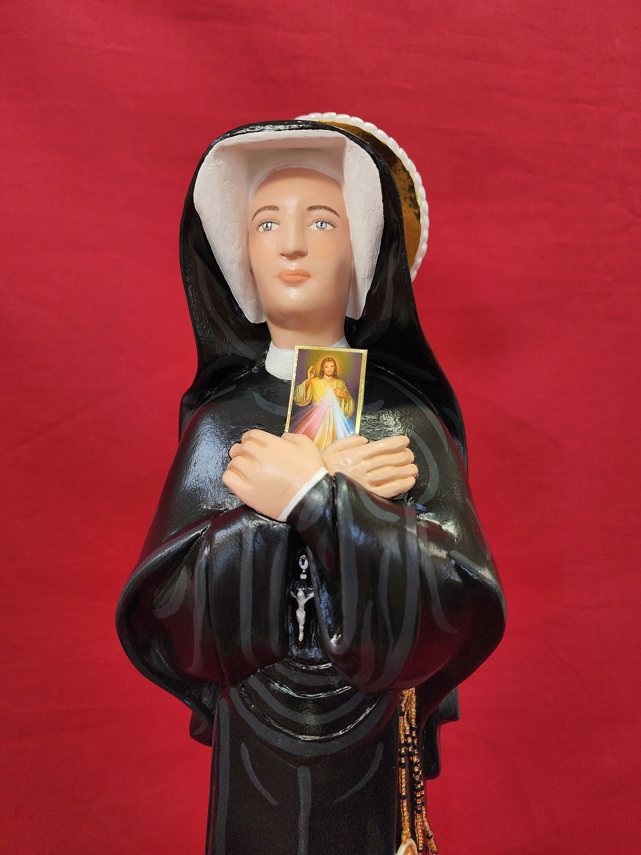 This statue features a divinely inspired hand painted face and details such as fingernails and eyelashes, Jesus Divine Mercy image and golden halo.