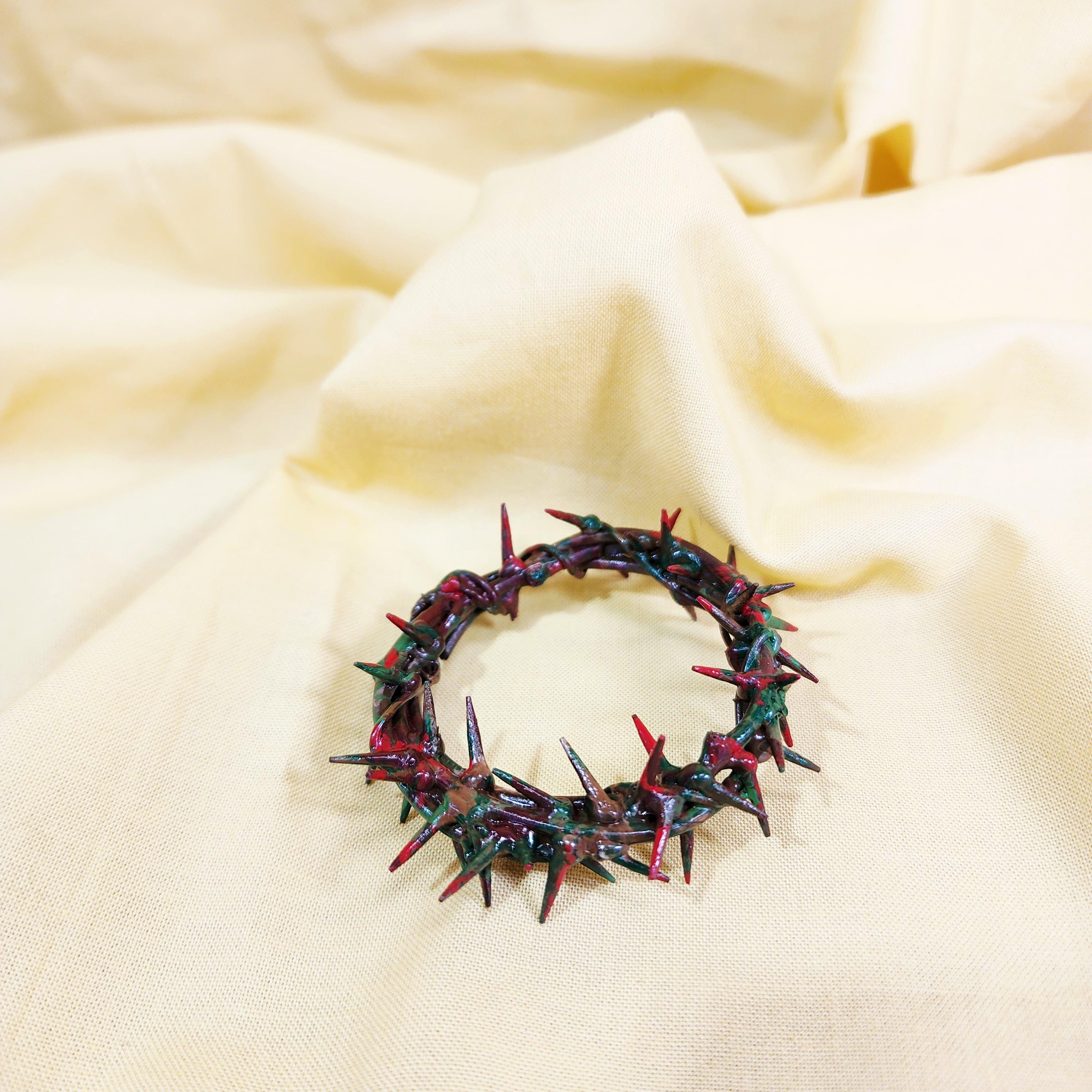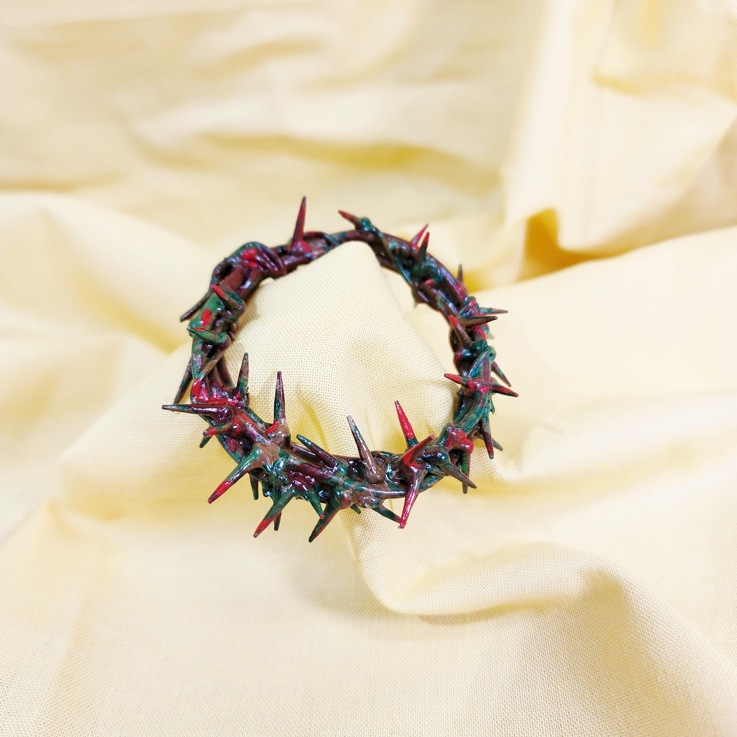 This statue features a magnificent hand painted face in ecstasy and details such as fingernails and eyelashes, hand made black satin material Passionist cape/cloak with emblem/insignia, hand made rosary hanging around arm, crown of thorns for her head and golden halo. St Gemma is shown with blood from her Crown of Thorns/stigmata.