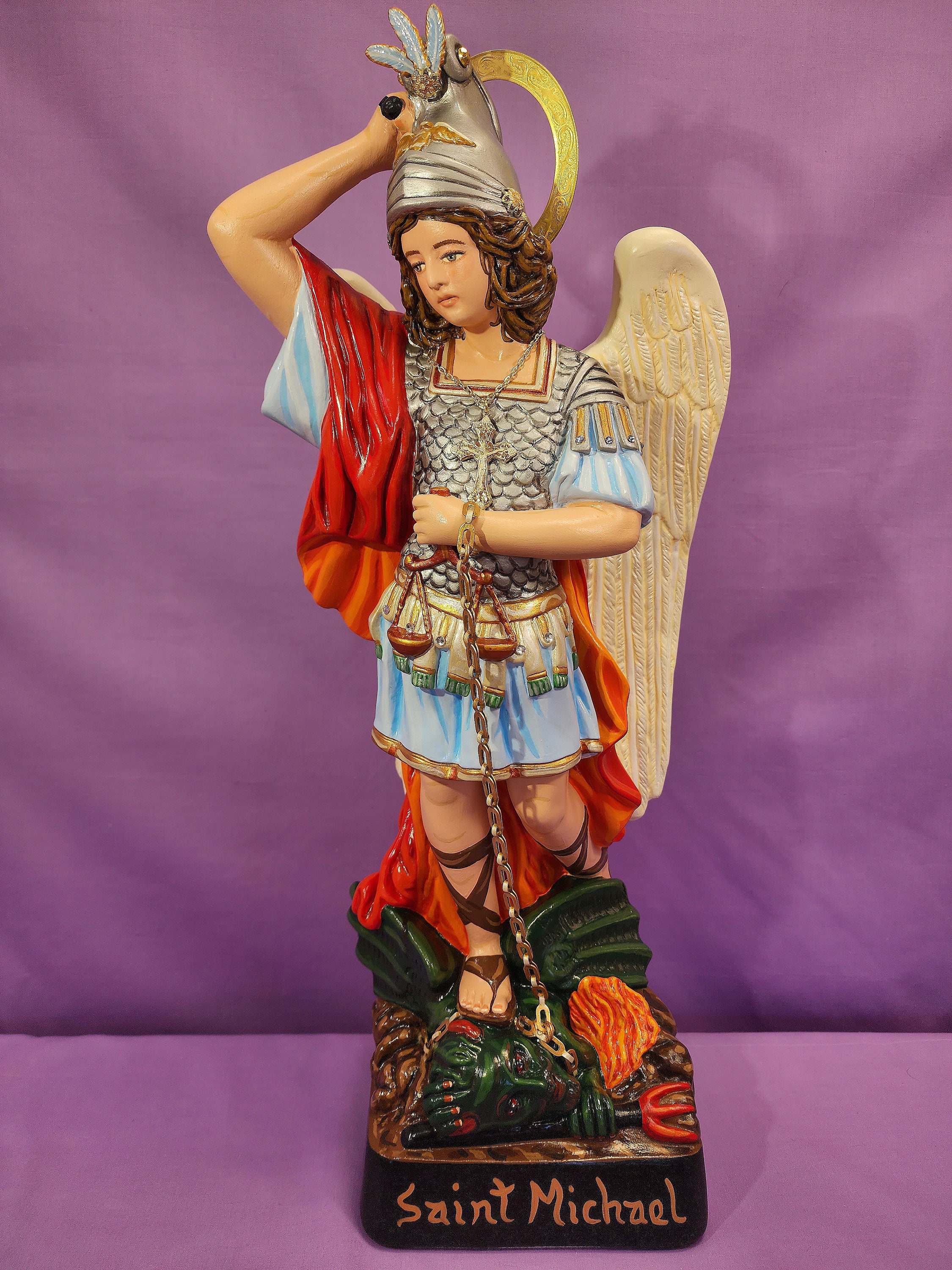 This is our latest statue we have received from Heavenly Saints. However, this is not just a statue. This is a sacred work of art. An expression of love seen with every brushstroke and detail given to him. These statues are projections of the saints and of the Holy on such a divine level. When you receive your statue you are awestruck and filled with so much joy. This St. Michael is like all our other statues we have received in that it feels so full of energy and love and so much power.So beautiful! The statues all receive blessings and are made with care. Care takes time so I am patient and it is always worth the wait. These are spiritual gifts. These are statues that you will keep for life. These are sacred family heirlooms. Unique and one of a kind. Irreplaceable. For yourself and for others. I love to gift these. God Bless.