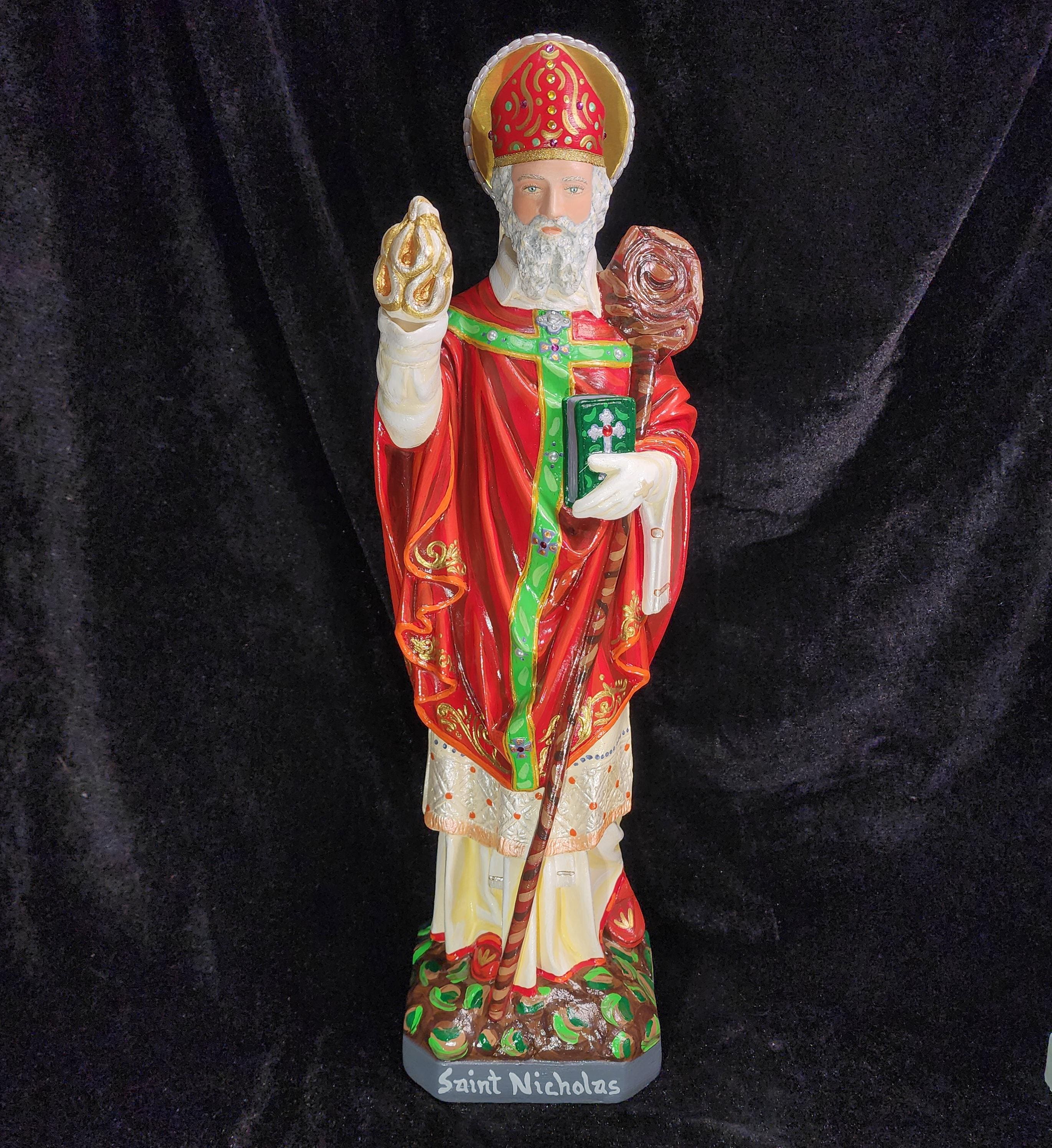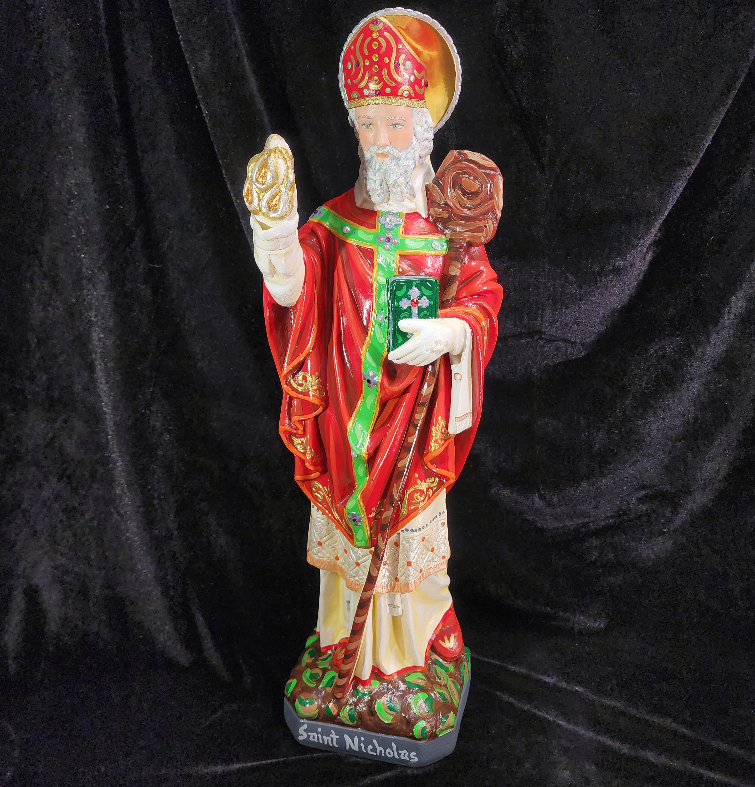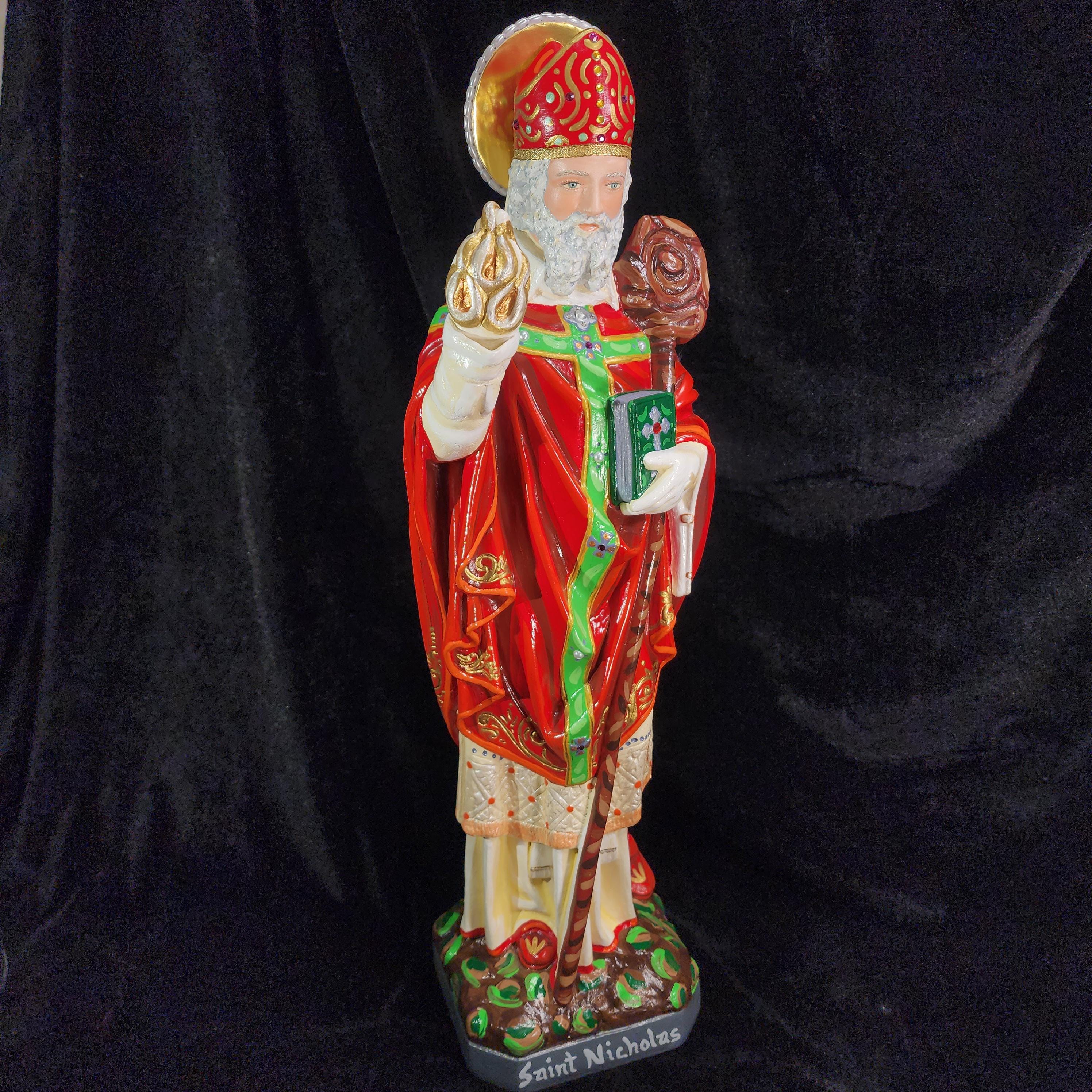 This 19" statue features a distinguished hand painted face and details such as fingernails and eyelashes, exquisite filigree detail on vestments, crucifix necklace and golden halo. St. Nicholas holds the Word of God and his staff in one hand and three purses/3 balls of gold in the other hand.