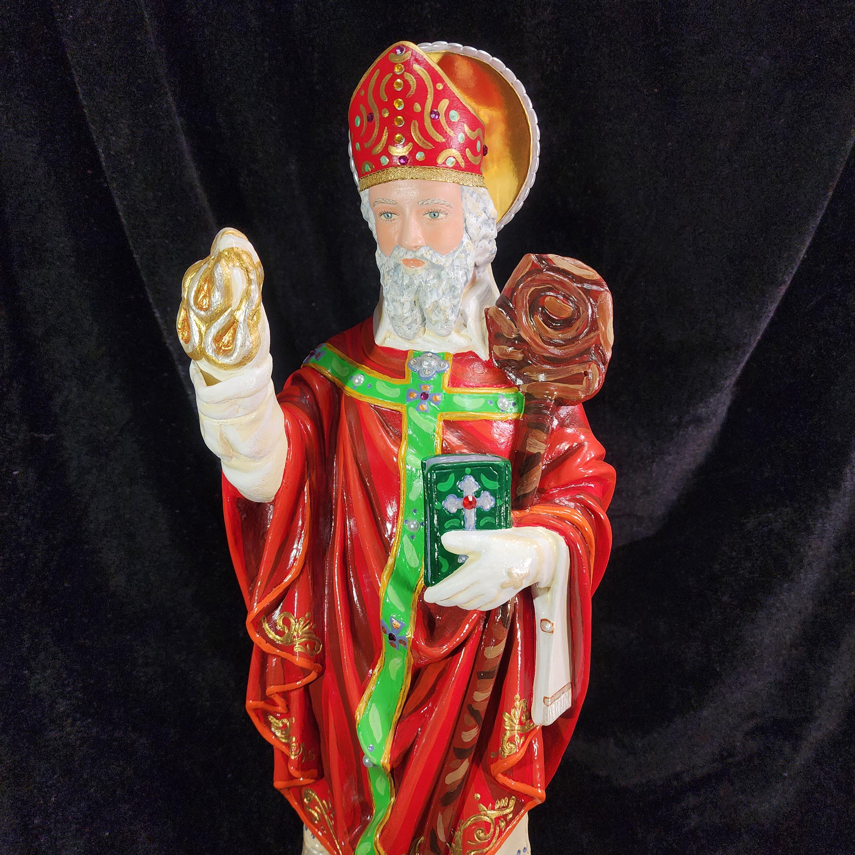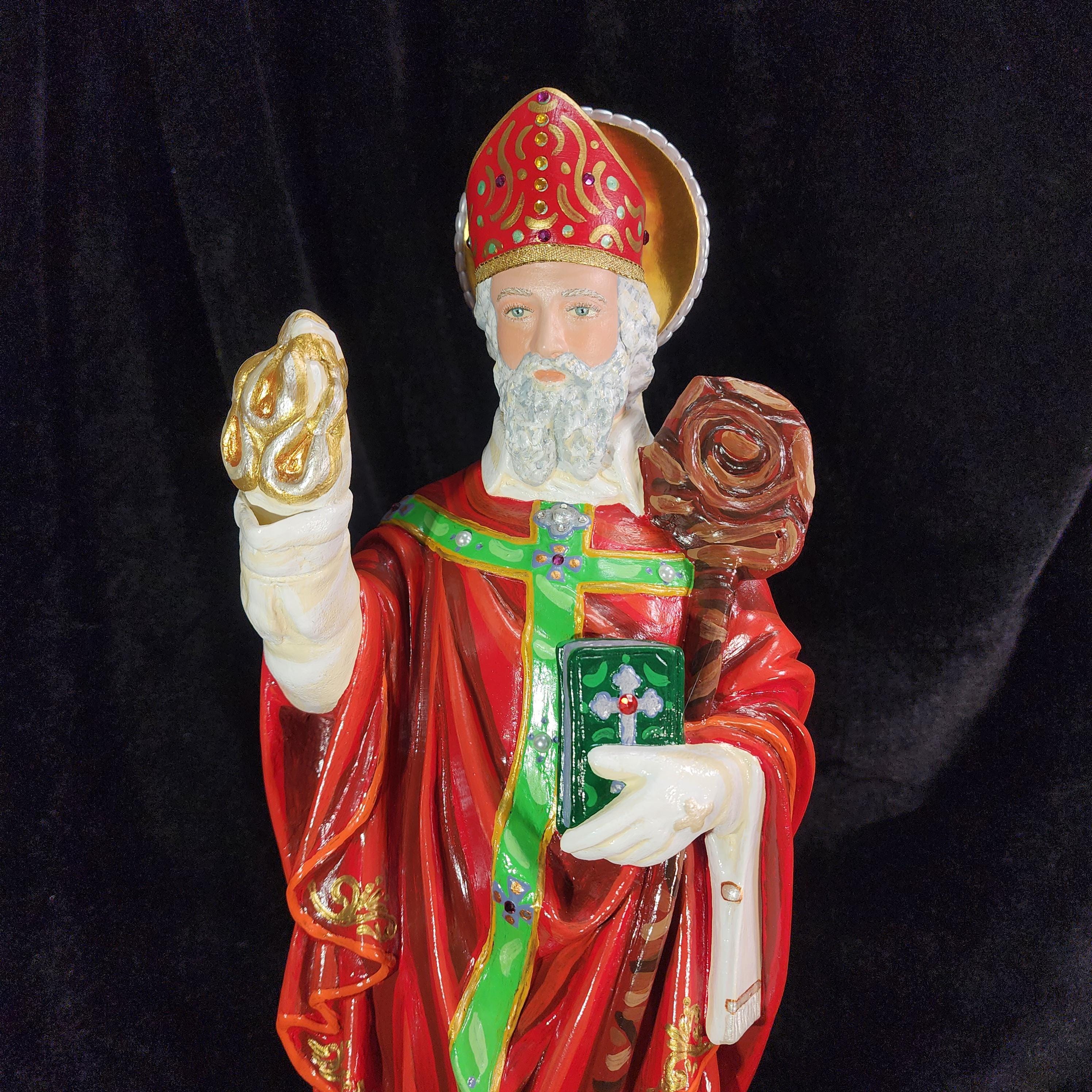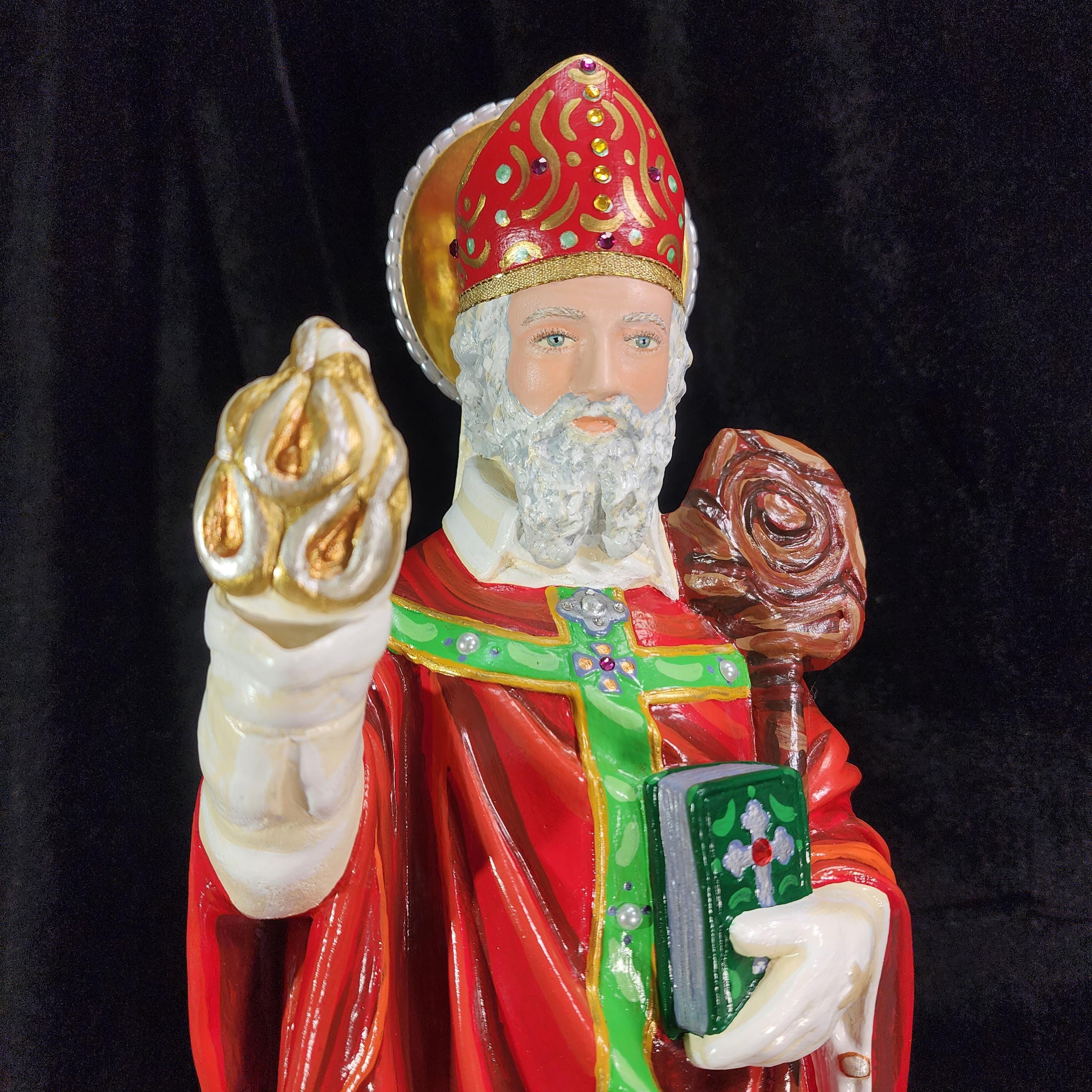 This 19" statue features a distinguished hand painted face and details such as fingernails and eyelashes, exquisite filigree detail on vestments, crucifix necklace and golden halo. St. Nicholas holds the Word of God and his staff in one hand and three purses/3 balls of gold in the other hand.