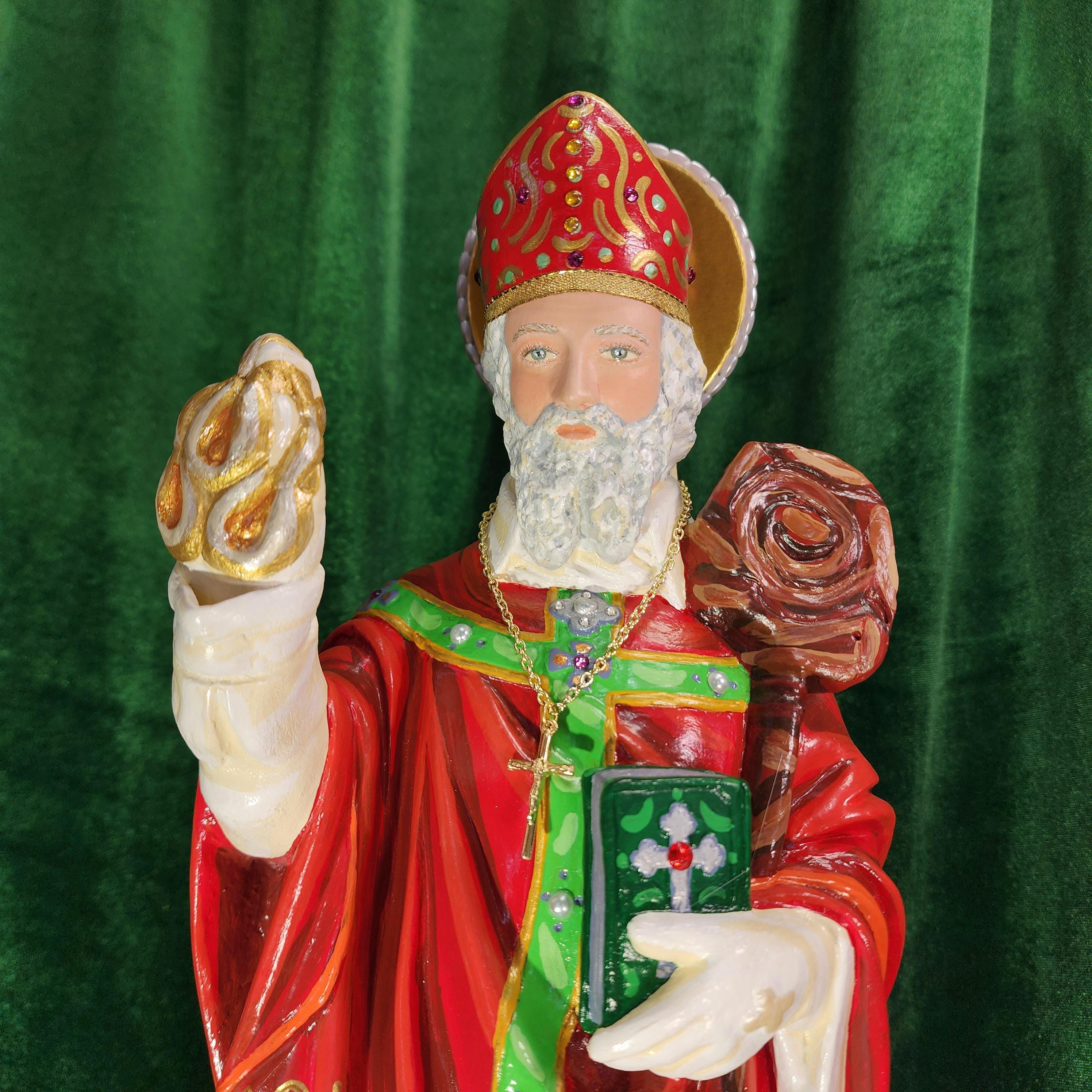 This 19" statue features a distinguished hand painted face and details such as fingernails and eyelashes, exquisite filigree detail on vestments, crucifix necklace and golden halo. St. Nicholas holds the Word of God and his staff in one hand and three purses/3 balls of gold in the other hand.