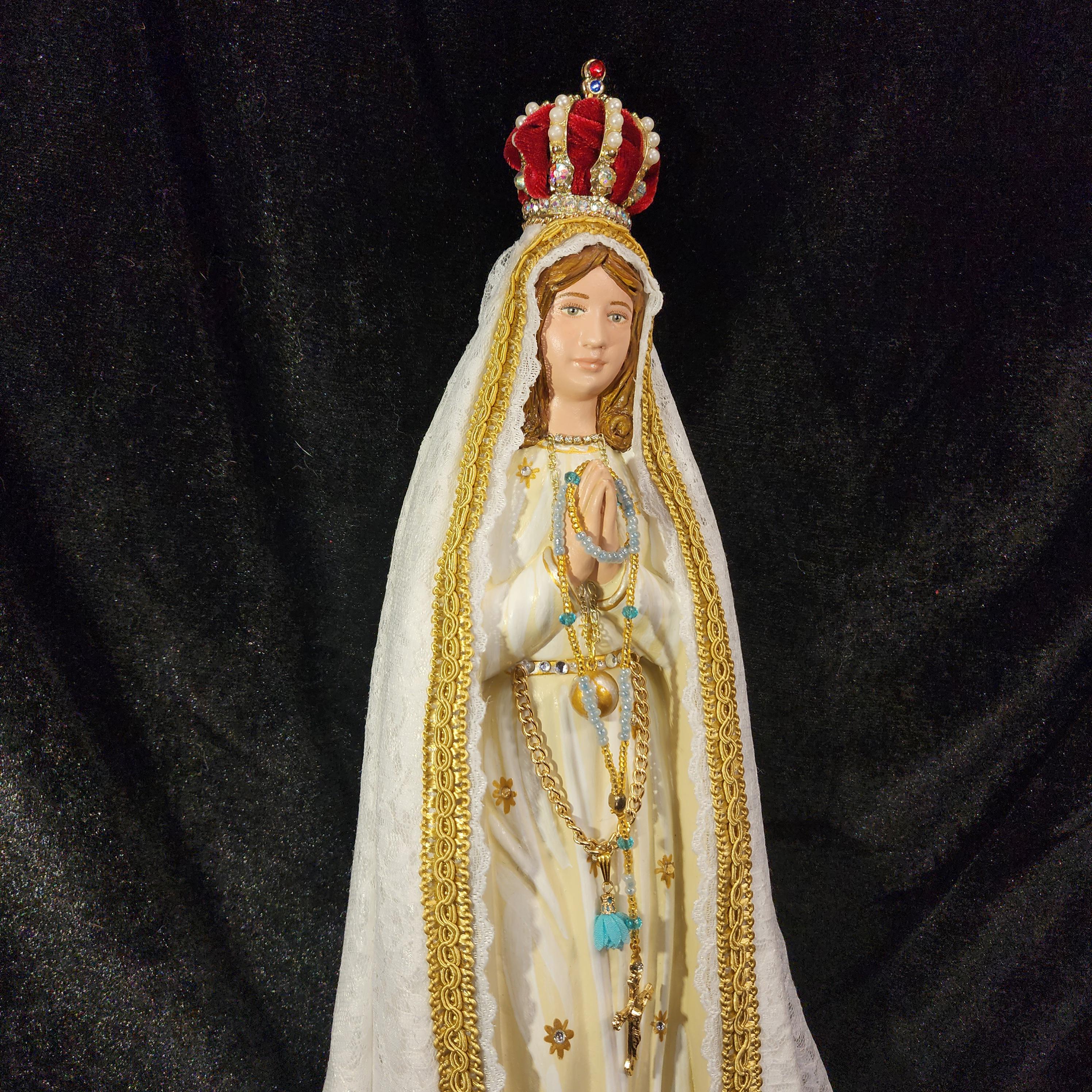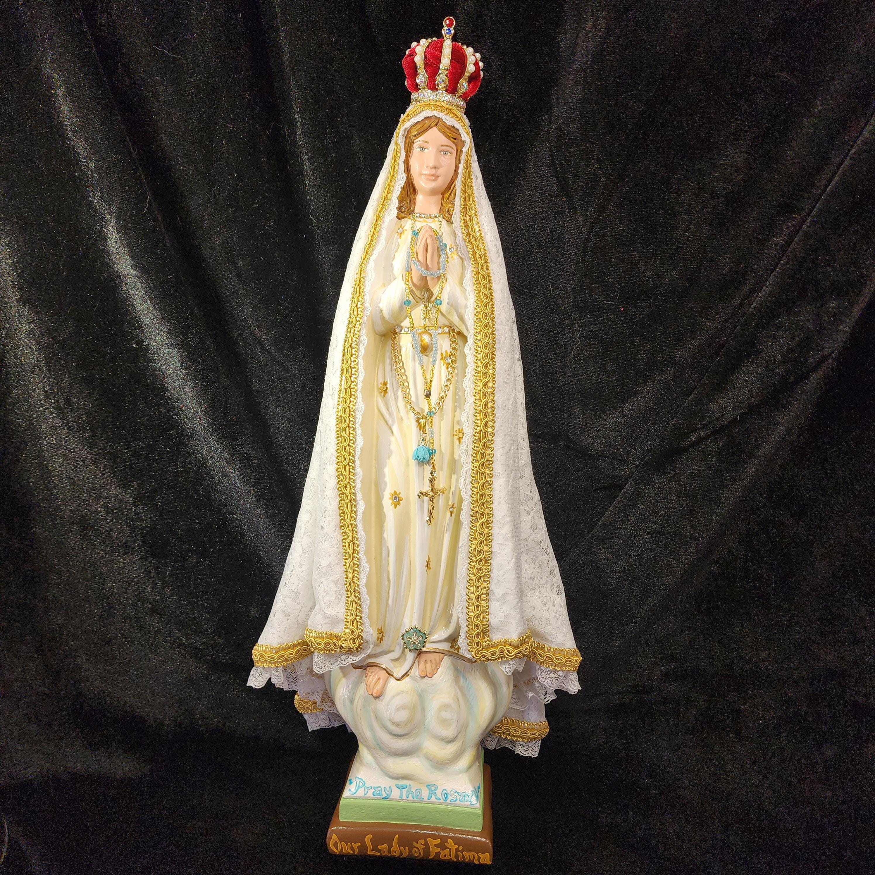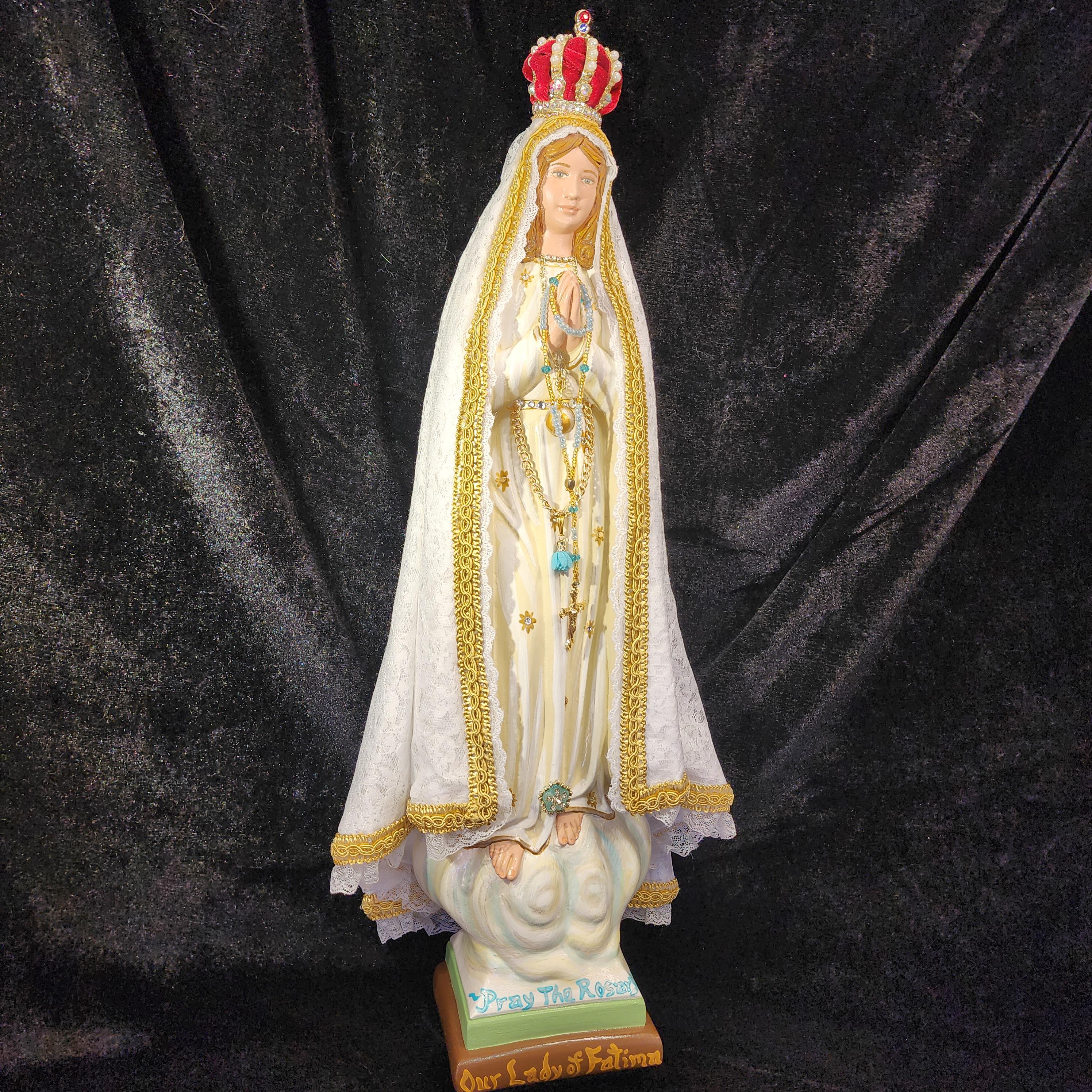 This 18" statue features a hand painted face, details such as fingernails and eyelashes, full length (head to foot) lace over satin style mantle with golden trim work, cord/chain of purity with dangling tassel hanging at her waist/belt, golden ball representing Mary's bright light, hand-made tiny rosary beads in her hands, jeweled crown with "red velvet" lining (just like the Fatima statue that travels all over the world), and other accoutrements associated with Our Lady of Fatima.