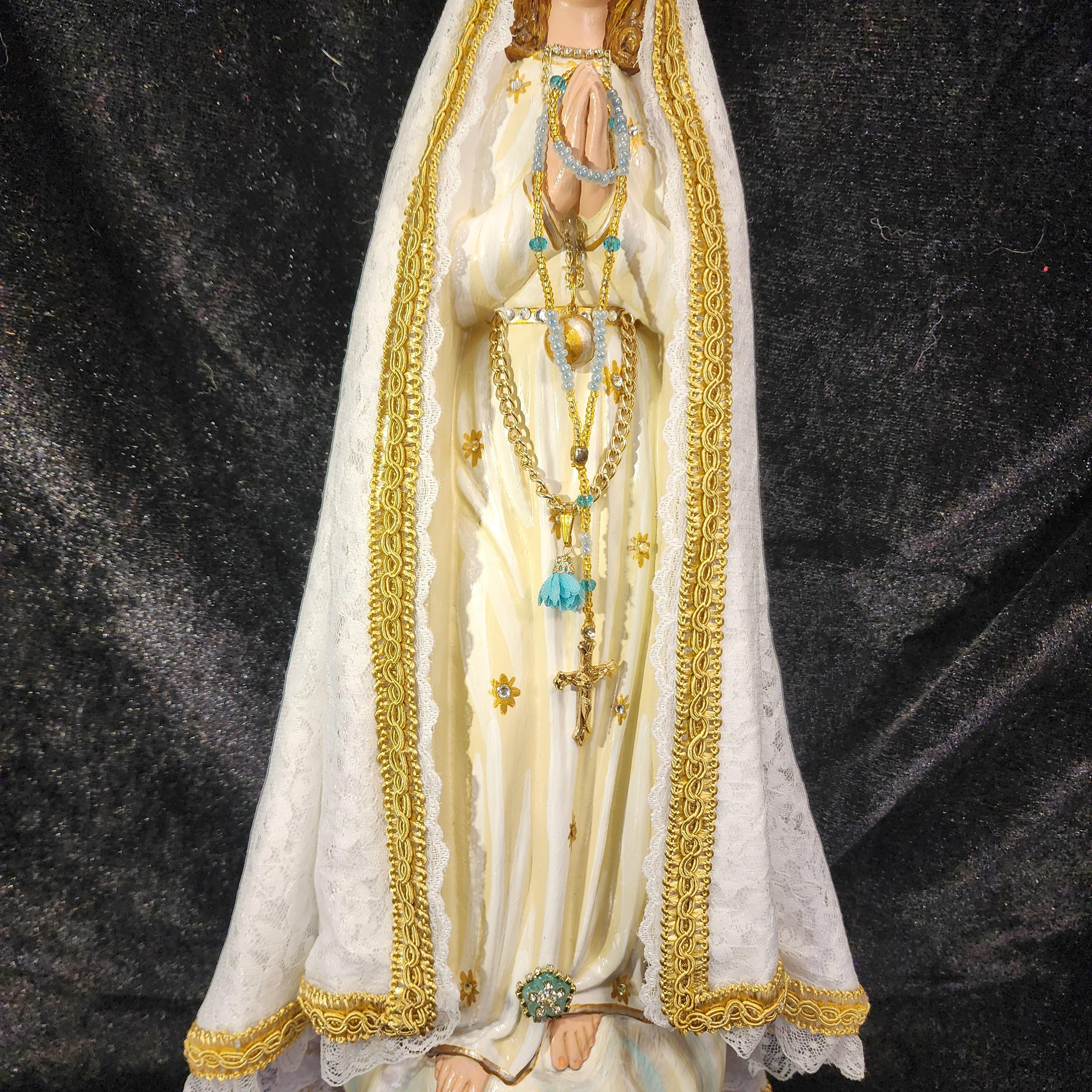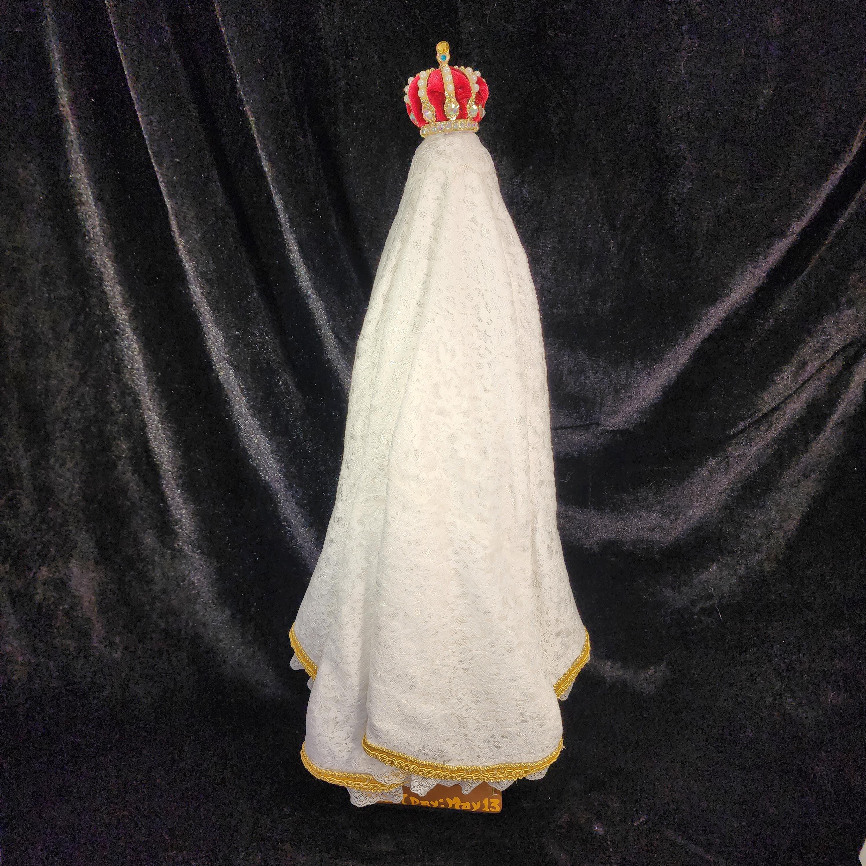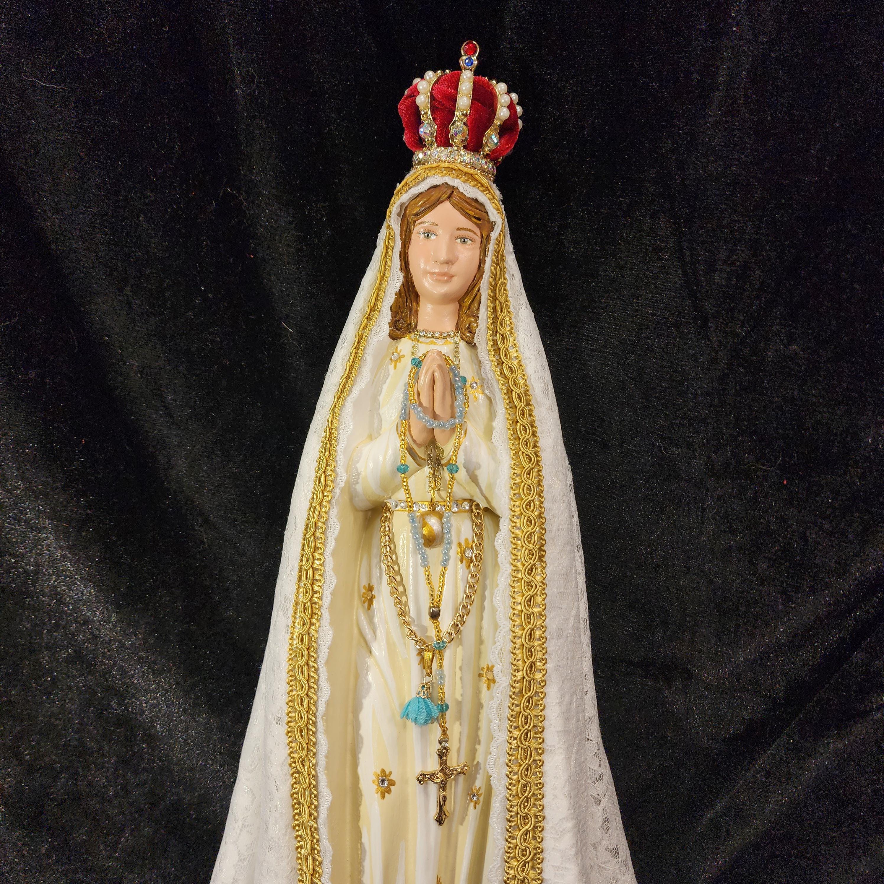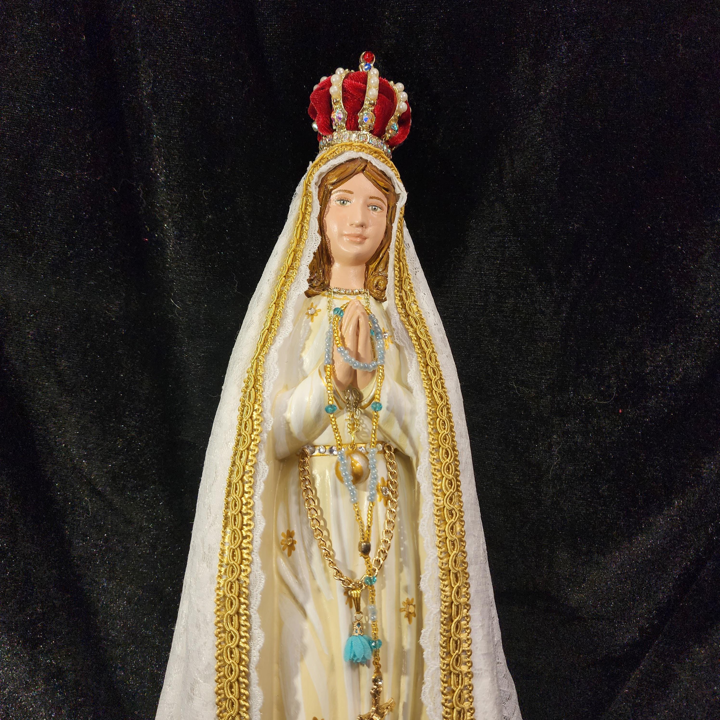 This 18" statue features a hand painted face, details such as fingernails and eyelashes, full length (head to foot) lace over satin style mantle with golden trim work, cord/chain of purity with dangling tassel hanging at her waist/belt, golden ball representing Mary's bright light, hand-made tiny rosary beads in her hands, jeweled crown with "red velvet" lining (just like the Fatima statue that travels all over the world), and other accoutrements associated with Our Lady of Fatima.