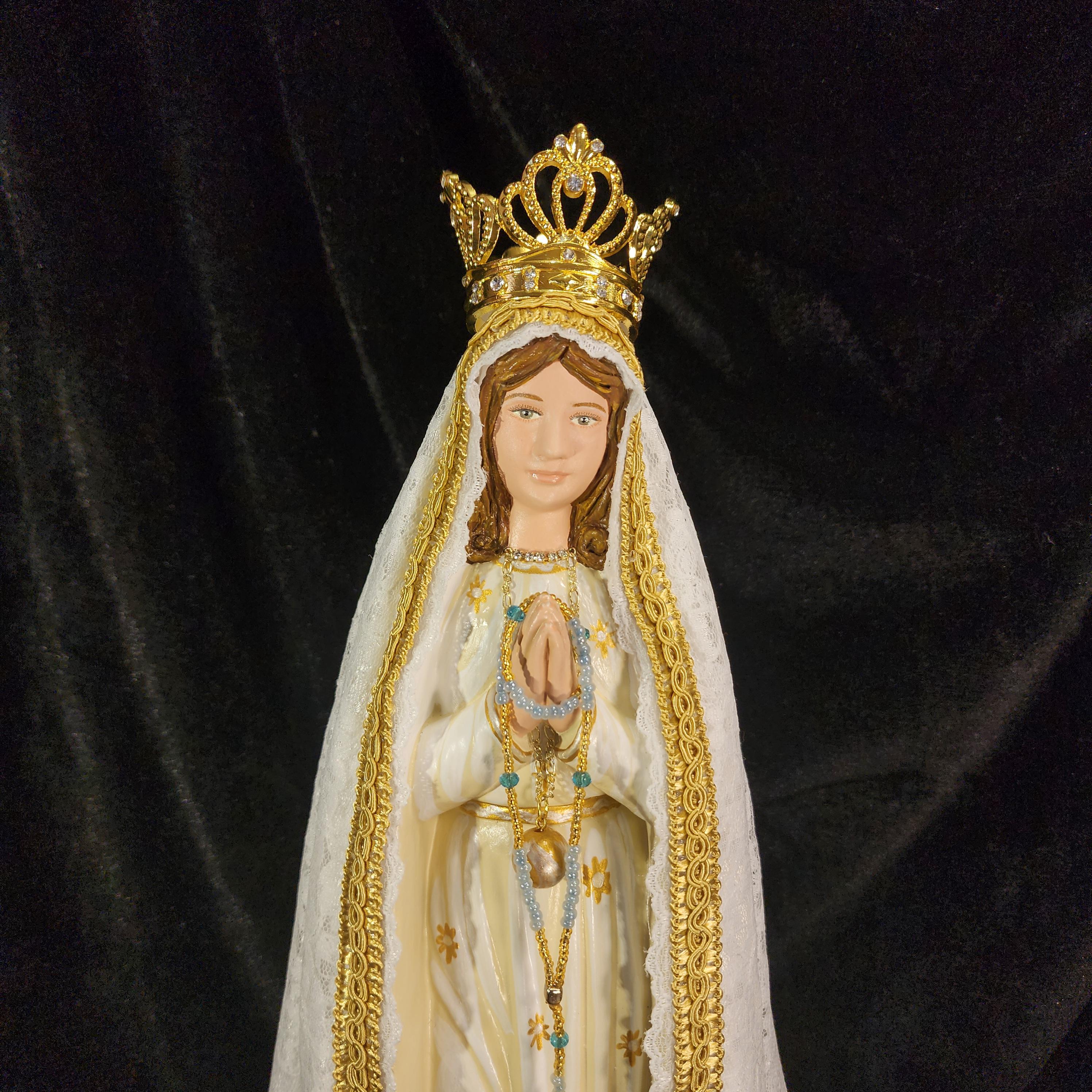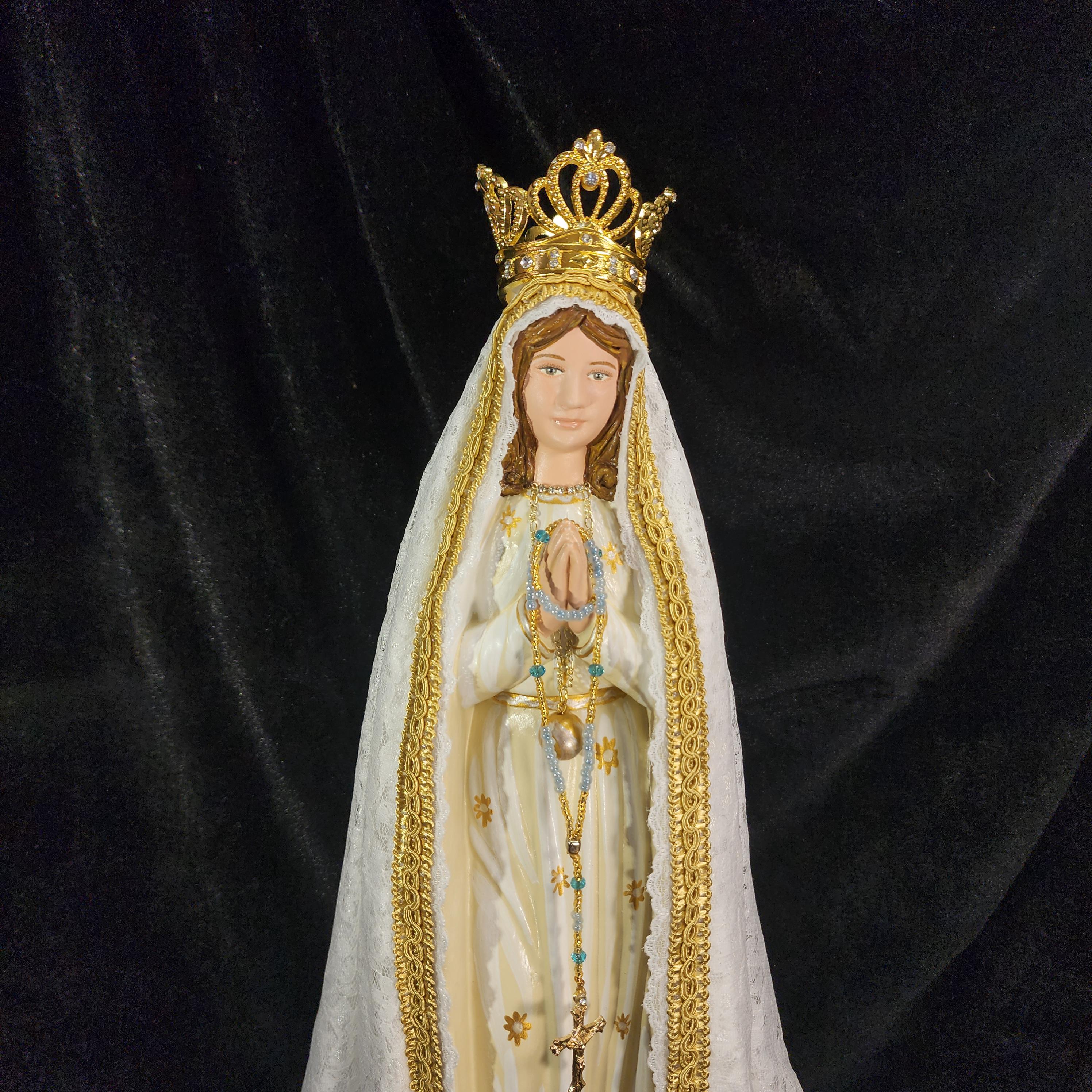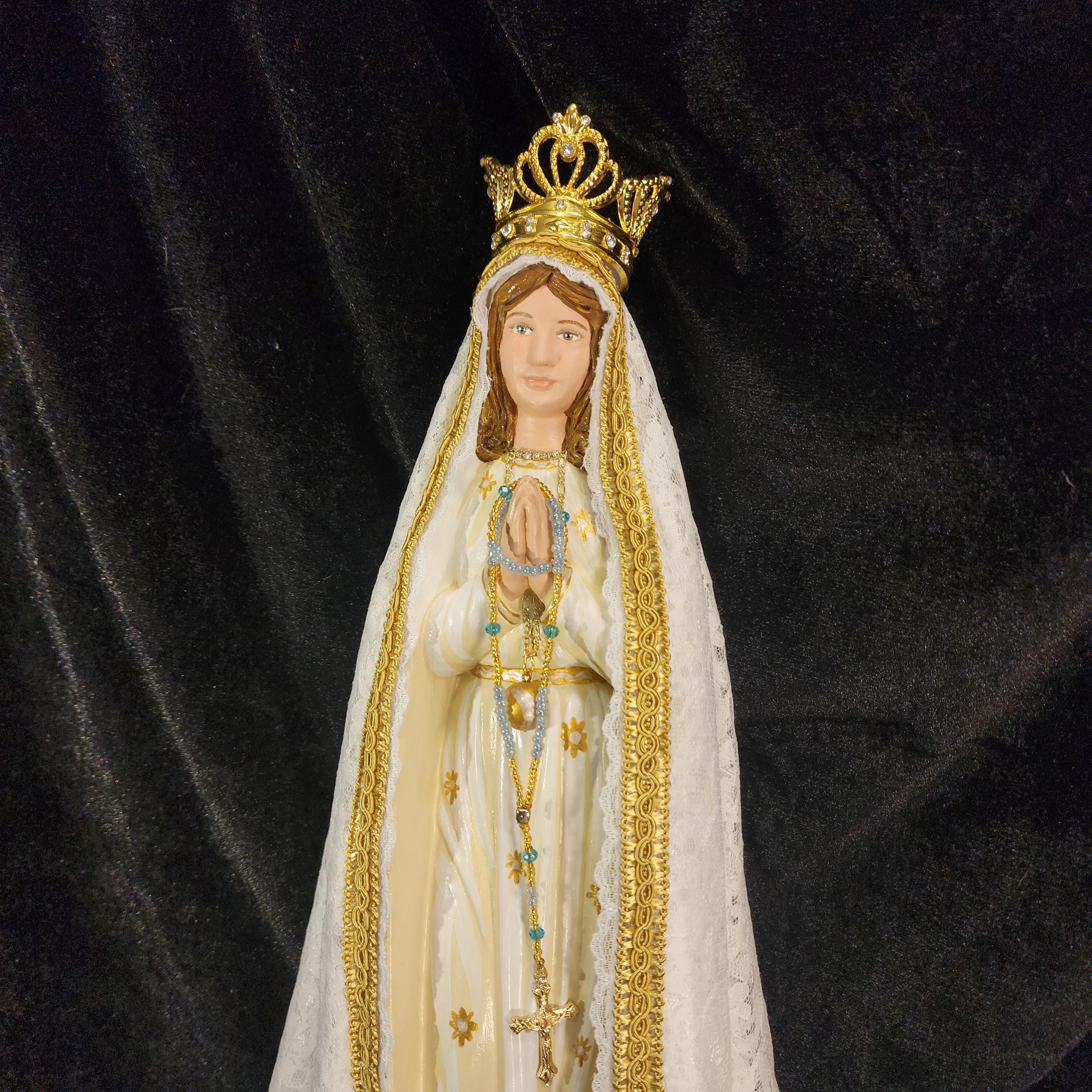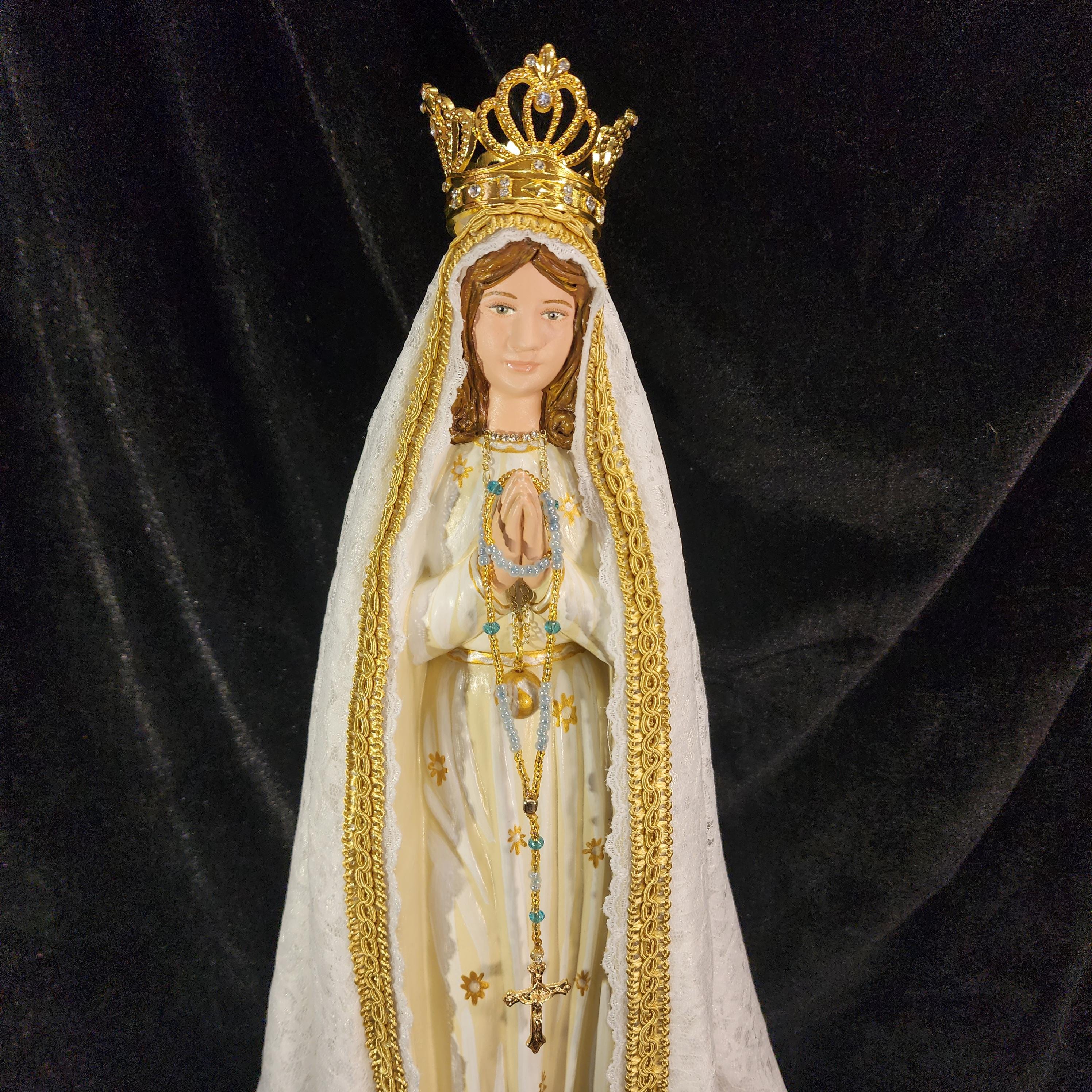 Now, anyone can have their own Pilgrim Virgin of Fatima like the ones carried in processions, except in smaller home-friendly sizes. This statue features a hand painted face, details such as fingernails and eyelashes, full length (head to foot) lace over satin style mantle with golden trim work, hand-made tiny rosary beads in her hands, gold queenship (open-top) jeweled crown and other accoutrements associated with Our Lady of Fatima.
