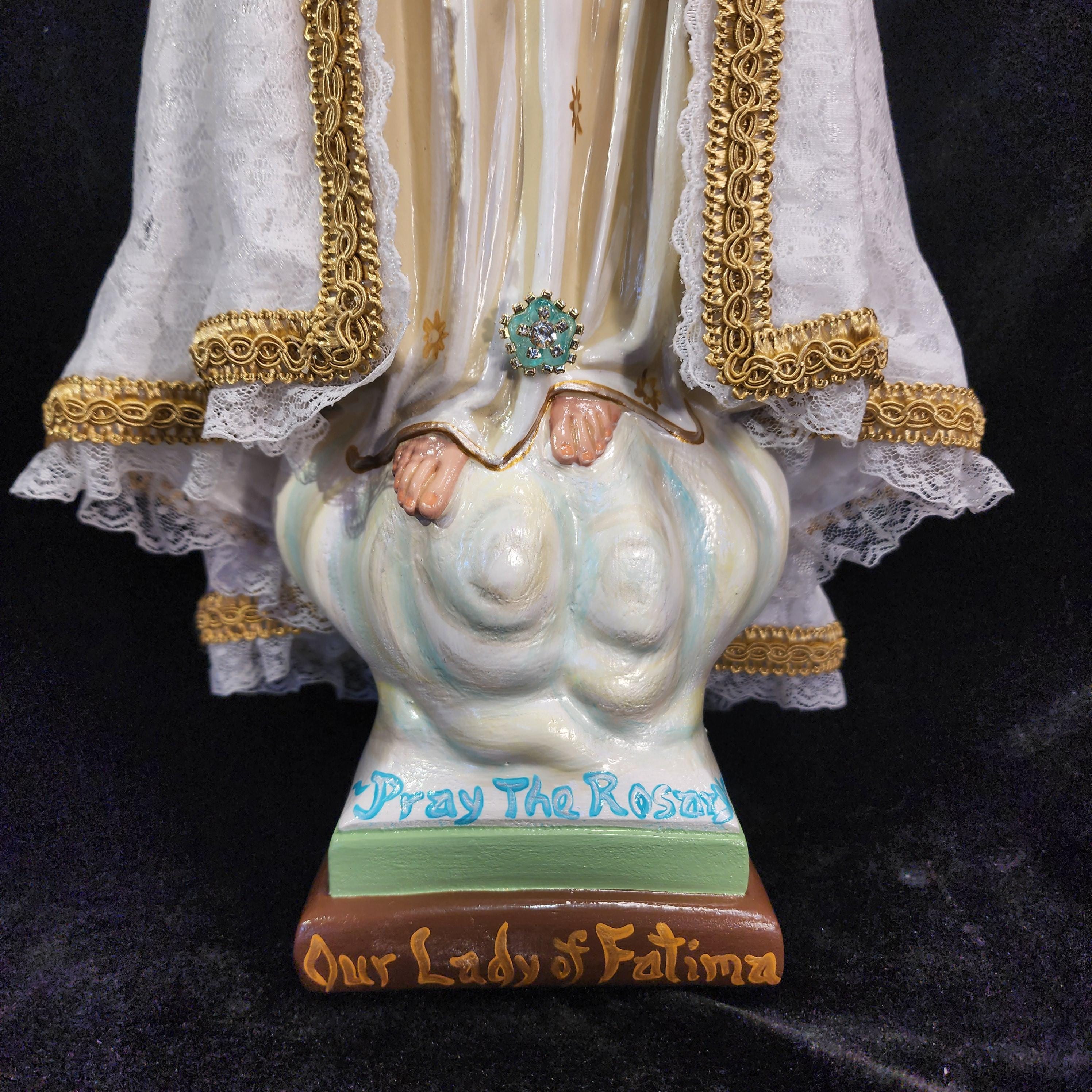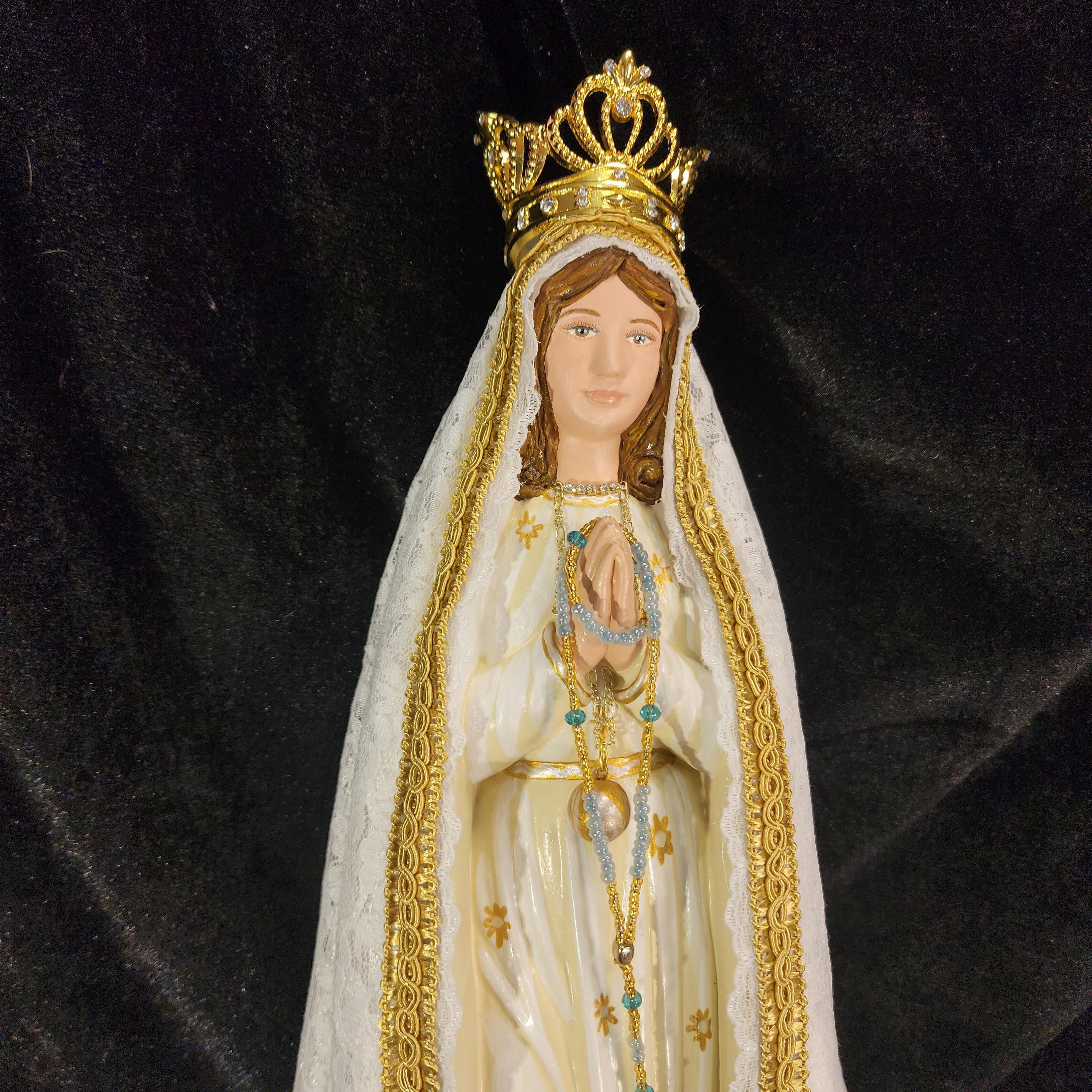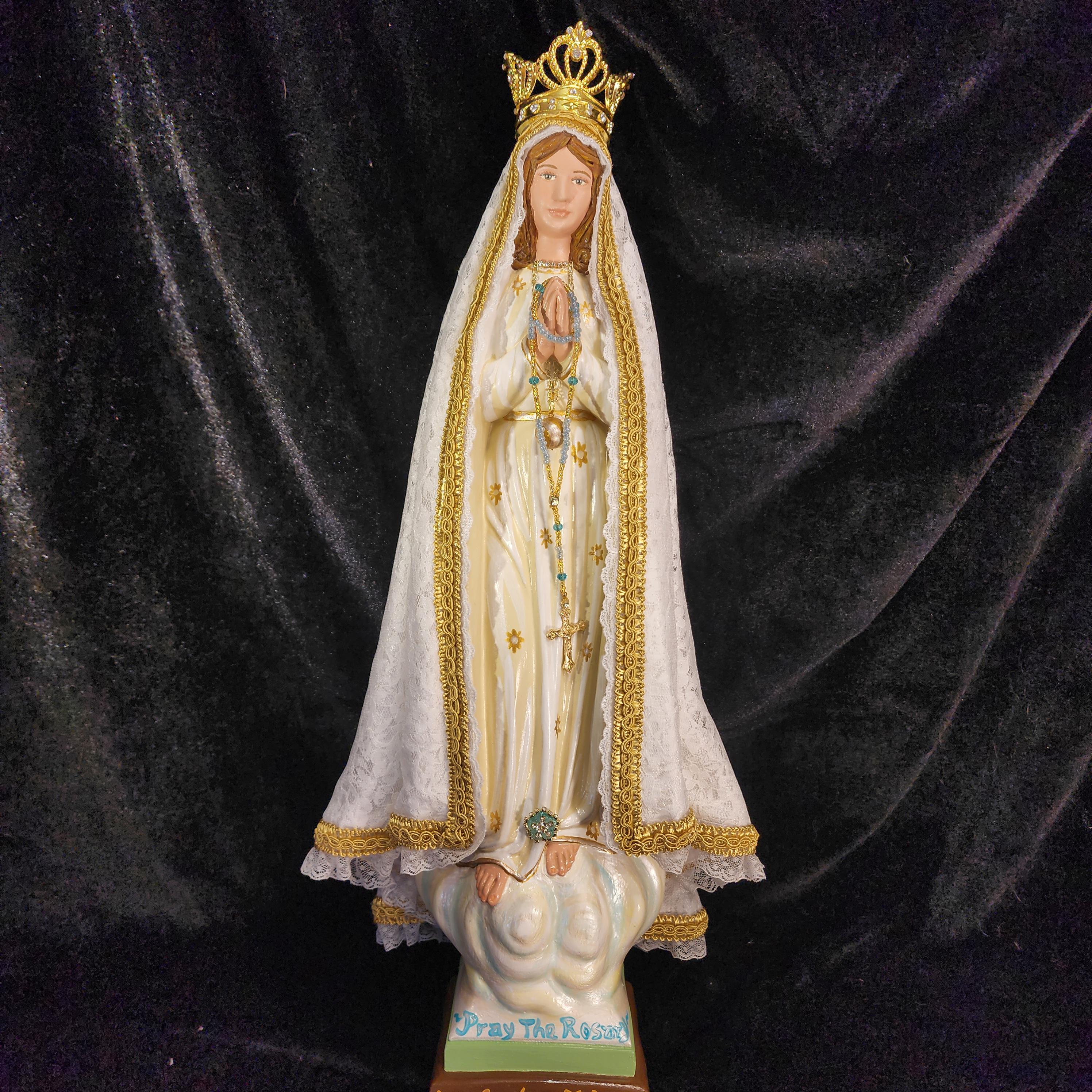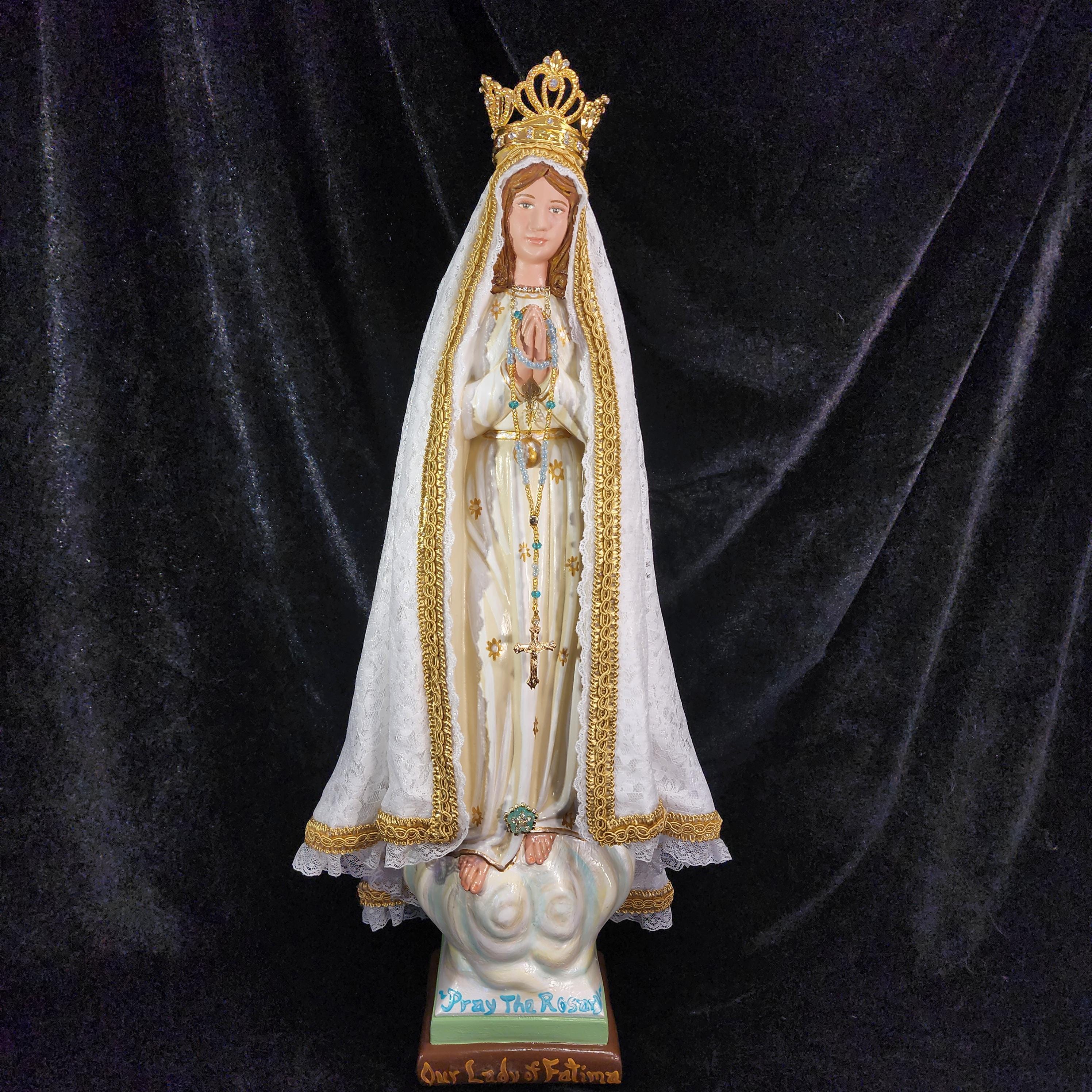 Now, anyone can have their own Pilgrim Virgin of Fatima like the ones carried in processions, except in smaller home-friendly sizes. This statue features a hand painted face, details such as fingernails and eyelashes, full length (head to foot) lace over satin style mantle with golden trim work, hand-made tiny rosary beads in her hands, gold queenship (open-top) jeweled crown and other accoutrements associated with Our Lady of Fatima.
