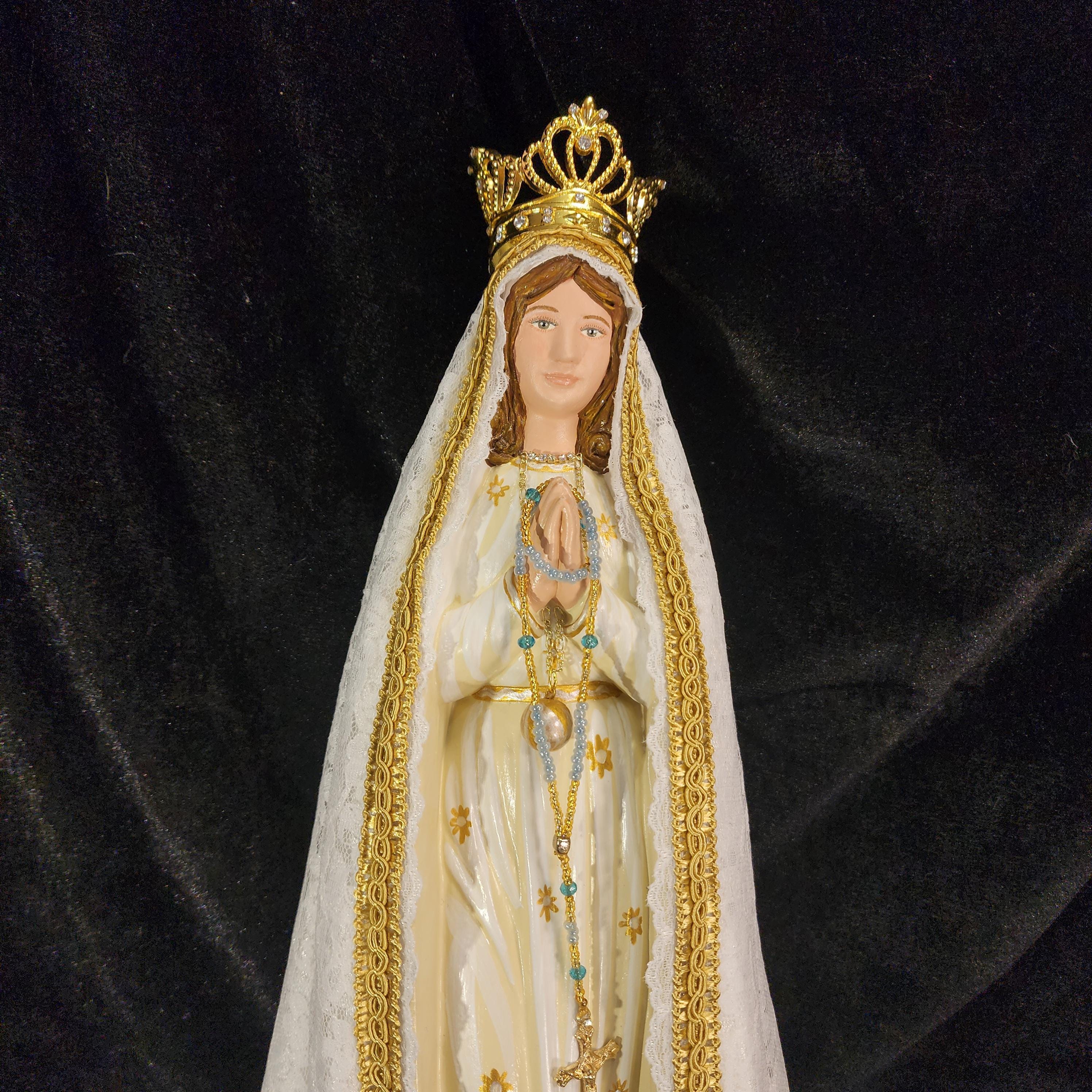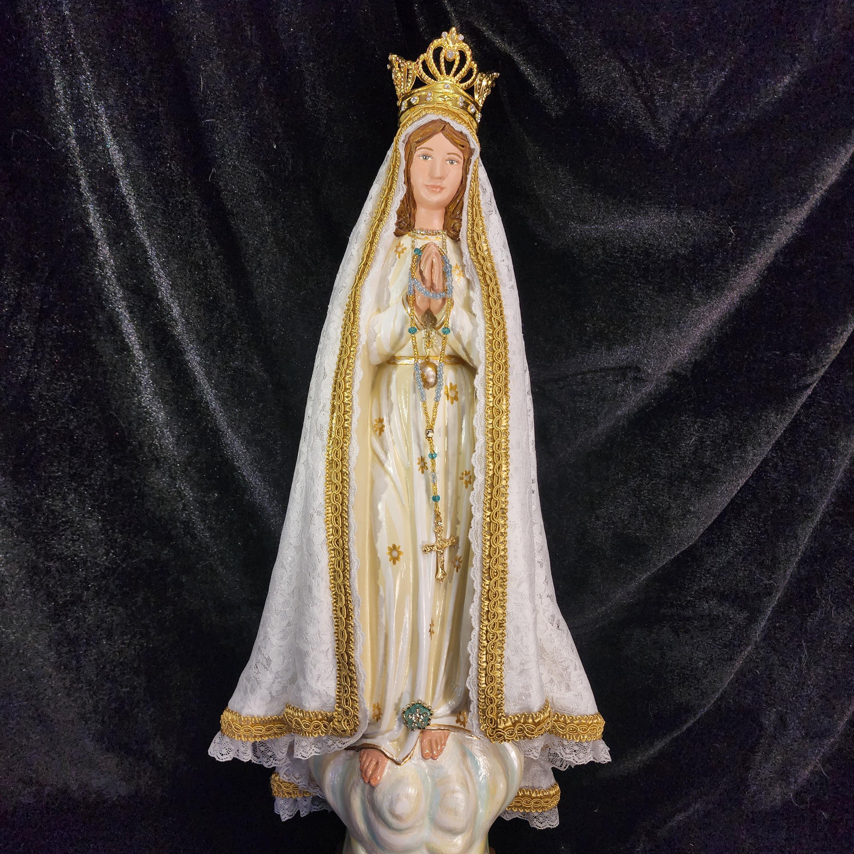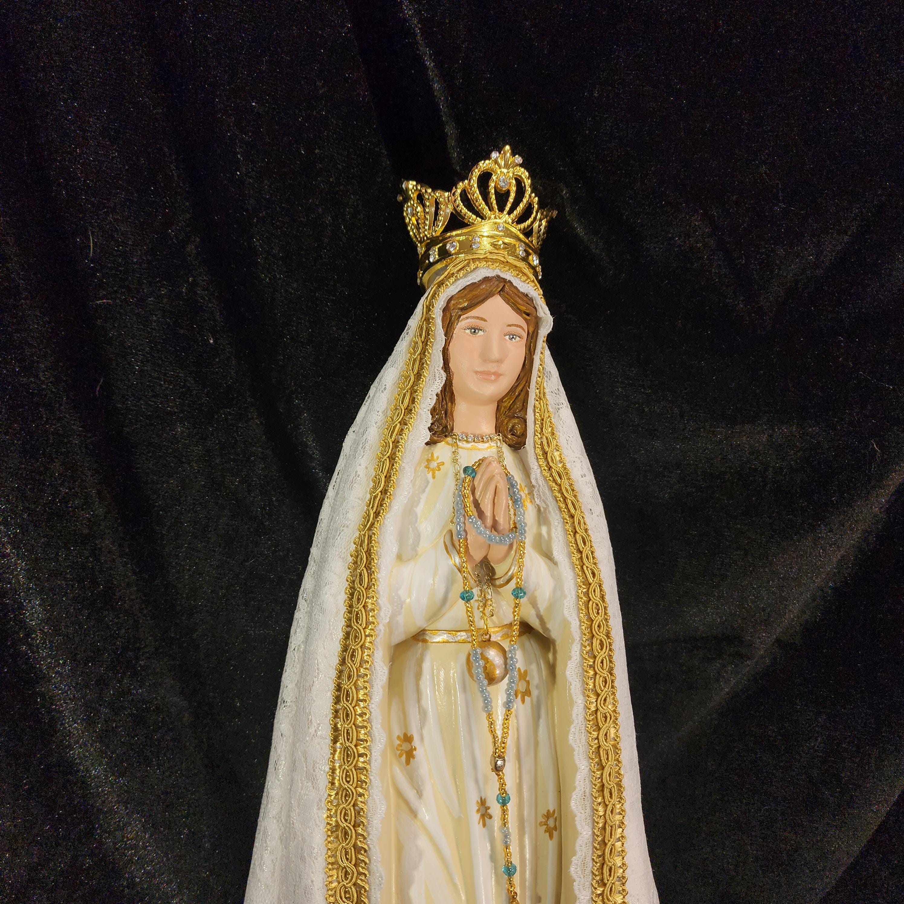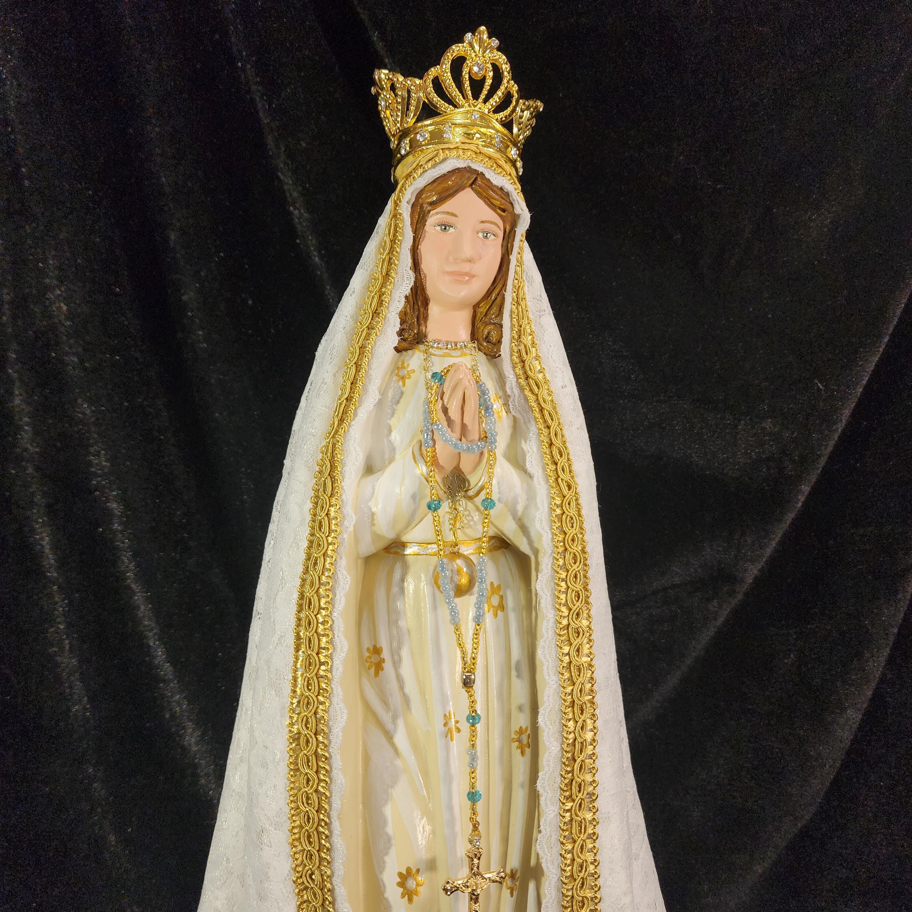 Now, anyone can have their own Pilgrim Virgin of Fatima like the ones carried in processions, except in smaller home-friendly sizes. This statue features a hand painted face, details such as fingernails and eyelashes, full length (head to foot) lace over satin style mantle with golden trim work, hand-made tiny rosary beads in her hands, gold queenship (open-top) jeweled crown and other accoutrements associated with Our Lady of Fatima.