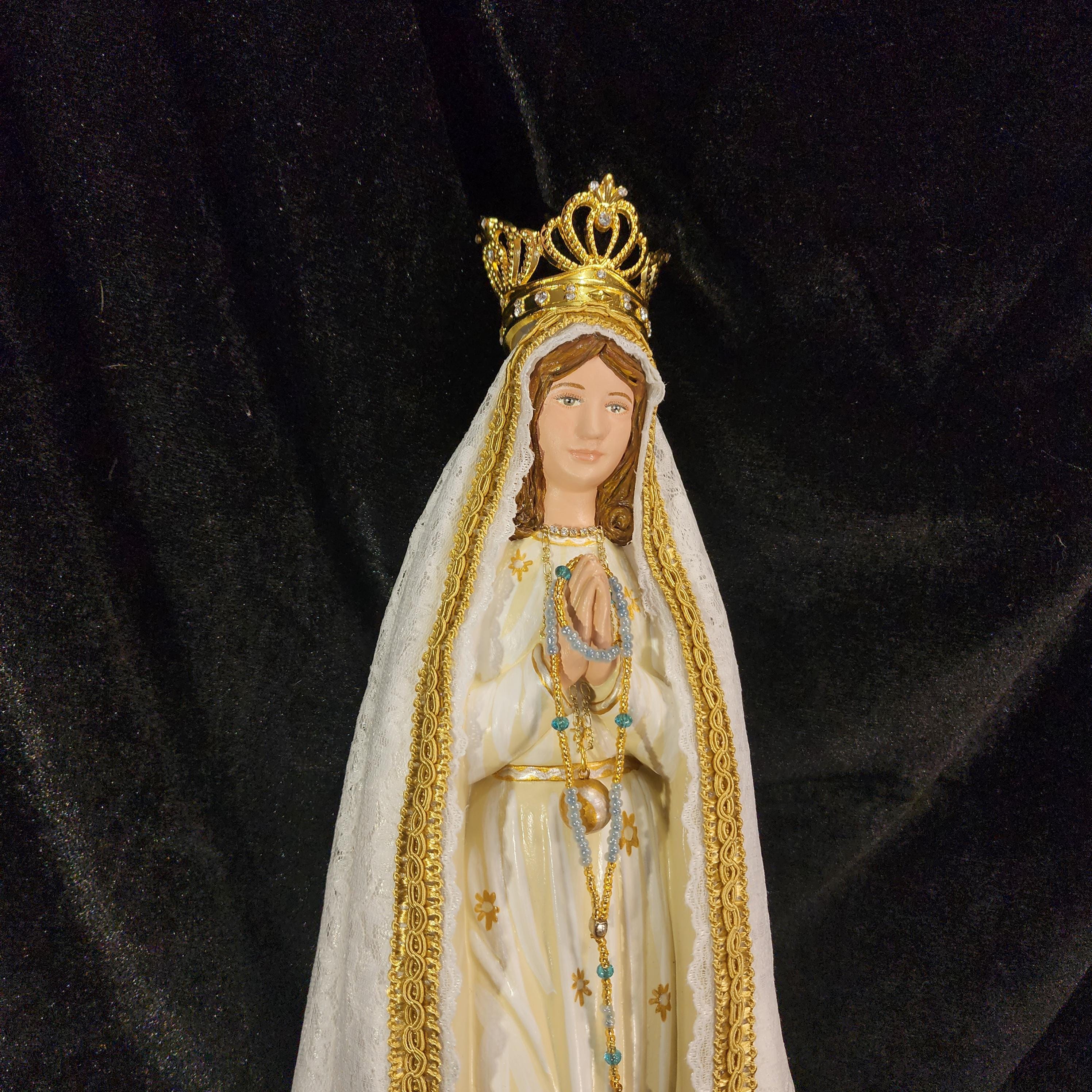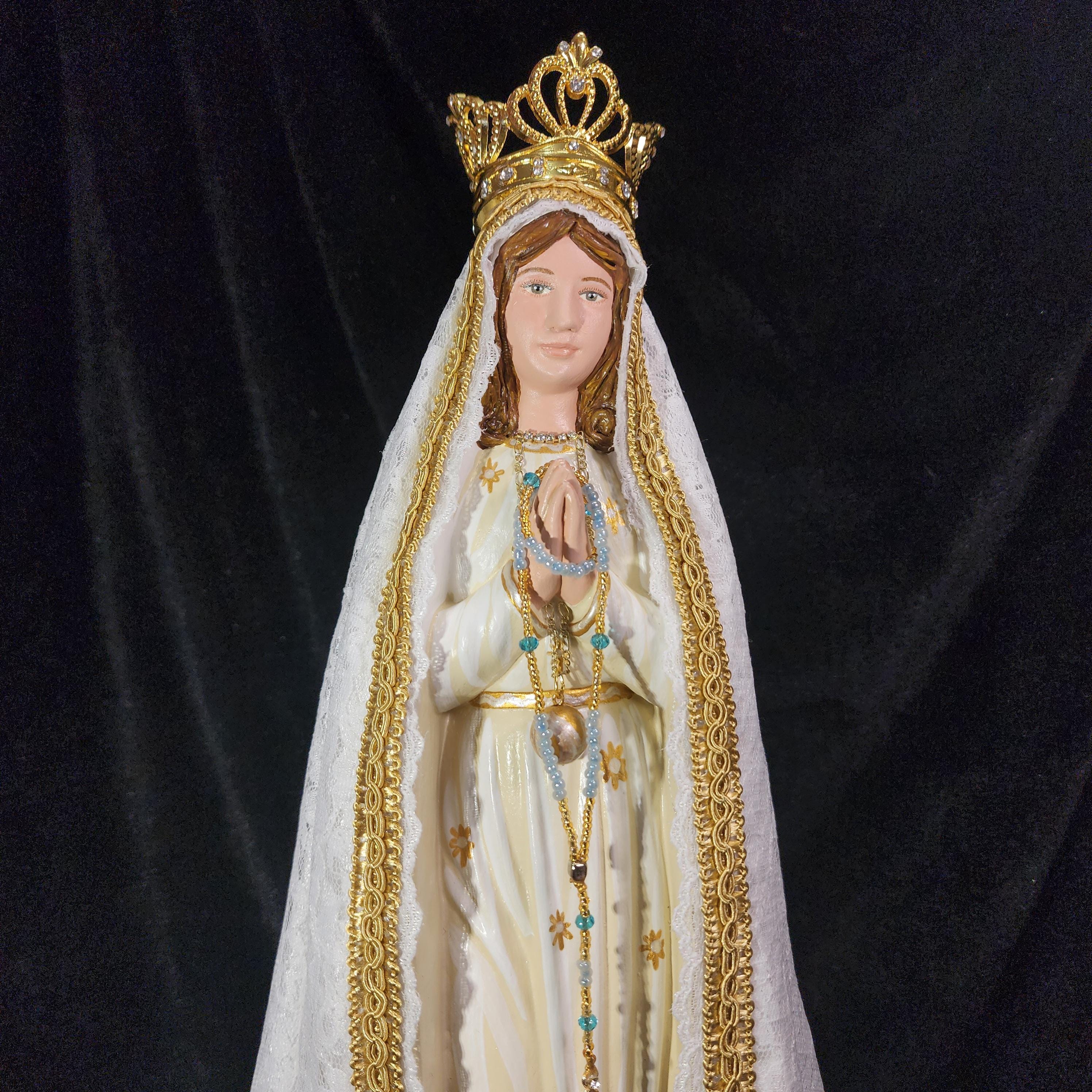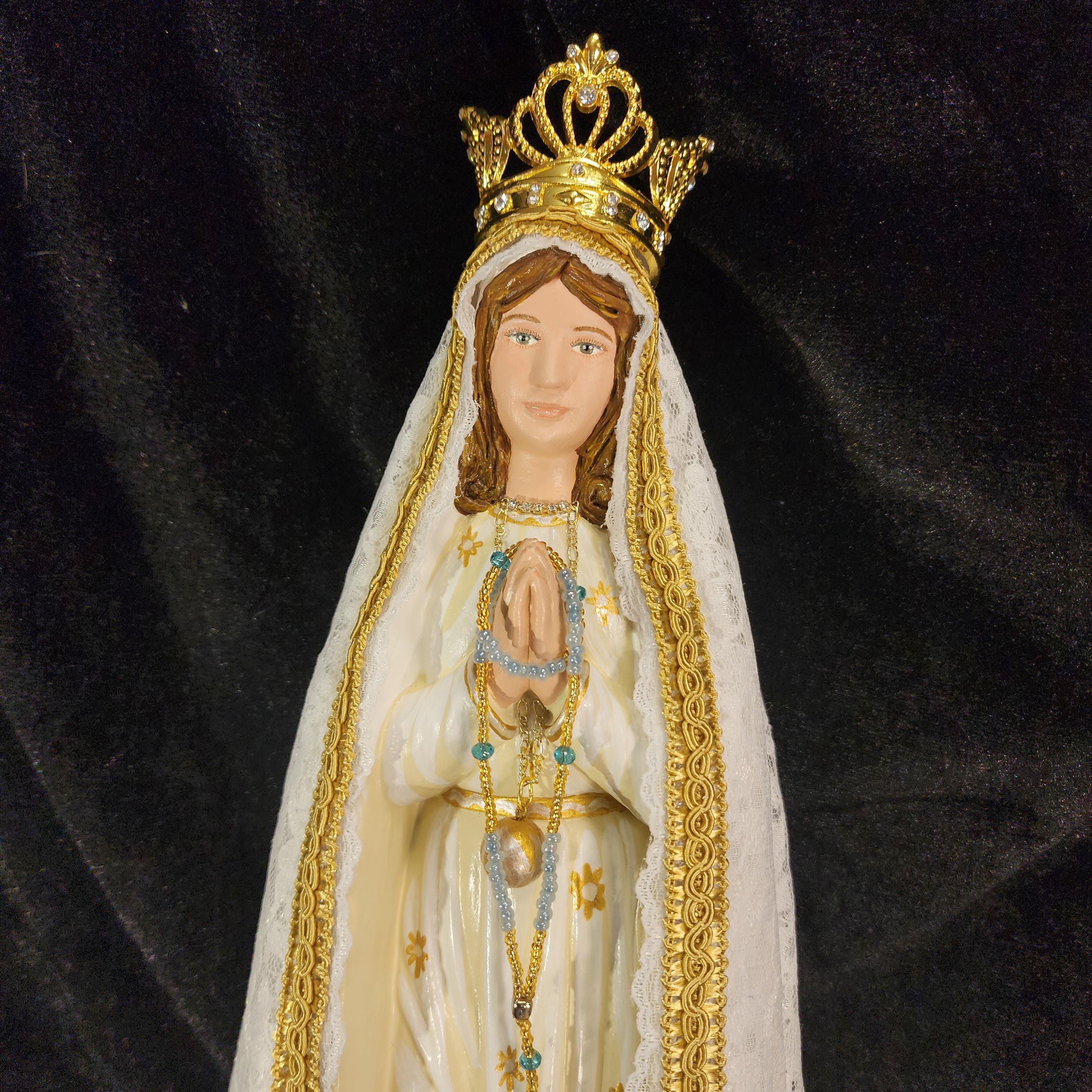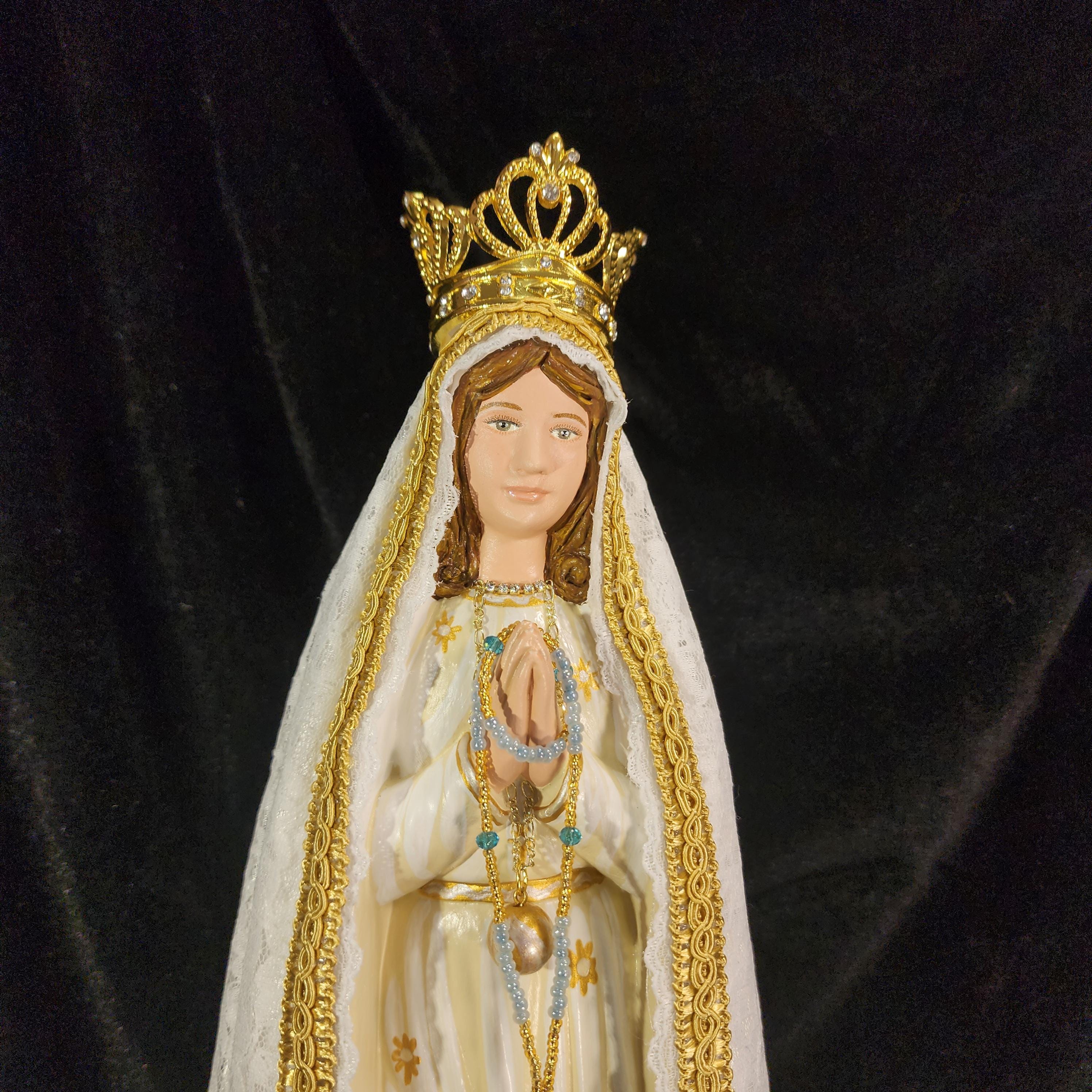 Now, anyone can have their own Pilgrim Virgin of Fatima like the ones carried in processions, except in smaller home-friendly sizes. This statue features a hand painted face, details such as fingernails and eyelashes, full length (head to foot) lace over satin style mantle with golden trim work, hand-made tiny rosary beads in her hands, gold queenship (open-top) jeweled crown and other accoutrements associated with Our Lady of Fatima.