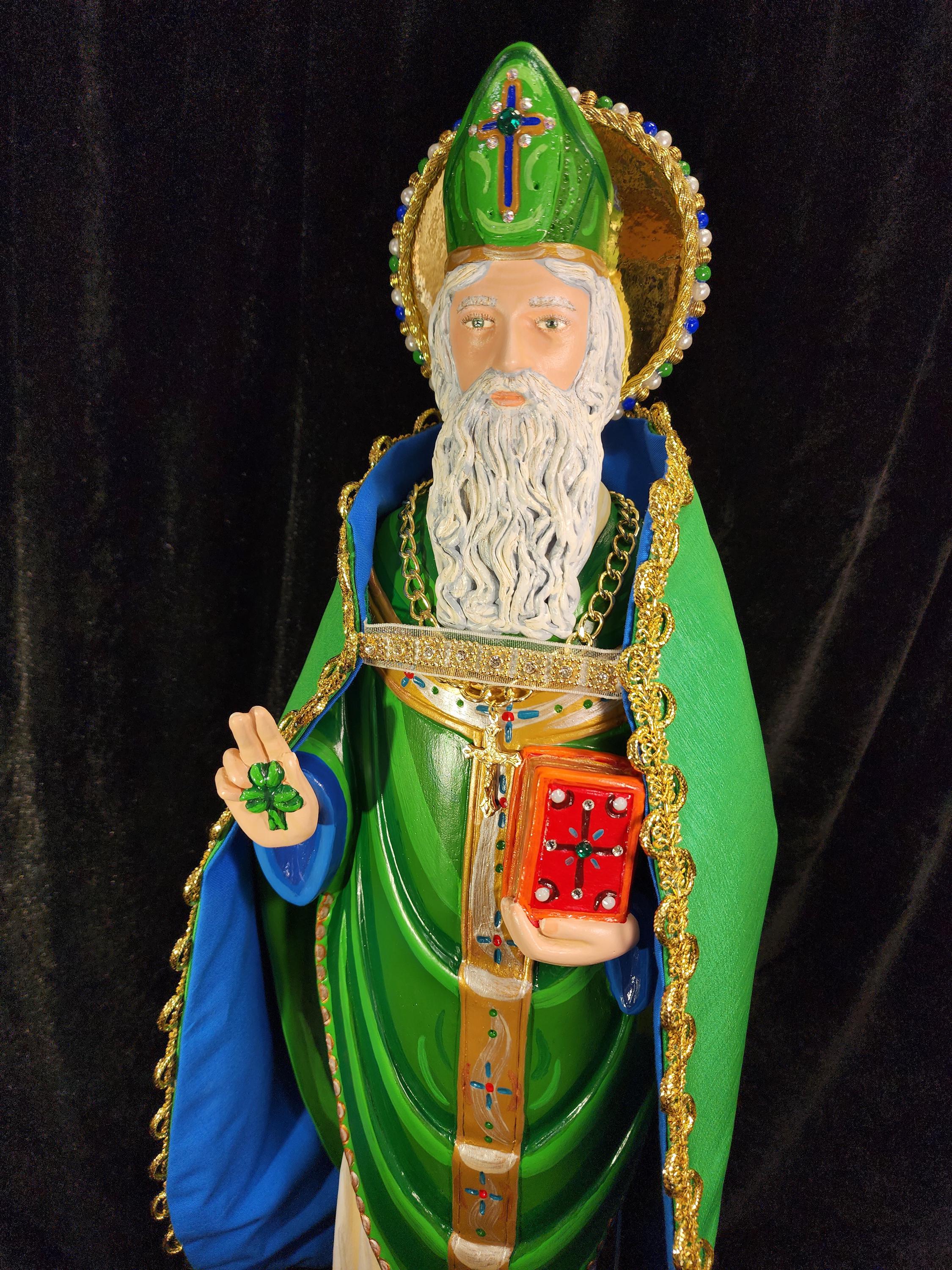 This 25" adorned statue features a mature hand painted face, chain necklace with crucifix, handmade blue & green cloak/cape with gold trim and golden beaded halo. St. Patrick holds the book of his missionary life and conversion and his bishop’s crosier in one hand and offering a blessing (while holding a clover) in the other.