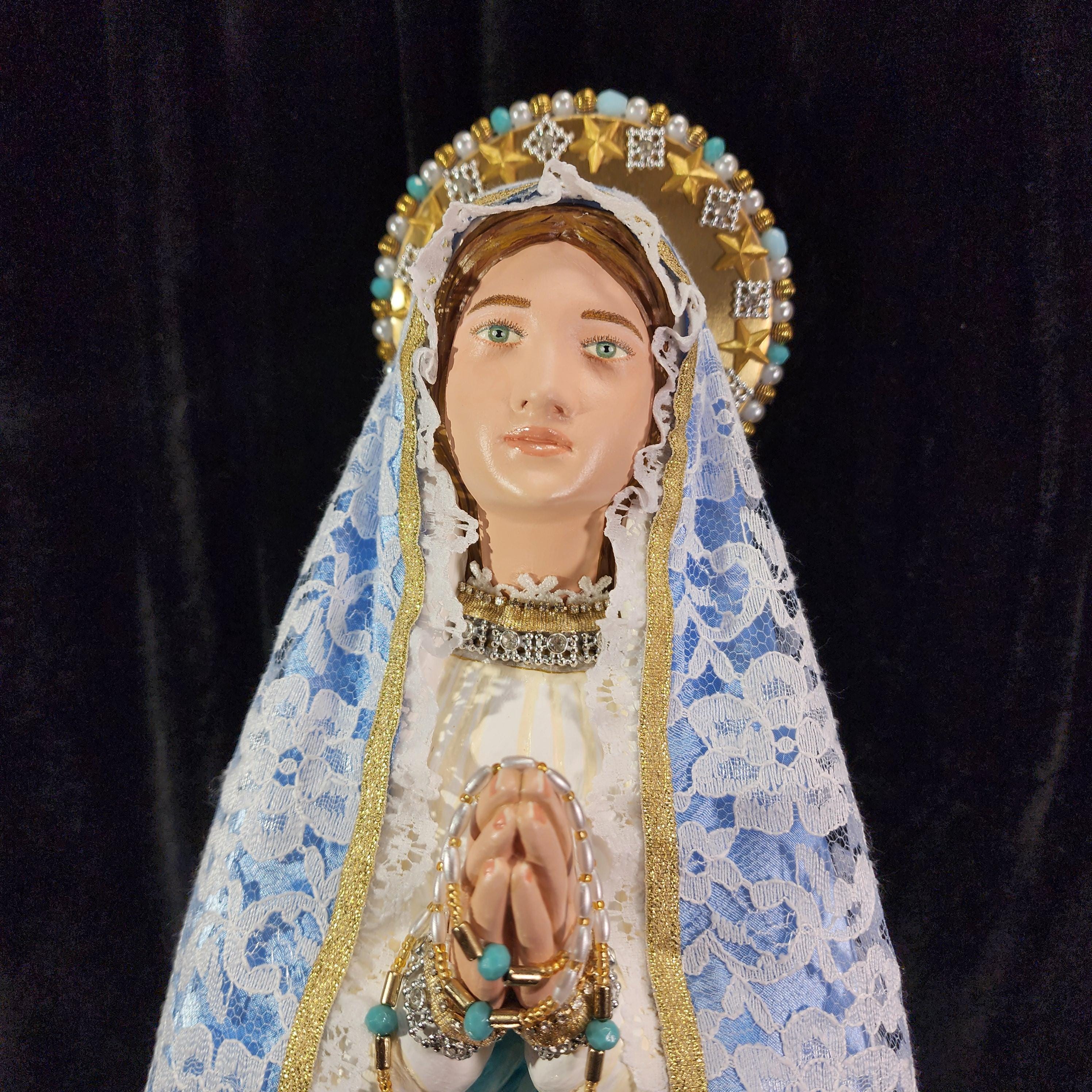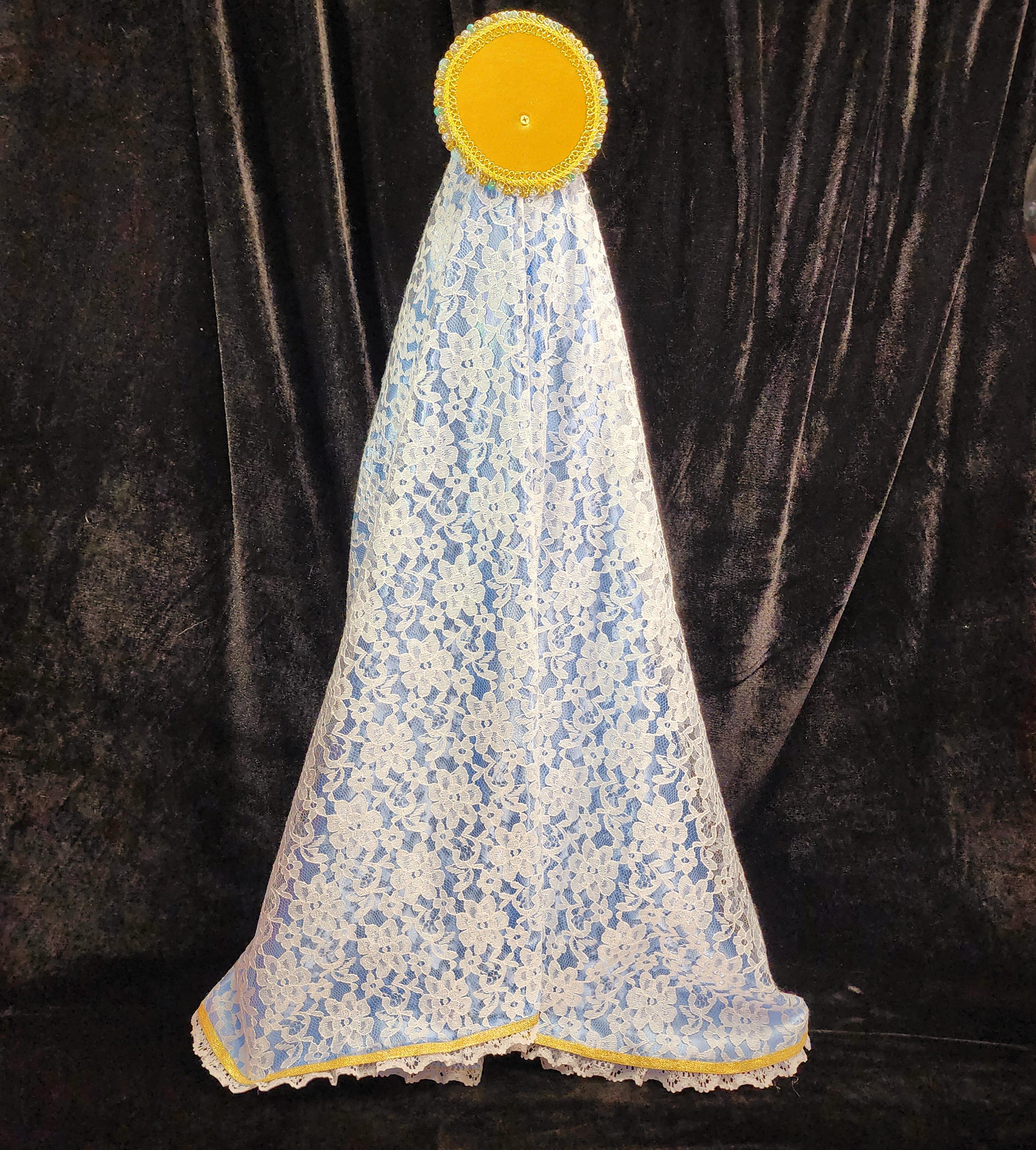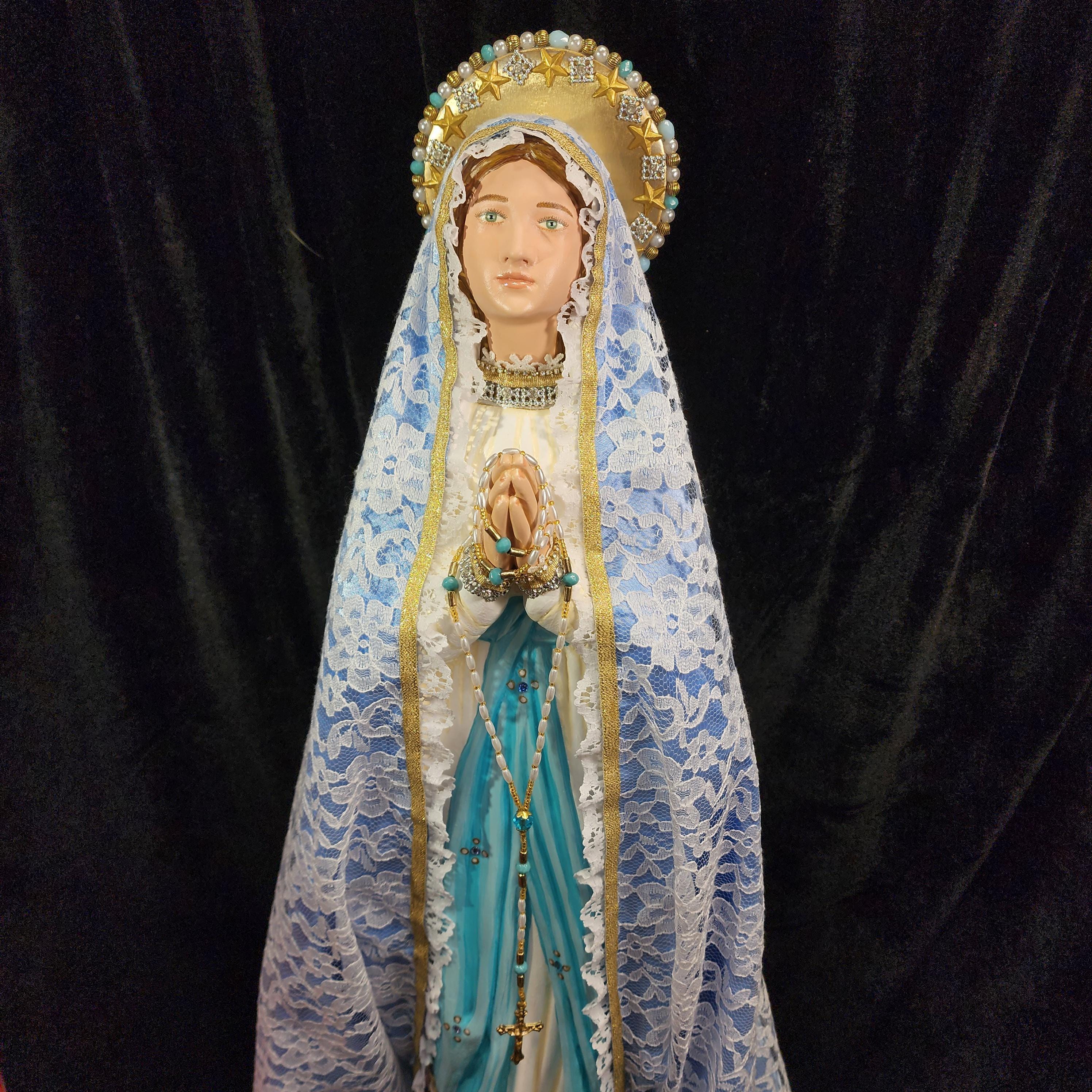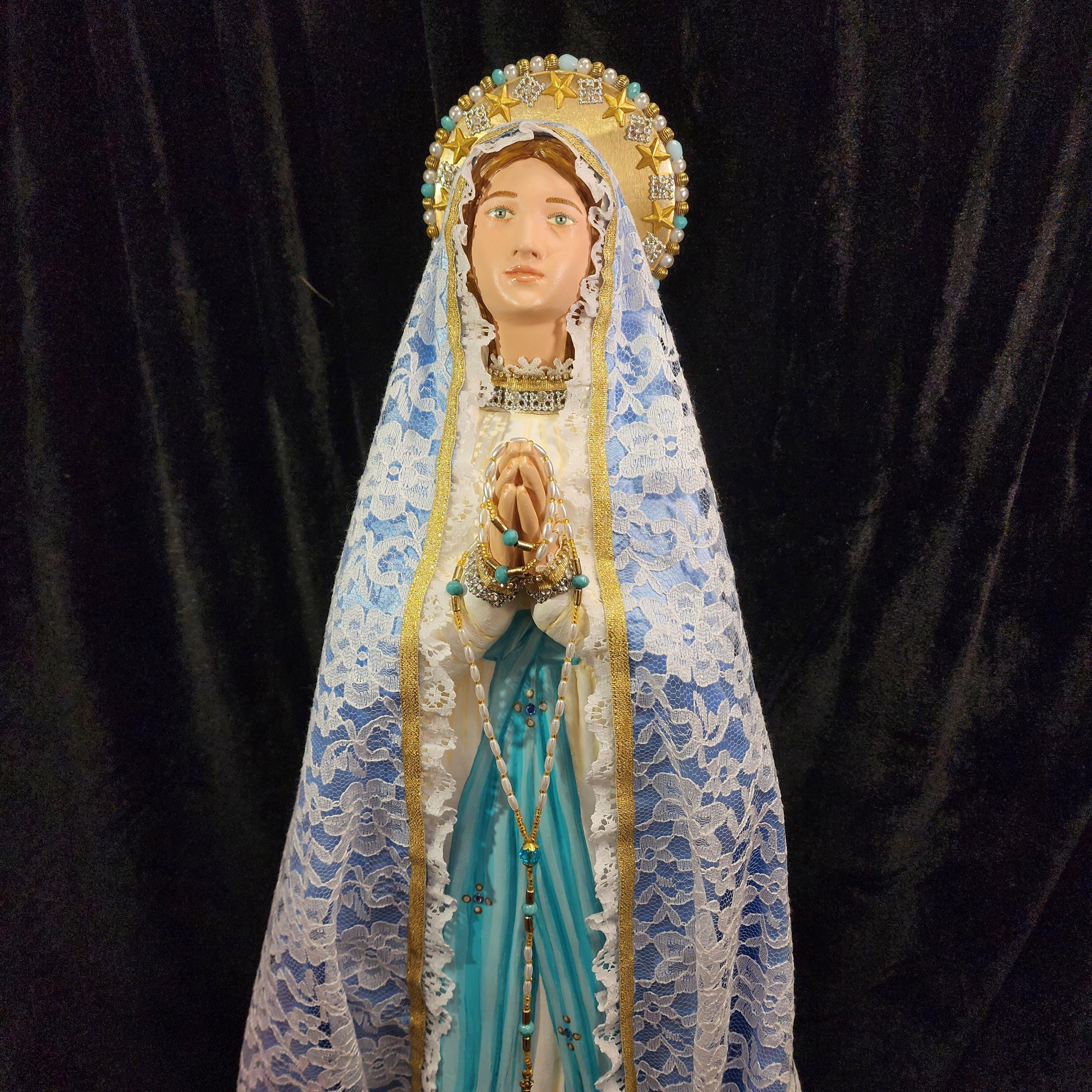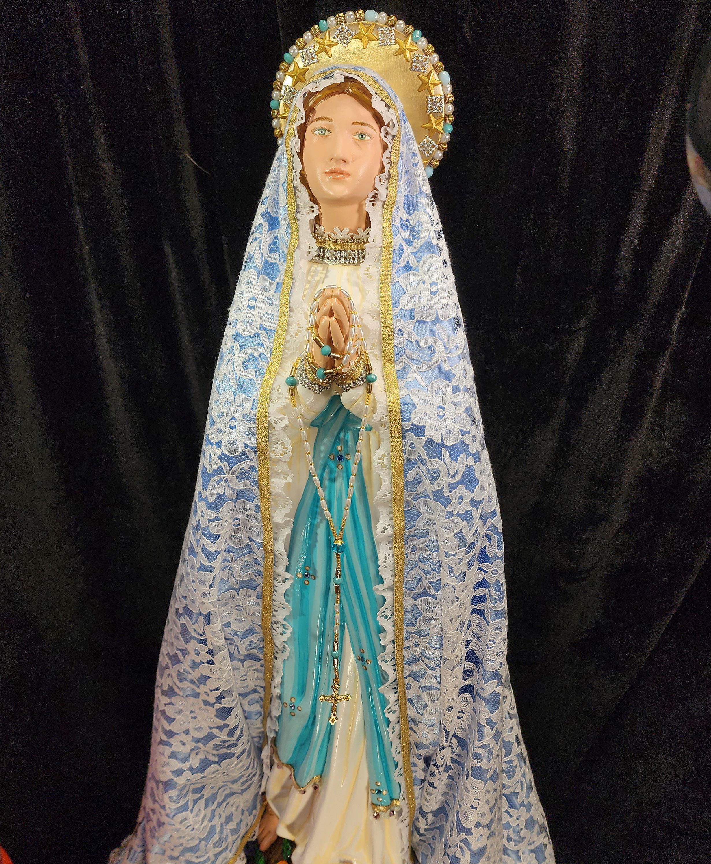 This beautiful/glorified 28" tall statue features a full length (head to foot) white lace over light blue satin mantle, hand-made tiny rosary in hands, bejeweled/beaded halo and cloth flowers.
