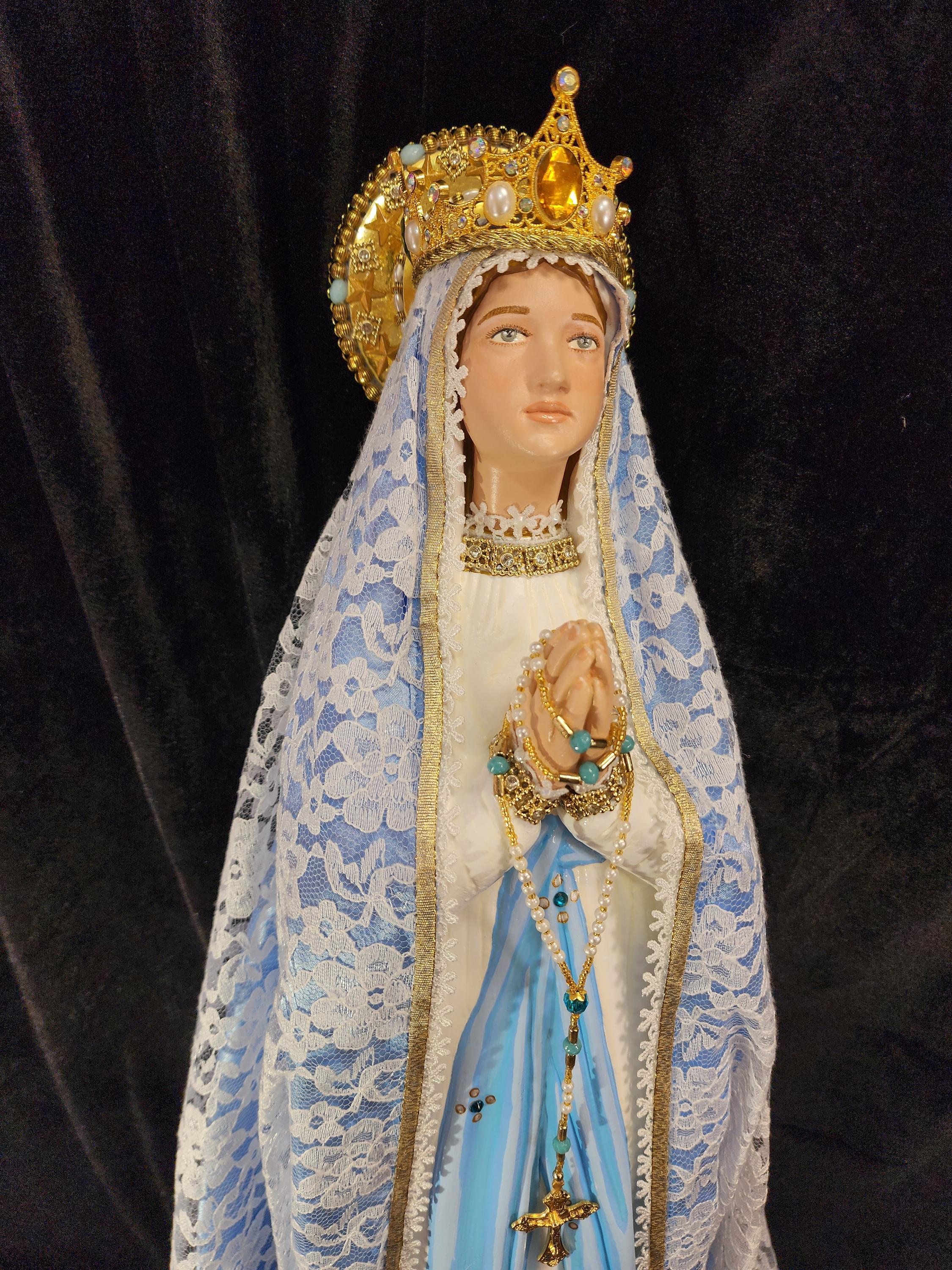 This beautiful/glorified 28" tall statue features a full length (head to foot) white lace over light blue satin mantle, hand-made tiny rosary in hands, jeweled crown, bejeweled/beaded halo and cloth flowers.