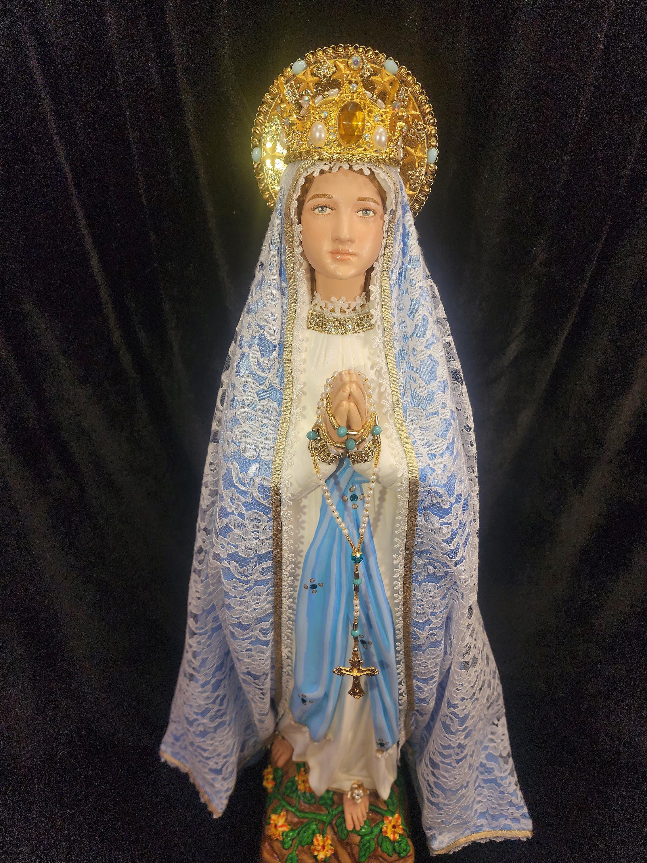 This beautiful/glorified 28" tall statue features a full length (head to foot) white lace over light blue satin mantle, hand-made tiny rosary in hands, jeweled crown, bejeweled/beaded halo and cloth flowers.