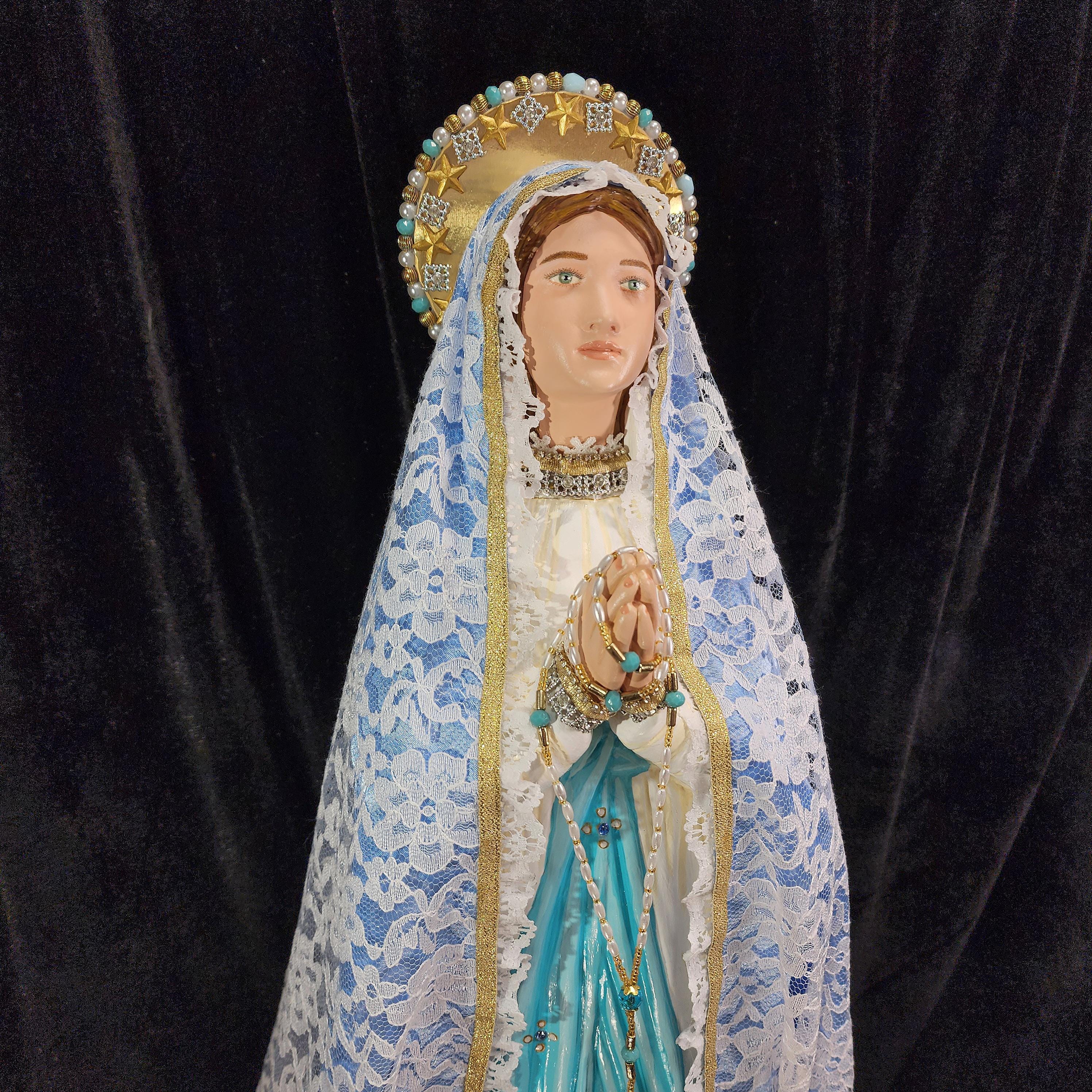 This beautiful/glorified 28" tall statue features a full length (head to foot) white lace over light blue satin mantle, hand-made tiny rosary in hands, bejeweled/beaded halo and cloth flowers.